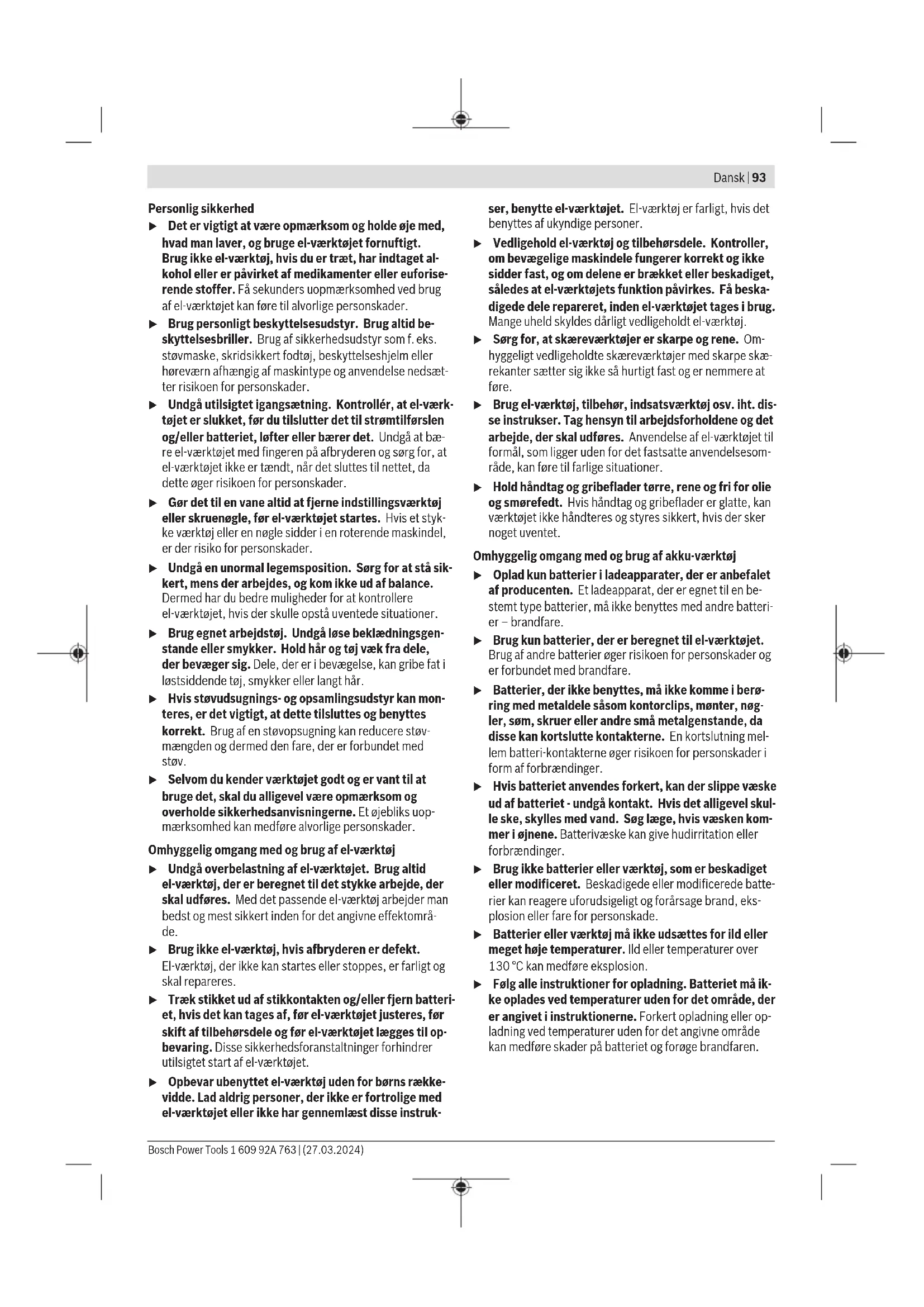 Konstantelektronikken holder omdrejningstallet stort set konstant ved tomgang og belastning og sikrer en ensartet ar- bejdsydelse. Montering Montering af beskyttelsesanordning u Tag altid akkuen ud af el‑værktøjet, før der arbejdes på el‑værktøjet (f.eks. vedligeholdelse, værktøjsskift osv.) samt før det transporteres og lægges til opbeva- ring. Utilsigtet aktivering af start-stop-kontakten er for- bundet med kvæstelsesfare. u Træk stikket ud af stikkontakten, før der udføres ar- bejde på el‑værktøjet. Bemærk: Efter brud på slibeskiven under arbejdet eller be- skadigelse af holdeanordningerne på beskyttelseskappen/ el-værktøjet skal el-værktøjet omgående sendes til et autori- seret værksted, adresser se afsnittet "Kundeservice og anvendelsesrådgivning". Beskyttelsesskærm til slibning Læg beskyttelseskappen (7) på hol- deren på el-værktøjet, til beskyttelses- kappens kodeknaster stemmer overens med holderen. Tryk og hold herunder frigøringsarmen (1). Tryk beskyttelseskappen (7) på spin- delhalsen, til beskyttelseskappens krave sidder på el-værktøjets flange, og drej beskyttelseskappen, til den ty- deligt hørbart går i indgreb. Tilpas beskyttelseskappens (7) posi- tion til arbejdsgangens krav. Tryk hertil frigøringsarmen (1) opad, og drej beskyttelseskappen (7) i den ønskede posi- tion. u Indstil altid beskyttelsesskærmen(7), så begge kna- ster til frigøringsarmen(1) når ind i de tilsvarende ud- sparinger i beskyttelsesskærmen (7). u Indstil beskyttelsesskærmen (7) , så betjeningsperso- nen ikke udsættes for gnistregn. u I tilbehørets drejeretningen må beskyttelsesskærmen(7) kun kunne drejes ved akti- vering af frigøringsarmen(1) ! Ellers skal el‑værktøjet tages ud af brug og sendes til et autoriseret service- værksted. Bemærk: Kodeknasterne på beskyttelsesskærmen (7) sik- rer, at der kun kan monteres en beskyttelsesskærm, som passer til el-værktøjet. Opsugningskappe til slibning Til støvsvag slibning af maling, lak og kunststof i forbindelse med hårdmetalkopskiver(11) kan du anvende udsugningsskærmen(6). Udsugningsskærmen(6) er ikke beregnet til bearbejdning af metal. Udsugningsskærmen(6) kan forbindes med en egnet Bosch- støvsuger. Sæt i den forbindelse sugeslangen med udsug- ningsadapteren ind i holdestudserne på udsugningsskær- men. Beskyttelsesskærm til skæring u Brug altid beskyttelsesskærmen til skæring ved skæ- ringsarbejde (8) eller beskyttelsesskærmen til slib- ning (7) sammen med afdækningen til skæring (9). u Sørg for tilstrækkelig støvopsugning, når der skæres i sten. Beskyttelsesskærmen til skæring(8) monteres på samme måde som beskyttelsesskærmen til slibning(7). 1 609 92A 763 | (27.03.2024) Bosch Power ToolsDansk | 99 Metalafdækning i metal til skæring Monter metalafdækningen til skæring (9) på beskyttelses- skærmen til slibning (7) (se billedet A): Sving holdebøjlen tilbage (➊). Sæt afdækningen (9) på beskyttelsesskærmen til slibning (7) (➋). Tryk holdebøjlen fast på beskyttelses- skærmen (7) (➌). Ved afmontering (se billedet B) skal du trykke på knappen på holdebøjlen (➊) og svinge den tilbage (➋). Træk afdæknin- gen (9) af beskyttelsesskærmen (7) (➌). Plastafdækning til skæring Sæt plastafdækningen til skæring(9) på beskyttelsesskær- men til slibning(7) (se billedetC). Afdækningen(9) går hør- bart og synligt i indgreb på beskyttelsesskærmen(7). Ved afmontering (se billedetD) skal du låse afdækningen(9) på beskyttelsesafskærmningen(7) (➊) til venstre eller højre op og trække afdækningen af (➋). Udsugningsskærm til skæring med føringsslæde Udsugningsskærm til skæring med føringsslæde(30) mon- teres ligesom beskyttelsesskærmen til slibning. Når ekstrahåndtaget (5)/(4) fastgøres på gearhuset ved hjælp af bøjlen på udsugningsskærmen, fastgøres el-værktø- jet sikkert med udsugningsskærmen. På udsugningsskær- men med føringsslidser (30) kan der monteres en egnet Bosch-støvsuger. Sæt i den forbindelse sugeslangen med udsugningsadapteren ind i holdestudserne på udsugnings- skærmen. Bemærk! Friktion forårsaget af støvet i sugeslangen og i til- behøret under sugning skaber en elektrostatisk ladning, som brugeren kan opfatte som en statisk udladning (afhængigt af miljøfaktorer og brugerens fysiologiske tilstand). Bosch an- befaler generelt at anvende antistatiske sugeslanger (tilbe- hør) til opsugning af fint støv og tørre materialer. Håndbeskyttelse u Ved arbejde med gummislibeskiven(23) eller med kopbørste/konusbørste/diamant-borekrone skal du altid montere håndbeskyttelsen (22). Fastgør håndbeskyttelsen (22) med ekstrahåndtaget (5)/ (4). Standardekstrahåndtag/vibrationsdæmpende ekstrahåndtag Skru ekstrahåndtaget (5)/(4) ind i gearhovedet på højre el- ler venstre side, afhængigt af hvilket arbejde der skal ud- føres. u Brug kun dit el-værktøj med ekstrahåndtaget (5)/(4). u Brug ikke el-værktøjet, hvis ekstrahåndtaget (5)/(4) er beskadiget. Foretag ikke ændringer på ekstrahånd- taget (5)/(4). Det vibrationsdæmpende ekstrahånd- tag (4) giver vibrationssvagt og der- med behageligt og sikkert arbejde. Montering af slibeværktøj u Tag altid akkuen ud af el‑værktøjet, før der arbejdes på el‑værktøjet (f.eks. vedligeholdelse, værktøjsskift osv.) samt før det transporteres og lægges til opbeva- ring. Utilsigtet aktivering af start-stop-kontakten er for- bundet med kvæstelsesfare. u Træk stikket ud af stikkontakten, før der udføres ar- bejde på el‑værktøjet. u Rør ikke ved slibe- og skæreskiverne, før de er kølet af. Skiverne bliver meget varmt under arbejdet. Rengør slibespindlen (21) og alle dele, der skal monteres. Tryk på spindellåsetasten (2) for at låse slibespindlen ved fastspænding og frigørelse af slibeværktøjerne. u Aktivér kun spindellåsetasten, når slibespindlen står stille. Ellers kan el‑værktøjet blive beskadiget. Slibe-
