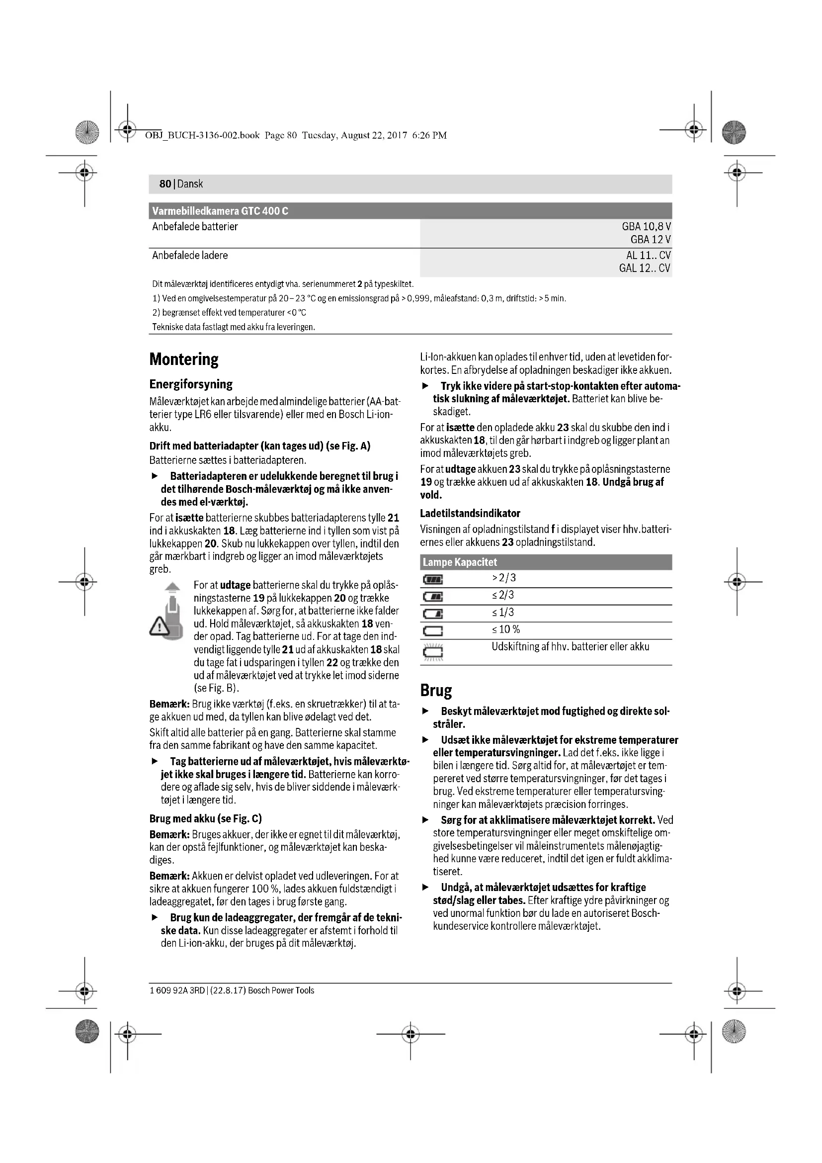 Tekniske data fastlagt med akku fra leveringen. OBJ_BUCH-3136-002.book Page 79 Tuesday, August 22, 2017 6:26 PM80 | Dansk 1 609 92A 3RD | (22.8.17) Bosch Power Tools Montering Energiforsyning Måleværktøjet kan arbejde med almindelige batterier (AA-bat- terier type LR6 eller tilsvarende) eller med en Bosch Li-ion- akku. Drift med batteriadapter (kan tages ud) (se Fig. A) Batterierne sættes i batteriadapteren. Batteriadapteren er udelukkende beregnet til brug i det tilhørende Bosch-måleværktøj og må ikke anven- des med el-værktøj. For at isætte batterierne skubbes batteriadapterens tylle 21 ind i akkuskakten 18. Læg batterierne ind i tyllen som vist på lukkekappen 20. Skub nu lukkekappen over tyllen, indtil den går mærkbart i indgreb og ligger an imod måleværktøjets greb. For at udtage batterierne skal du trykke på oplås- ningstasterne 19 på lukkekappen 20 og trække lukkekappen af. Sørg for, at batterierne ikke falder ud. Hold måleværktøjet, så akkuskakten 18 ven- der opad. Tag batterierne ud. For at tage den ind- vendigt liggende tylle 21 ud af akkuskakten 18 skal du tage fat i udsparingen i tyllen 22 og trække den ud af måleværktøjet ved at trykke let imod siderne (se Fig. B). Bemærk: Brug ikke værktøj (f.eks. en skruetrækker) til at ta- ge akkuen ud med, da tyllen kan blive ødelagt ved det. Skift altid alle batterier på en gang. Batterierne skal stamme fra den samme fabrikant og have den samme kapacitet. Tag batterierne ud af måleværktøjet, hvis måleværktø- jet ikke skal bruges i længere tid. Batterierne kan korro- dere og aflade sig selv, hvis de bliver siddende i måleværk- tøjet i længere tid. Brug med akku (se Fig. C) Bemærk: Bruges akkuer, der ikke er egnet til dit måleværktøj, kan der opstå fejlfunktioner, og måleværktøjet kan beska- diges. Bemærk: Akkuen er delvist opladet ved udleveringen. For at sikre at akkuen fungerer 100 %, lades akkuen fuldstændigt i ladeaggregatet, før den tages i brug første gang. Brug kun de ladeaggregater, der fremgår af de tekni- ske data. Kun disse ladeaggregater er afstemt i forhold til den Li-ion-akku, der bruges på dit måleværktøj. Li-Ion-akkuen kan oplades til enhver tid, uden at levetiden for- kortes. En afbrydelse af opladningen beskadiger ikke akkuen. Tryk ikke videre på start-stop-kontakten efter automa- tisk slukning af måleværktøjet. Batteriet kan blive be- skadiget. For at isætte den opladede akku 23 skal du skubbe den ind i akkuskakten 18, til den går hørbart i indgreb og ligger plant an imod måleværktøjets greb. For at udtage akkuen 23 skal du trykke på oplåsningstasterne 19 og trække akkuen ud af akkuskakten 18. Undgå brug af vold. Ladetilstandsindikator Visningen af opladningstilstand f i displayet viser hhv.batteri- ernes eller akkuens 23 opladningstilstand. Brug Beskyt måleværktøjet mod fugtighed og direkte sol- stråler. Udsæt ikke måleværktøjet for ekstreme temperaturer eller temperatursvingninger. Lad det f.eks. ikke ligge i bilen i længere tid. Sørg altid for, at måleværtøjet er tem- pereret ved større temperatursvingninger, før det tages i brug. Ved ekstreme temperaturer eller temperatursving- ninger kan måleværktøjets præcision forringes. Sørg for at akklimatisere måleværktøjet korrekt. Ved store temperatursvingninger eller meget omskiftelige om- givelsesbetingelser vil måleinstrumentets målenøjagtig- hed kunne være reduceret, indtil det igen er fuldt akklima- tiseret. Undgå, at måleværktøjet udsættes for kraftige stød/slag eller tabes. Efter kraftige ydre påvirkninger og ved unormal funktion bør du lade en autoriseret Bosch- kundeservice kontrollere måleværktøjet. Anbefalede batterier GBA 10,8 V GBA 12 V Anbefalede ladere AL 11.. CV GAL 12.. CV Varmebilledkamera GTC 400 C Dit måleværktøj identificeres entydigt vha. serienummeret 2 på typeskiltet.