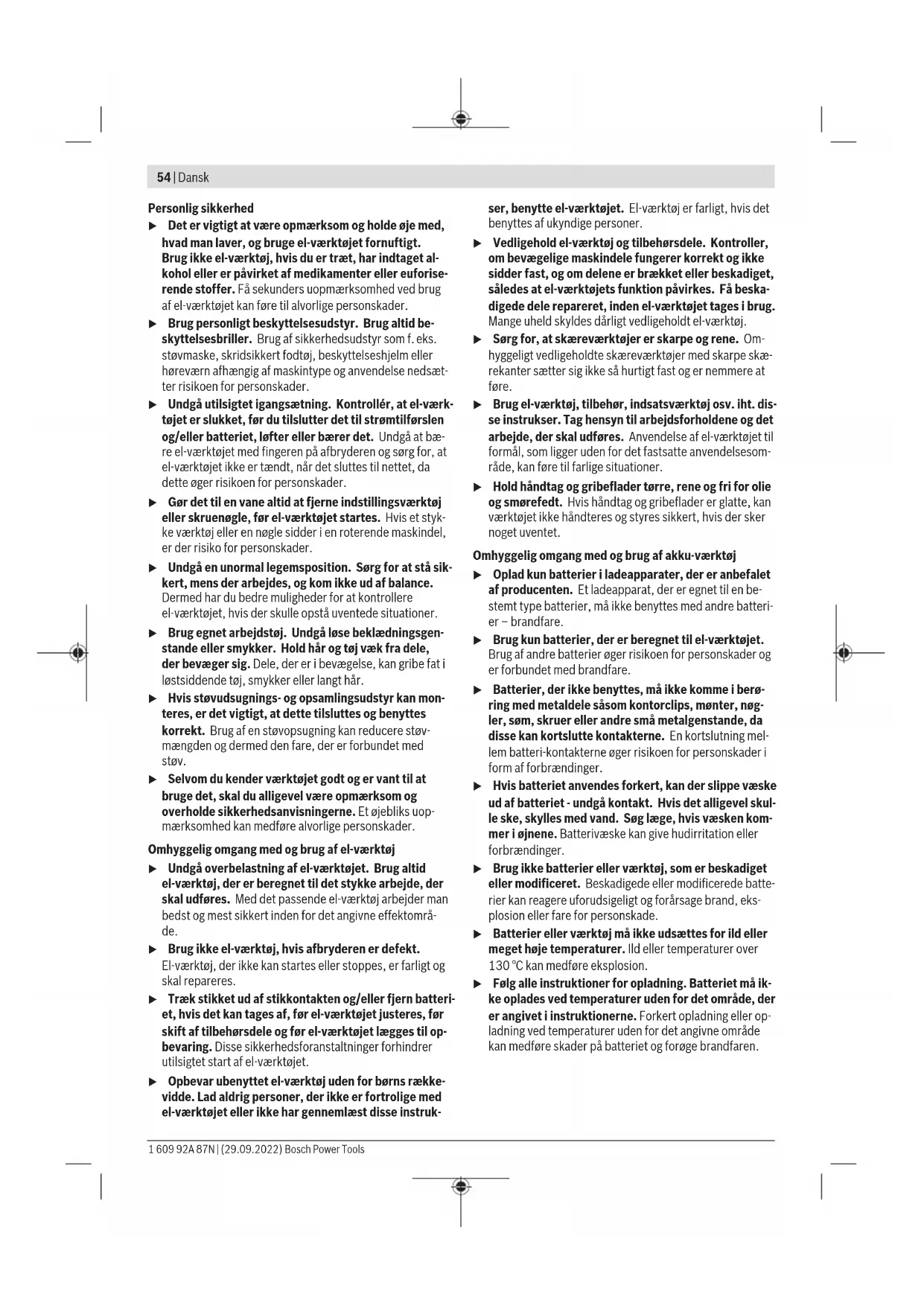 – 1,5 Det svingningsniveau og støjemissionsniveau, der fremgår af anvisningerne, er målt iht. en standardiseret måleværdi og kan anvendes til sammenligning af elværktøj med hinanden. De er også egnet til en foreløbig vurdering af svingnings- og støjemissionen. Det angivne svingnings- og støjemissionsniveau repræsente- rer de væsentlige anvendelser af el‑værktøjet. Hvis el‑værk- tøjet dog anvendes til andre formål, med afvigende indsats- værktøj eller utilstrækkelig vedligeholdelse, kan svingnings- og støjemissionsniveauet afvige. Dette kan føre til en betyde- 1 609 92A 87N | (29.09.2022) Bosch Power ToolsDansk | 57 lig forøgelse af svingnings- og støjemissionen i hele arbejds- tidsrummet. Til en nøjagtig vurdering af svingnings- og støjemissionen bør der også tages højde for de tider, i hvilke værktøjet er sluk- ket eller godt nok kører, men rent faktisk ikke anvendes. Det- te kan føre til en betydelig reduktion af svingnings- og støje- missionsniveauet i hele arbejdstidsrummet. Fastlæg ekstra sikkerhedsforanstaltninger til beskyttelse af brugeren mod svingningers virkning som f.eks.: Vedligehol- delse af el‑værktøj og indsatsværktøj, holde hænder varme, organisation af arbejdsforløb. Montering u Tag altid akkuen ud af el‑værktøjet, før der arbejdes på el‑værktøjet (f.eks. vedligeholdelse, værktøjsskift osv.) samt før det transporteres og lægges til opbeva- ring. Utilsigtet aktivering af start-stop-kontakten er for- bundet med kvæstelsesfare. Opladning af akku Bemærk: Akkuen leveres delvis opladet. For at sikre, at ak- kuen fungerer 100%, oplades akkuen helt før første ibrug- tagning. Li-ion-akkuen kan oplades til enhver tid, uden at levetiden forkortes. En afbrydelse af opladningen beskadiger ikke ak- kuen. Lithium-ion-batteriet er beskyttet mod dybafladning via "Electronic Cell Protection (ECP)" (elektronisk cellebeskyt- telse). Er akkuen afladet, slukkes el-værktøjet med en be- skyttelseskontakt: Indsatsværktøjet bevæger sig ikke mere. u Tryk ikke videre på start-stop-kontakten efter auto- matisk slukning af el‑værktøjet. Batteriet kan blive be- skadiget. u Brug kun de ladeaggregater, der fremgår af de tekni- ske data. Kun disse ladeaggregater er afstemt i forhold til den lithium-ion-akku, der bruges på dit el-værktøj. Udtagning af akku Akkuen (7) har to låsetrin, der forhindrer, at akkuen falder ud, hvis man skulle komme til at trykke på akku-udløserknap- pen (8) ved et uheld. Så længe akkuen sidder i el-værktøjet, holdes den i position af en fjeder. Akkuen (7) tages ud ved at trykke på udløserknappen (8) og trække akkuen sideværts ud af el-værktøjet. Undgå brug af vold. Akku-ladetilstandsindikator De grønne lysdioder på akku-ladetilstandsindikatoren viser akkuens ladetilstand. Af sikkerhedsgrunde er det kun muligt at forespørge om ladetilstanden, når el-værktøjet er stands- et. Tryk på tasten til ladetilstandsindikatoren eller for at få vist ladetilstanden. Dette er også muligt, når akkuen er taget ud. Hvis ingen lysdioder lyser efter tryk på tasten til ladetilstand- sindikatoren, er akkuen defekt og skal udskiftes. Akku-type GBA 18V... Lysdioder Kapacitet Konstant lys 3× grøn 60−100% Konstant lys 2× grøn 30−60% Konstant lys 1× grøn 5−30% Blinkende lys 1× grøn 0−5% Akku-type ProCORE18V... Lysdioder Kapacitet Konstant lys 5× grøn 80–100 % Konstant lys 4× grøn 60–80 % Konstant lys 3× grøn 40–60 % Konstant lys 2× grøn 20–40 % Konstant lys 1× grøn 5–20 % Blinkende lys 1× grøn 0–5 % Værktøjsskift (se billedeA) u Tag altid akkuen ud af el‑værktøjet, før der arbejdes på el‑værktøjet (f.eks. vedligeholdelse, værktøjsskift osv.) samt før det transporteres og lægges til opbeva- ring. Utilsigtet aktivering af start-stop-kontakten er for- bundet med kvæstelsesfare. Åbn den selvspændende borepatron (2) ved at dreje i rota- tionsretning ➊, indtil værktøjet kan sættes i. Sæt værktøjet