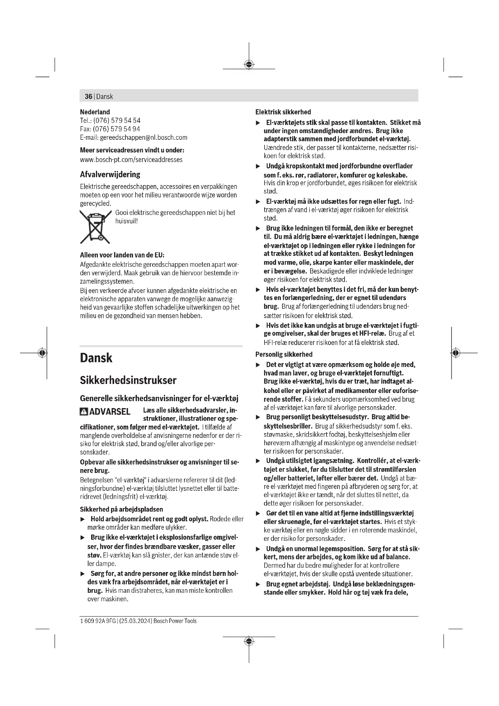 kg 5,8 Beskyttelsesklasse /II A) Vægt uden nettilslutningskabel og uden netstik Angivelserne gælder for en nominel spænding [U] på 230 V. Ved afvi- gende spændinger og i landespecifikke udførelser kan disse angivel- ser variere. Værdierne kan varierer afhængigt af produktet samt anvendelses- og miljøbetingelserne. Du kan finde flere oplysninger under www.bosch-professional.com/wac. Støj-/vibrationsinformation Støjemissionsværdier fundet iht. ENIEC62841-2-6. El-værktøjets A‑vægtede støjniveau er typisk: Lydtrykniveau 92dB(A); lydeffektniveau 100dB(A). Usikkerhed K=3dB. Brug høreværn! Vibrationer samlet værdi a
