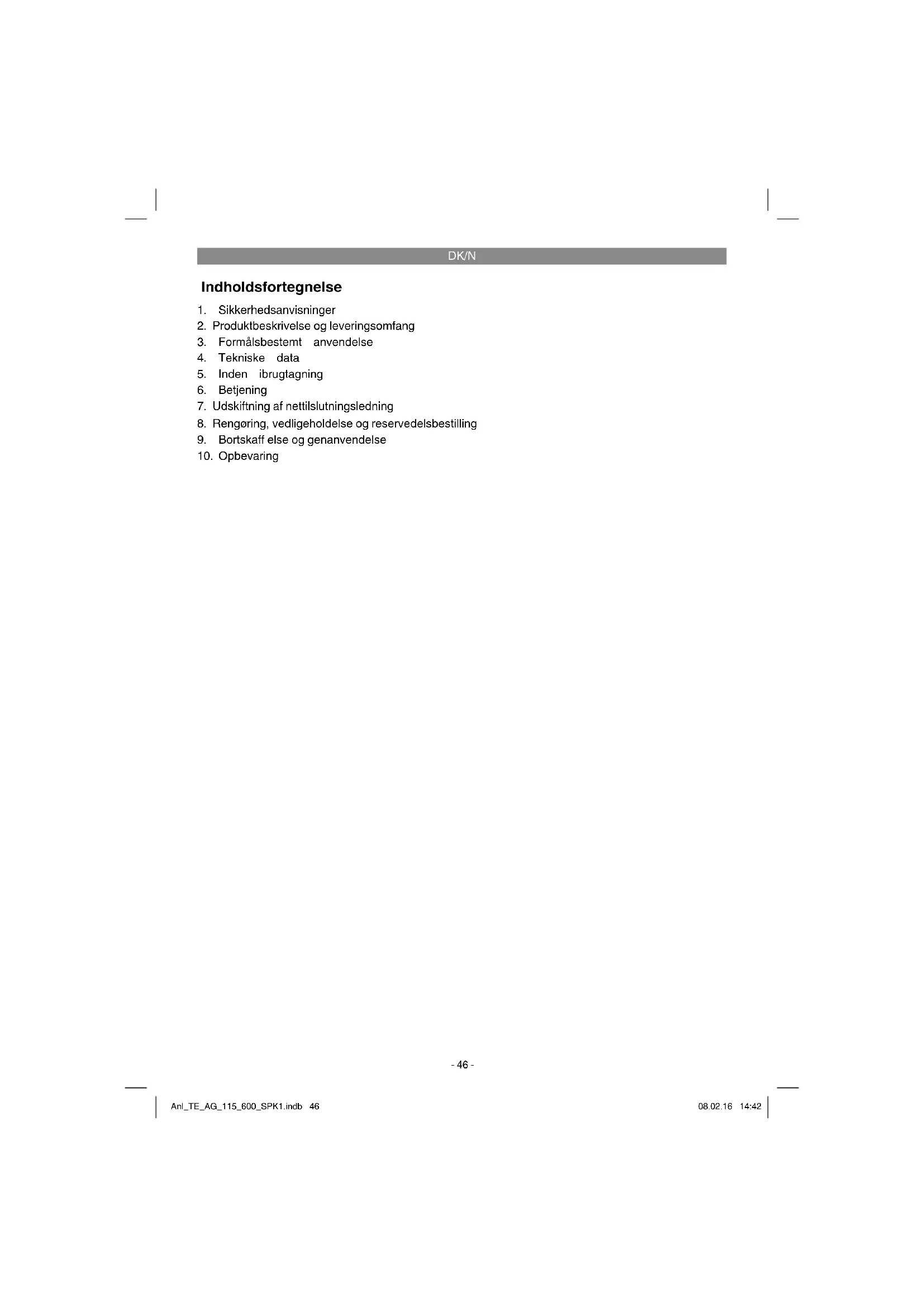 Kun for EU-lande Smid ikke el-værktøj ud som almindeligt husholdningsaff ald! I medfør af Rådets direktiv 2002/96/EF om aff ald af elektrisk og elektronisk udstyr og dettes omsættelse i den nationale lovgivning skal brugt el-værktøj indsamles separat og indleveres til videreanvendende formål på miljømæssig forsvarlig vis. Recycling-alternativ til tilbagesendelse: Ejeren af el-værktøjet er – med mindre denne tilbagesender maskinen – forpligtet til at bortskaff e mas- kinen og dens dele ifølge miljøforskrifterne. Den brugte maskine kan indleveres hos en genbrugsstation – spørg evt. personalet her, eller forhør dig hos din kommune. Tilbehør og hjælpemidler, som følger med maskinen, og som ikke indeholder elektriske dele, er ikke omfattet af ovenstående. Genoptryk eller anden kopiering af dokumentation og følgedokumenter til produkter, også i uddrag, er kun tilladt med udtrykkelig tilladelse fra iSC GmbH. Ret til tekniske ændringer forbeholdes Anl_TE_AG_115_600_SPK1.indb 53Anl_TE_AG_115_600_SPK1.indb 53 08.02.16 14:4208.02.16 14:42DK/N