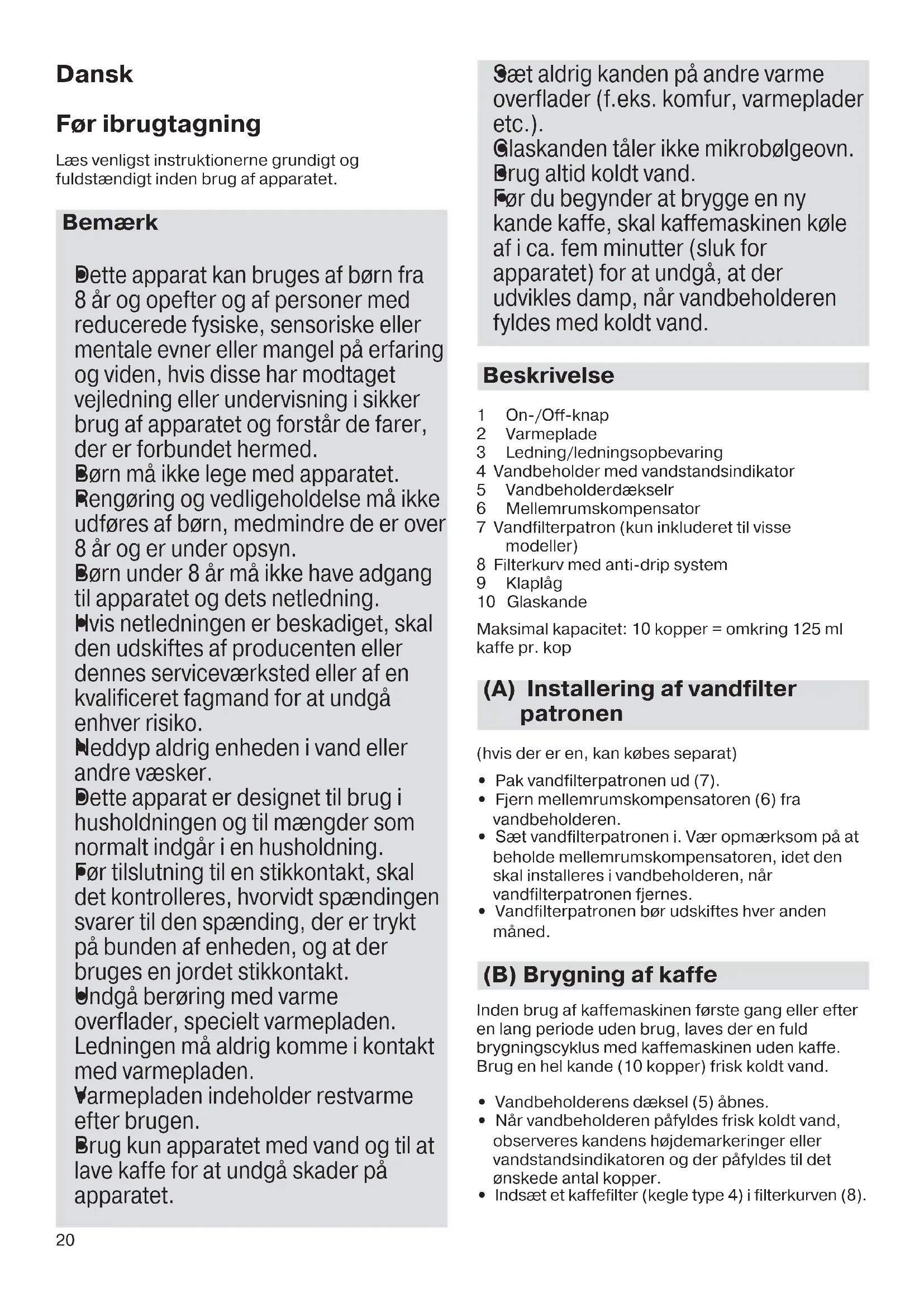 Før du begynder at brygge en ny kande kaffe, skal kaffemaskinen køle af i ca. fem minutter (sluk for apparatet) for at undgå, at der udvikles damp, når vandbeholderen fyldes med koldt vand. Beskrivelse 1 On-/Off-knap 2 Varmeplade 3 Ledning/ledningsopbevaring 4 Vandbeholder med vandstandsindikator 5 Vandbeholderdækselr 6 Mellemrumskompensator 7 Vandfilterpatron (kun inkluderet til visse modeller) 8 Filterkurv med anti-drip system 9 Klaplåg 10 Glaskande Maksimal kapacitet: 10 kopper = omkring 125 ml kaffe pr. kop (A) Installering af vandfilter patronen (hvis der er en, kan købes separat)