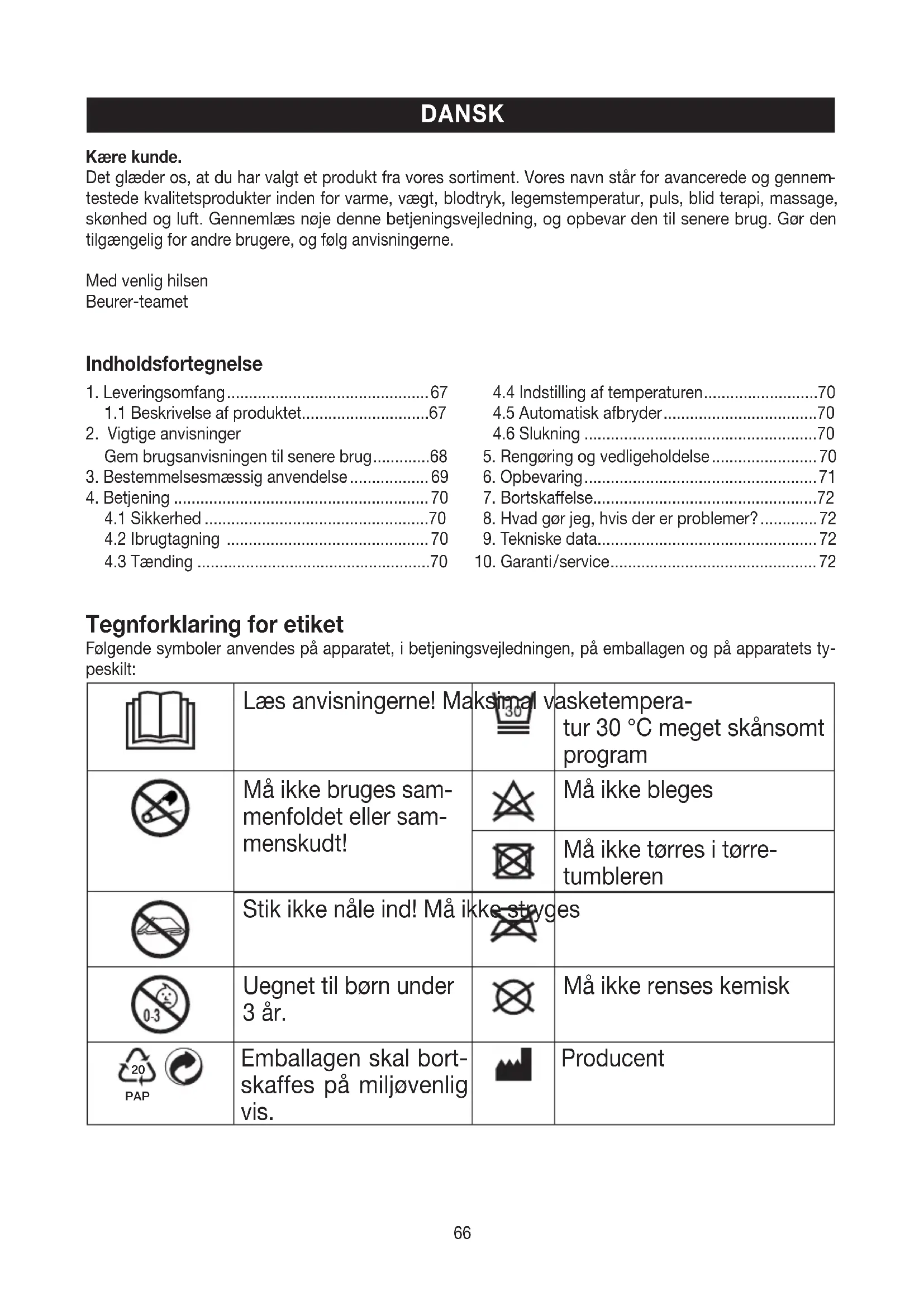 testede kvalitetsprodukter inden for varme, vægt, blodtryk, legemstemperatur, puls, blid terapi, massage, skønhed og luft. Gennemlæs nøje denne betjeningsvejledning, og opbevar den til senere brug. Gør den tilgængelig for andre brugere, og følg anvisningerne. Med venlig hilsen Beurer-teametDette produkt opfylder kravene i de gældende europæiske og natio- nale direktiver. Produkterne er påviseligt i overensstemmelse med kravene i de tekniske regler for Den Eurasiske Økono- miske Union. Apparat i beskyttelses- klasse 2 Bortskaffelse i henhold til EF-direktivet om affald fra elektrisk og elektronisk ud- styr WEEE (Waste Electrical and Electronic Equipment) De tekstiler, der bruges i dette apparat, opfylder de høje humanøkologiske krav i Oeko-Tex Standard 100, som der er eftervist af Forschungsinstitut Hohenstein. ADVARSEL; Advarsel om fare for tilskadekomst eller for dit helbred. VIGTIGT; Sikkerhedshenvisning til mulige skader på appa- rat/tilbehør. BEMÆRK; Henvisning til vigtige informationer.