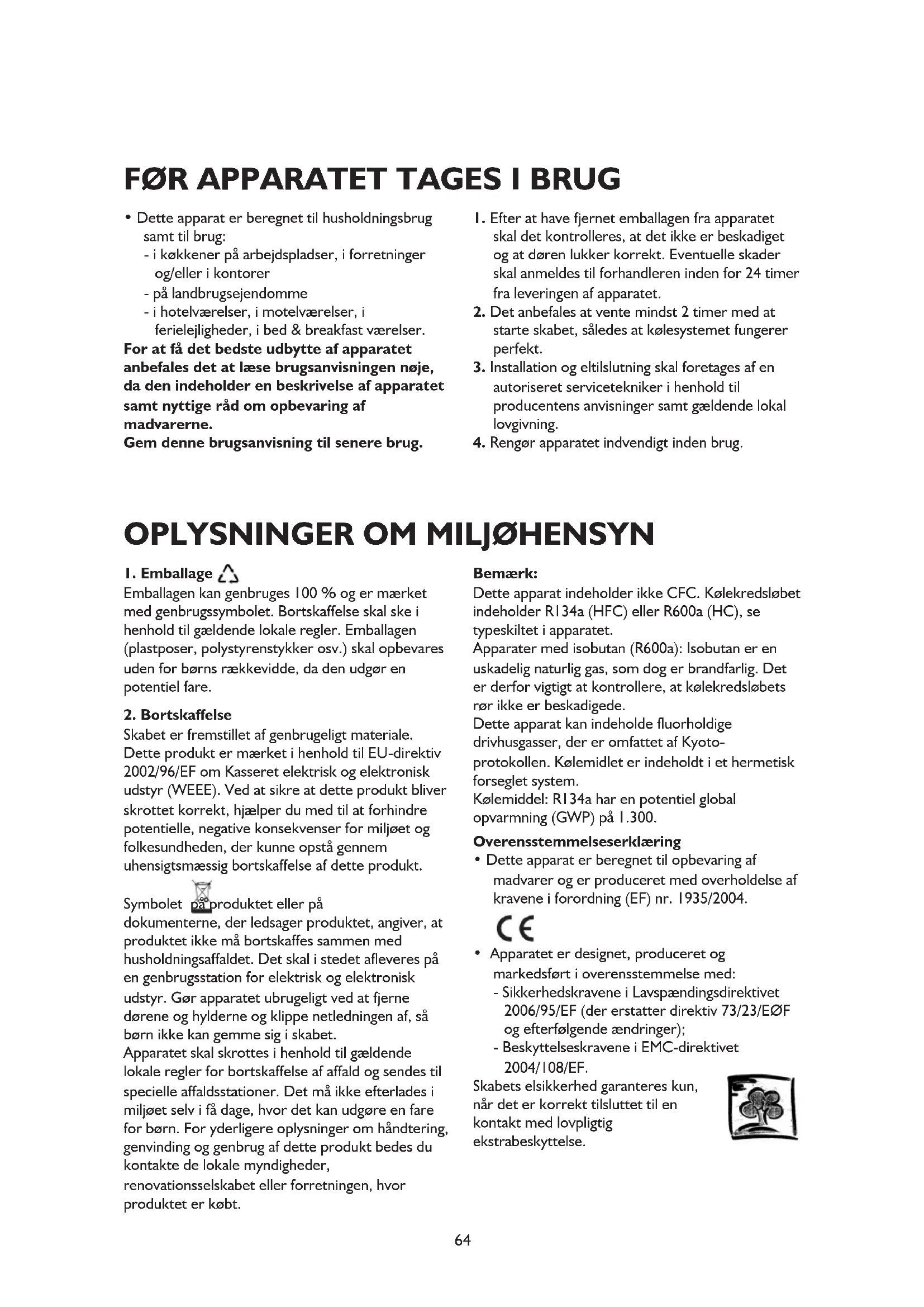 Skabet er fremstillet af genbrugeligt materiale. Dette produkt er mærket i henhold til EU-direktiv 2002/96/EF om Kasseret elektrisk og elektronisk udstyr (WEEE). Ved at sikre at dette produkt bliver skrottet korrekt, hjælper du med til at forhindre potentielle, negative konsekvenser for miljøet og folkesundheden, der kunne opstå gennem uhensigtsmæssig bortskaffelse af dette produkt. Symbolet på produktet eller på dokumenterne, der ledsager produktet, angiver, at produktet ikke må bortskaffes sammen med husholdningsaffaldet. Det skal i stedet afleveres på en genbrugsstation for elektrisk og elektronisk udstyr. Gør apparatet ubrugeligt ved at fjerne dørene og hylderne og klippe netledningen af, så børn ikke kan gemme sig i skabet. Apparatet skal skrottes i henhold til gældende lokale regler for bortskaffelse af affald og sendes til specielle affaldsstationer. Det må ikke efterlades i miljøet selv i få dage, hvor det kan udgøre en fare for børn. For yderligere oplysninger om håndtering, genvinding og genbrug af dette produkt bedes du kontakte de lokale myndigheder, renovationsselskabet eller forretningen, hvor produktet er købt. Bemærk: Dette apparat indeholder ikke CFC. Kølekredsløbet indeholder R134a (HFC) eller R600a (HC), se typeskiltet i apparatet. Apparater med isobutan (R600a): Isobutan er en uskadelig naturlig gas, som dog er brandfarlig. Det er derfor vigtigt at kontrollere, at kølekredsløbets rør ikke er beskadigede. Dette apparat kan indeholde fluorholdige drivhusgasser, der er omfattet af Kyoto- protokollen. Kølemidlet er indeholdt i et hermetisk forseglet system. Kølemiddel: R134a har en potentiel global opvarmning (GWP) på 1.300. Overensstemmelseserklæring