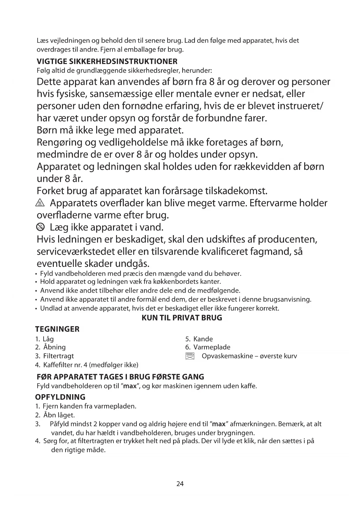Para evitar problemas ambientais e de saúde devido a substâncias perigosas contidas em equipamentos eléctricos e electrónicos, os aparelhos com este símbolo não deverão ser misturados com o lixo doméstico e sim recuperados, reutilizados ou reciclados.24 Læs vejledningen og behold den til senere brug. Lad den følge med apparatet, hvis det overdrages til andre. Fjern al emballage før brug. VIGTIGE SIKKERHEDSINSTRUKTIONER Følg altid de grundlæggende sikkerhedsregler, herunder: Dette apparat kan anvendes af børn fra 8 år og derover og personer hvis fysiske, sansemæssige eller mentale evner er nedsat, eller personer uden den fornødne erfaring, hvis de er blevet instrueret/ har været under opsyn og forstår de forbundne farer. Børn må ikke lege med apparatet. Rengøring og vedligeholdelse må ikke foretages af børn, medmindre de er over 8 år og holdes under opsyn. Apparatet og ledningen skal holdes uden for rækkevidden af børn under 8 år. Forket brug af apparatet kan forårsage tilskadekomst. h Apparatets overflader kan blive meget varme. Eftervarme holder overfladerne varme efter brug. l Læg ikke apparatet i vand. Hvis ledningen er beskadiget, skal den udskiftes af producenten, serviceværkstedet eller en tilsvarende kvalificeret fagmand, så eventuelle skader undgås.