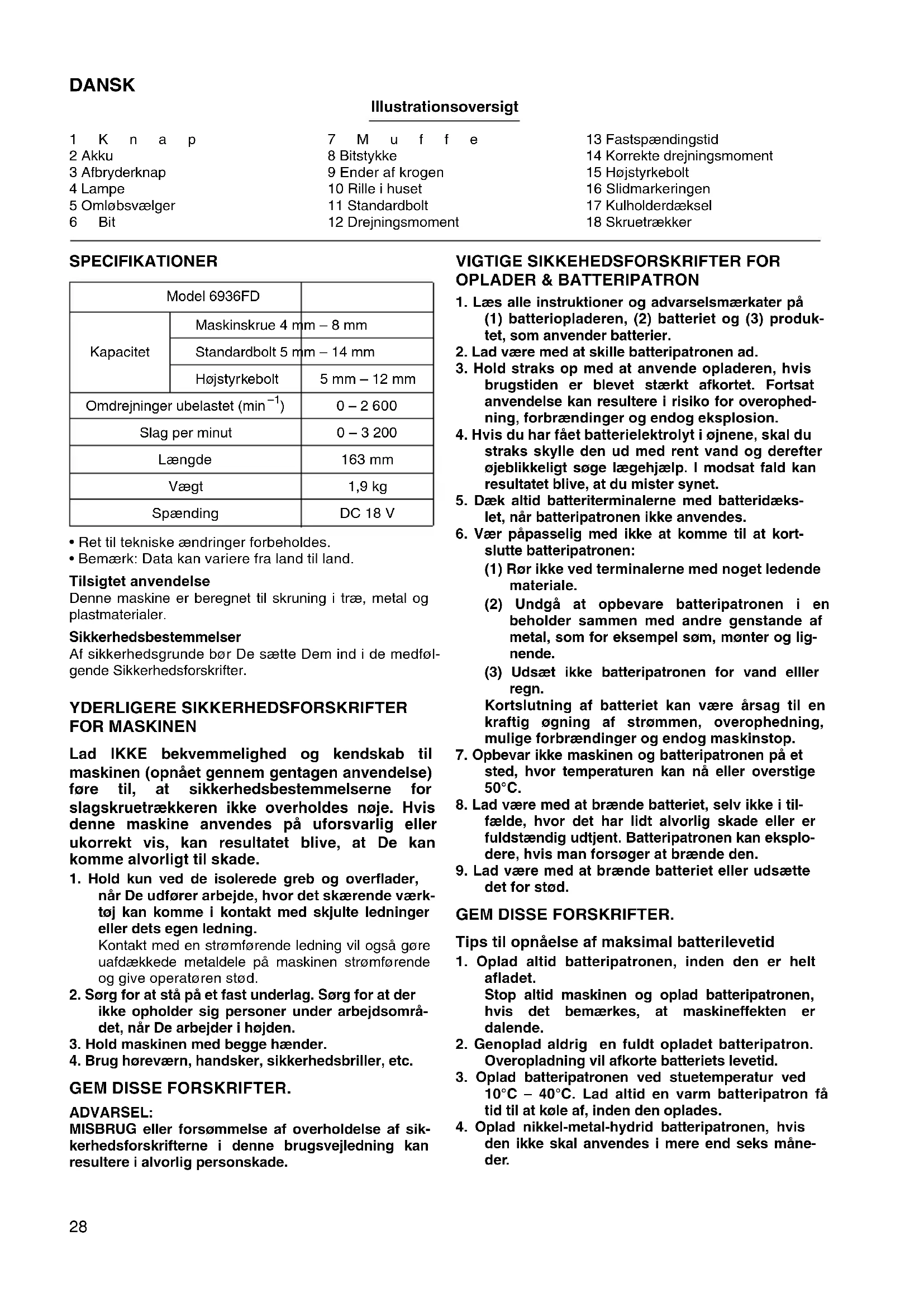 - Caixa de plástico para transporte28 DANSK Illustrationsoversigt 1Knap 2 Akku 3 Afbryderknap 4 Lampe 5 Omløbsvælger 6Bit 7Muffe 8 Bitstykke 9 Ender af krogen 10 Rille i huset 11 Standardbolt 12 Drejningsmoment 13 Fastspændingstid 14 Korrekte drejningsmoment 15 Højstyrkebolt 16 Slidmarkeringen 17 Kulholderdæksel 18 Skruetrækker SPECIFIKATIONER