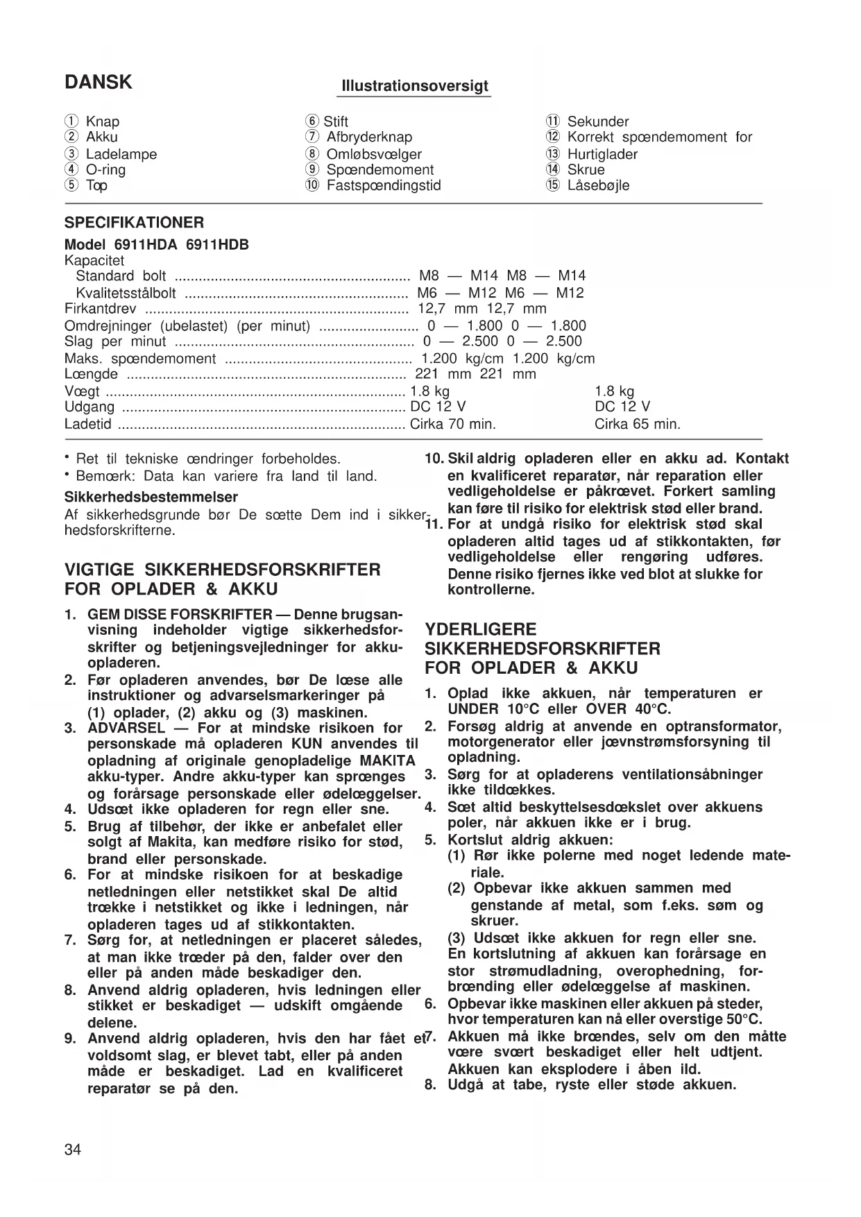 6911HDA/6911HDWA (Dan) (’98. 12. 18)9. Oplad ikke akkuen i en kasse eller anden form for beholder. Akkuen skal vœre anbragt på et sted med god ventilation under opladning. YDERLIGERE SIKKERHEDSFORSKRIFTER FOR MASKINEN