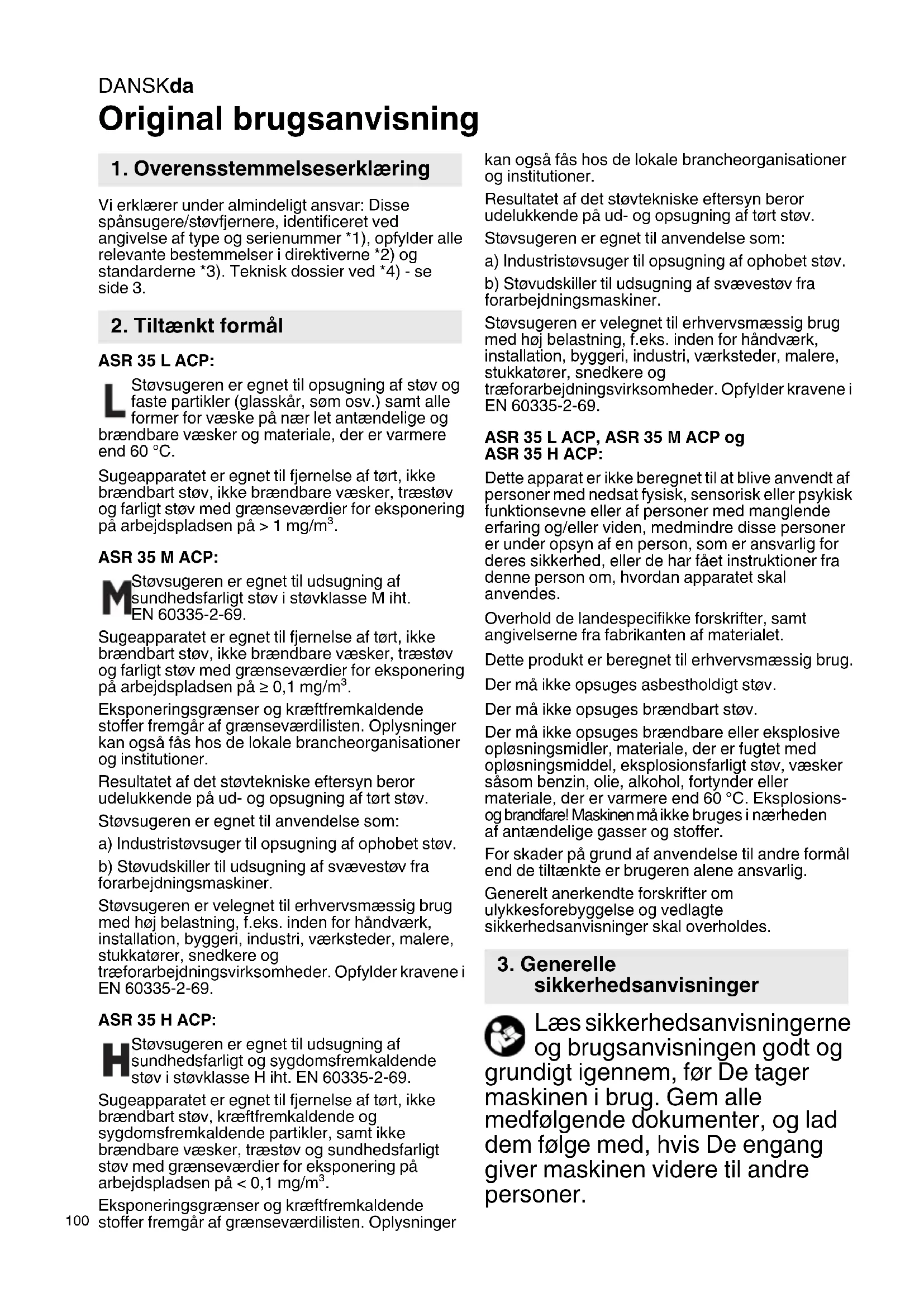 Original brugsanvisning Vi erklærer under almindeligt ansvar: Disse spånsugere/støvfjernere, identificeret ved angivelse af type og serienummer *1), opfylder alle relevante bestemmelser i direktiverne *2) og standarderne *3). Teknisk dossier ved *4) - se side 3. ASR 35 L ACP: Støvsugeren er egnet til opsugning af støv og faste partikler (glasskår, søm osv.) samt alle former for væske på nær let antændelige og brændbare væsker og materiale, der er varmere end 60 °C. Sugeapparatet er egnet til fjernelse af tørt, ikke brændbart støv, ikke brændbare væsker, træstøv og farligt støv med grænseværdier for eksponering på arbejdspladsen på > 1 mg/m³. ASR 35 M ACP: Støvsugeren er egnet til udsugning af sundhedsfarligt støv i støvklasse M iht. EN 60335-2-69. Sugeapparatet er egnet til fjernelse af tørt, ikke brændbart støv, ikke brændbare væsker, træstøv og farligt støv med grænseværdier for eksponering på arbejdspladsen på ≥ 0,1 mg/m³. Eksponeringsgrænser og kræftfremkaldende stoffer fremgår af grænseværdilisten. Oplysninger kan også fås hos de lokale brancheorganisationer og institutioner. Resultatet af det støvtekniske eftersyn beror udelukkende på ud- og opsugning af tørt støv. Støvsugeren er egnet til anvendelse som: a) Industristøvsuger til opsugning af ophobet støv. b) Støvudskiller til udsugning af svævestøv fra forarbejdningsmaskiner. Støvsugeren er velegnet til erhvervsmæssig brug med høj belastning, f.eks. inden for håndværk, installation, byggeri, industri, værksteder, malere, stukkatører, snedkere og træforarbejdningsvirksomheder. Opfylder kravene i EN 60335-2-69. ASR 35 H ACP: Støvsugeren er egnet til udsugning af sundhedsfarligt og sygdomsfremkaldende støv i støvklasse H iht. EN 60335-2-69. Sugeapparatet er egnet til fjernelse af tørt, ikke brændbart støv, kræftfremkaldende og sygdomsfremkaldende partikler, samt ikke brændbare væsker, træstøv og sundhedsfarligt støv med grænseværdier for eksponering på arbejdspladsen på < 0,1 mg/m³. Eksponeringsgrænser og kræftfremkaldende stoffer fremgår af grænseværdilisten. Oplysninger kan også fås hos de lokale brancheorganisationer og institutioner. Resultatet af det støvtekniske eftersyn beror udelukkende på ud- og opsugning af tørt støv. Støvsugeren er egnet til anvendelse som: a) Industristøvsuger til opsugning af ophobet støv. b) Støvudskiller til udsugning af svævestøv fra forarbejdningsmaskiner. Støvsugeren er velegnet til erhvervsmæssig brug med høj belastning, f.eks. inden for håndværk, installation, byggeri, industri, værksteder, malere, stukkatører, snedkere og træforarbejdningsvirksomheder. Opfylder kravene i EN 60335-2-69. ASR 35 L ACP, ASR 35 M ACP og ASR 35 H ACP: Dette apparat er ikke beregnet til at blive anvendt af personer med nedsat fysisk, sensorisk eller psykisk funktionsevne eller af personer med manglende erfaring og/eller viden, medmindre disse personer er under opsyn af en person, som er ansvarlig for deres sikkerhed, eller de har fået instruktioner fra denne person om, hvordan apparatet skal anvendes. Overhold de landespecifikke forskrifter, samt angivelserne fra fabrikanten af materialet. Dette produkt er beregnet til erhvervsmæssig brug. Der må ikke opsuges asbestholdigt støv. Der må ikke opsuges brændbart støv. Der må ikke opsuges brændbare eller eksplosive opløsningsmidler, materiale, der er fugtet med opløsningsmiddel, eksplosionsfarligt støv, væsker såsom benzin, olie, alkohol, fortynder eller materiale, der er varmere end 60 °C. Eksplosions- og brandfare! Maskinen må ikke bruges i nærheden af antændelige gasser og stoffer. For skader på grund af anvendelse til andre formål end de tiltænkte er brugeren alene ansvarlig. Generelt anerkendte forskrifter om ulykkesforebyggelse og vedlagte sikkerhedsanvisninger skal overholdes. Læs sikkerhedsanvisningerne og brugsanvisningen godt og grundigt igennem, før De tager maskinen i brug. Gem alle medfølgende dokumenter, og lad dem følge med, hvis De engang giver maskinen videre til andre personer.