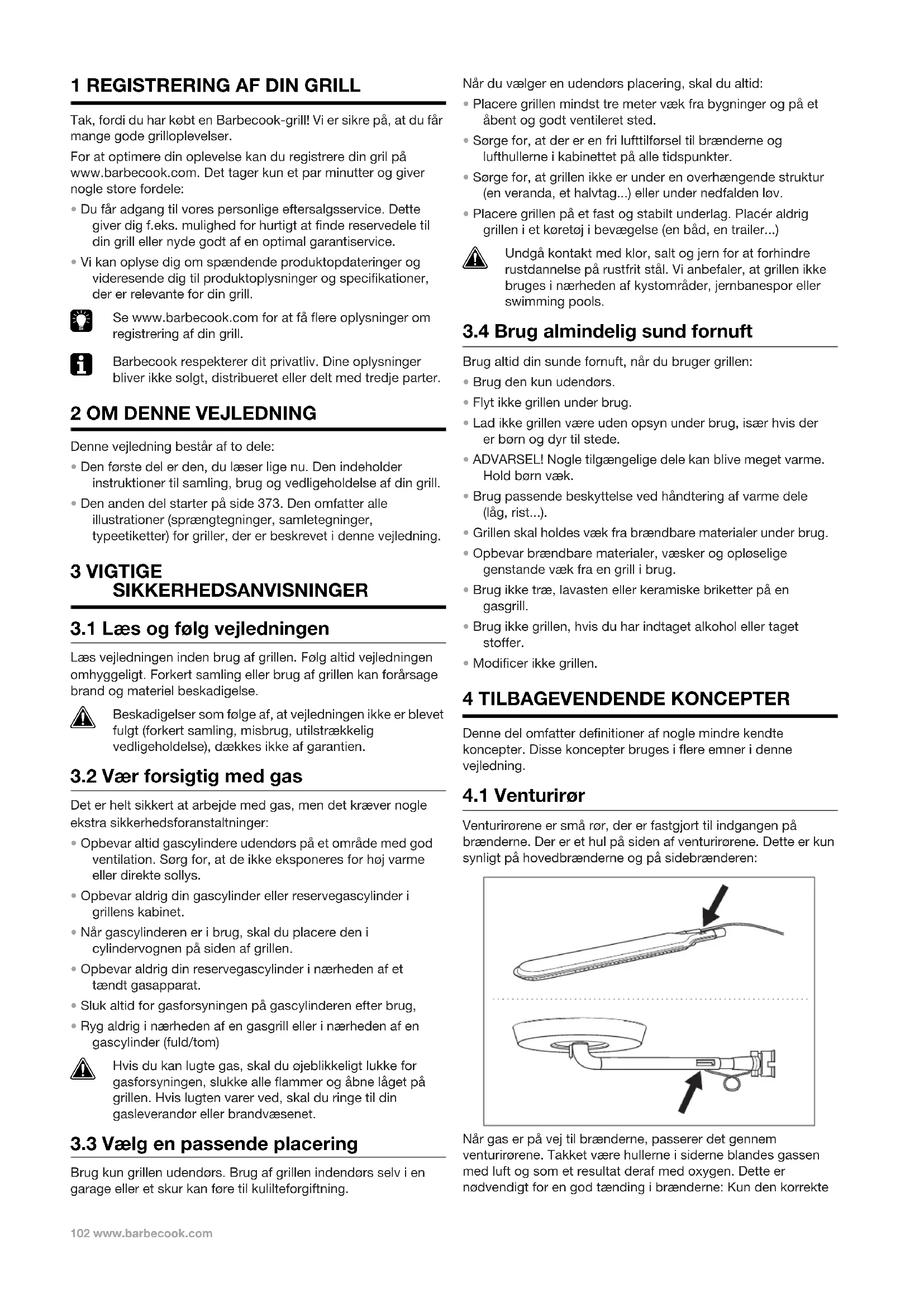 - Den anden del starter på side 373. Den omfatter alle illustrationer (sprængtegninger, samletegninger, typeetiketter) for griller, der er beskrevet i denne vejledning. 3 VIGTIGE SIKKERHEDSANVISNINGER
