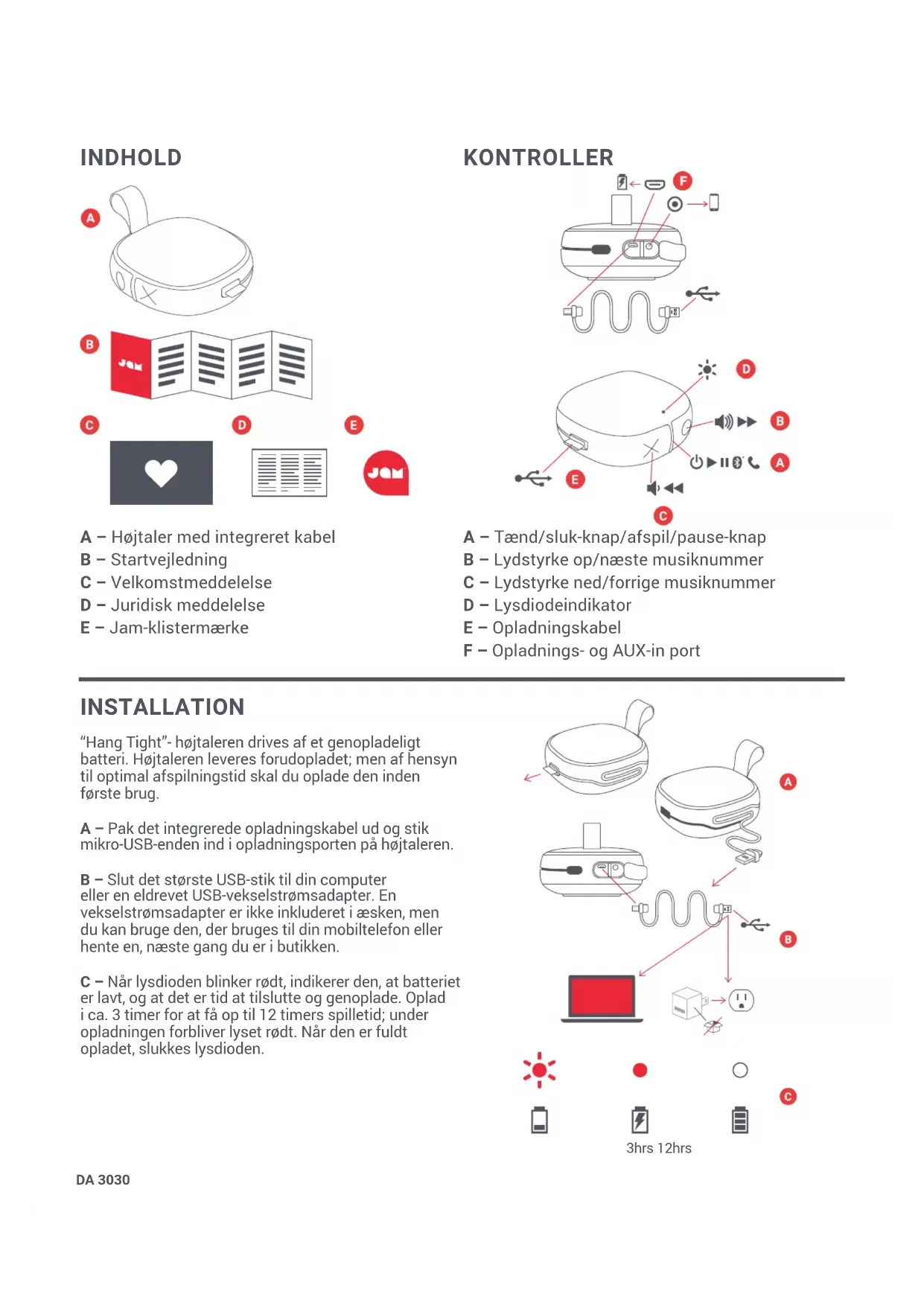 EN 29EN 29 “Hang Tight” HX-P303 InstruktionsbogDA 3030 INDHOLD A – Højtaler med integreret kabel B – Startvejledning C – Velkomstmeddelelse D – Juridisk meddelelse E – Jam-klistermærke KONTROLLER A – Tænd/sluk-knap/afspil/pause-knap B – Lydstyrke op/næste musiknummer C – Lydstyrke ned/forrige musiknummer D – Lysdiodeindikator E – Opladningskabel F – Opladnings- og AUX-in port 3hrs 12hrs INSTALLATION “Hang Tight”- højtaleren drives af et genopladeligt batteri. Højtaleren leveres forudopladet; men af hensyn til optimal afspilningstid skal du oplade den inden første brug. A – Pak det integrerede opladningskabel ud og stik mikro-USB-enden ind i opladningsporten på højtaleren. B – Slut det største USB-stik til din computer eller en eldrevet USB-vekselstrømsadapter. En vekselstrømsadapter er ikke inkluderet i æsken, men du kan bruge den, der bruges til din mobiltelefon eller hente en, næste gang du er i butikken. C – Når lysdioden blinker rødt, indikerer den, at batteriet er lavt, og at det er tid at tilslutte og genoplade. Oplad i ca. 3 timer for at få op til 12 timers spilletid; under opladningen forbliver lyset rødt. Når den er fuldt opladet, slukkes lysdioden.DA 3131 BRUG
