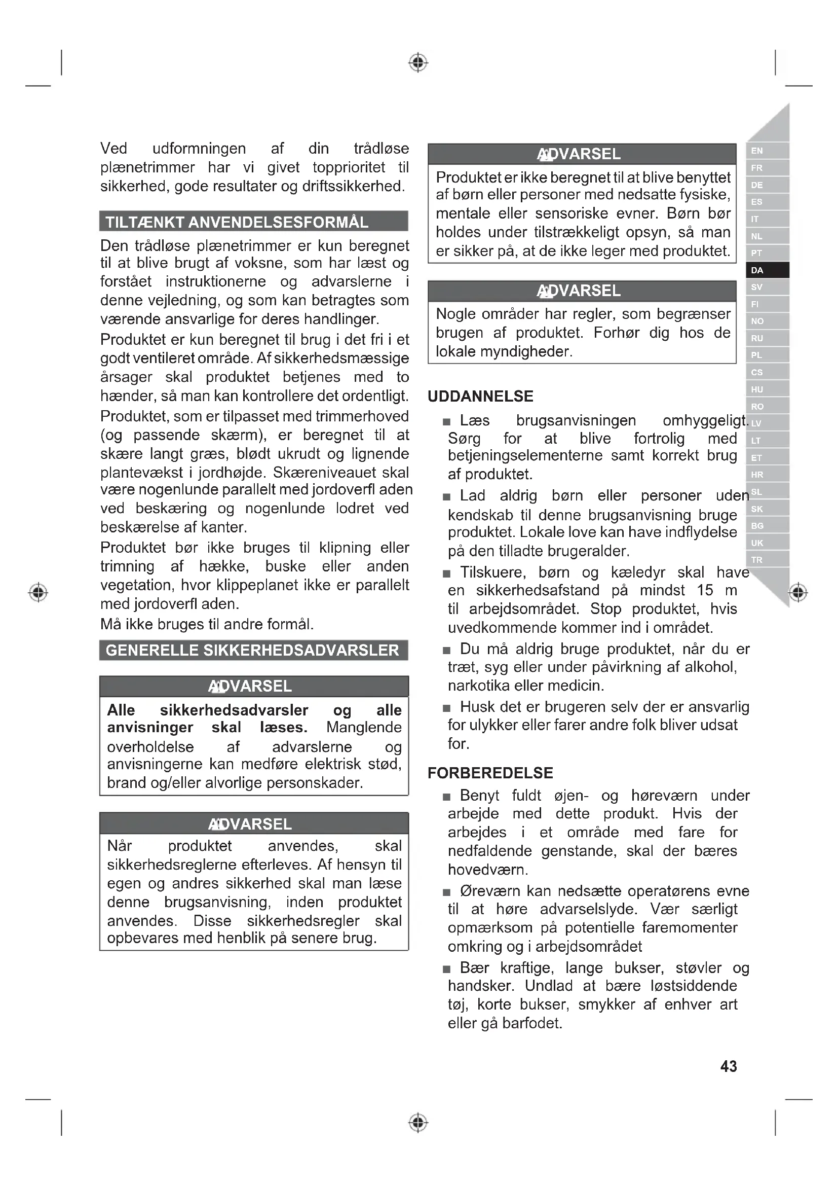 Den trådløse plænetrimmer er kun beregnet til at blive brugt af voksne, som har læst og forstået instruktionerne og advarslerne i denne vejledning, og som kan betragtes som værende ansvarlige for deres handlinger. Produktet er kun beregnet til brug i det fri i et godt ventileret område. Af sikkerhedsmæssige årsager skal produktet betjenes med to hænder, så man kan kontrollere det ordentligt. Produktet, som er tilpasset med trimmerhoved (og passende skærm), er beregnet til at skære langt græs, blødt ukrudt og lignende plantevækst i jordhøjde. Skæreniveauet skal være nogenlunde parallelt med jordoverfl aden ved beskæring og nogenlunde lodret ved beskærelse af kanter. Produktet bør ikke bruges til klipning eller trimning af hække, buske eller anden vegetation, hvor klippeplanet ikke er parallelt med jordoverfl aden. Må ikke bruges til andre formål. GENERELLE SIKKERHEDSADVARSLER ADVARSEL Alle sikkerhedsadvarsler og alle anvisninger skal læses. Manglende overholdelse af advarslerne og anvisningerne kan medføre elektrisk stød, brand og/eller alvorlige personskader. ADVARSEL Når produktet anvendes, skal sikkerhedsreglerne efterleves. Af hensyn til egen og andres sikkerhed skal man læse denne brugsanvisning, inden produktet anvendes. Disse sikkerhedsregler skal opbevares med henblik på senere brug. ADVARSEL Produktet er ikke beregnet til at blive benyttet af børn eller personer med nedsatte fysiske, mentale eller sensoriske evner. Børn bør holdes under tilstrækkeligt opsyn, så man er sikker på, at de ikke leger med produktet. ADVARSEL Nogle områder har regler, som begrænser brugen af produktet. Forhør dig hos de lokale myndigheder. UDDANNELSE ■ Læs brugsanvisningen omhyggeligt. Sørg for at blive fortrolig med betjeningselementerne samt korrekt brug af produktet. ■ Lad aldrig børn eller personer uden kendskab til denne brugsanvisning bruge produktet. Lokale love kan have indflydelse på den tilladte brugeralder. ■ Tilskuere, børn og kæledyr skal have en sikkerhedsafstand på mindst 15 m til arbejdsområdet. Stop produktet, hvis uvedkommende kommer ind i området. ■ Du må aldrig bruge produktet, når du er træt, syg eller under påvirkning af alkohol, narkotika eller medicin. ■ Husk det er brugeren selv der er ansvarlig for ulykker eller farer andre folk bliver udsat for. FORBEREDELSE ■ Benyt fuldt øjen- og høreværn under arbejde med dette produkt. Hvis der arbejdes i et område med fare for nedfaldende genstande, skal der bæres hovedværn. ■ Øreværn kan nedsætte operatørens evne til at høre advarselslyde. Vær særligt opmærksom på potentielle faremomenter omkring og i arbejdsområdet ■ Bær kraftige, lange bukser, støvler og handsker. Undlad at bære løstsiddende tøj, korte bukser, smykker af enhver art eller gå barfodet.44 | Dansk ■ Langt hår skal bindes op over skulderniveau, så det ikke risikerer at vikle sig ind i bevægelige dele. ■ Inden ibrugtagning og efter enhver ydre påvirkning skal man kontrollere, at der ikke findes beskadigede dele. En defekt kontakt eller en del, som er blevet beskadiget eller slidt, skal repareres ordentligt eller udskiftes på et autoriseret serviceværksted. ■ Kontrollér, at klippeudstyret er monteret korrekt og ordentligt fastgjort. ■ Produktet må aldrig benyttes, før alle skærme, deflektorer og håndtag er fastgjort ordentligt og sikkert. ■ Overvej grundigt hvilken type arbejdsmiljø du befinder dig i. Hold arbejdsområdet ryddet for ledninger, pinde, sten og affald, som ved kontakt med klipperen kan blive til udslyngede genstande.