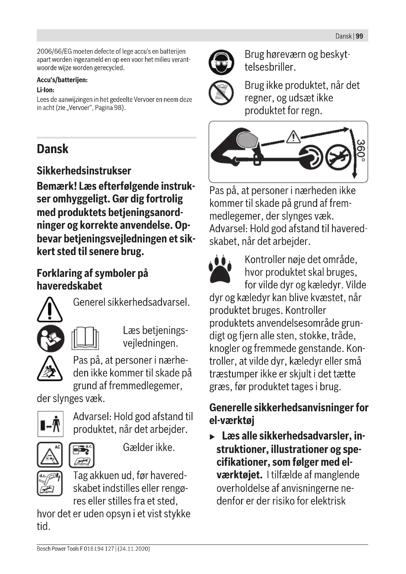 a.c. Gælder ikke. d.c. Tag akkuen ud, før havered- skabet indstilles eller rengø- res eller stilles fra et sted, hvor det er uden opsyn i et vist stykke tid. Brug høreværn og beskyt- telsesbriller. Brug ikke produktet, når det regner, og udsæt ikke produktet for regn. Pas på, at personer i nærheden ikke kommer til skade på grund af frem- medlegemer, der slynges væk. Advarsel: Hold god afstand til havered- skabet, når det arbejder. Kontroller nøje det område, hvor produktet skal bruges, for vilde dyr og kæledyr. Vilde dyr og kæledyr kan blive kvæstet, når produktet bruges. Kontroller produktets anvendelsesområde grun- digt og fjern alle sten, stokke, tråde, knogler og fremmede genstande. Kon- troller, at vilde dyr, kæledyr eller små træstumper ikke er skjult i det tætte græs, før produktet tages i brug. Generelle sikkerhedsanvisninger for el-værktøj u Læs alle sikkerhedsadvarsler, in- struktioner, illustrationer og spe- cifikationer, som følger med el- værktøjet. I tilfælde af manglende overholdelse af anvisningerne ne- denfor er der risiko for elektrisk Bosch Power Tools F 016 L94 127 | (24.11.2020)100 | Dansk stød, brand og/eller alvorlige per- sonskader. u Opbevar alle sikkerhedsinstrukser og anvisninger til senere brug. u Betegnelsen "el-værktøj" i advarsler- ne refererer til dit (ledningsforbund- ne) el-værktøj tilsluttet lysnettet eller til batteridrevet (ledningsfrit) el- værktøj. Sikkerhed på arbejdspladsen u Hold arbejdsområdet rent og godt oplyst. Rodede eller mørke områder kan medføre ulykker. u Brug ikke el‑værktøjet i eksplo- sionsfarlige omgivelser, hvor der findes brændbare væsker, gasser eller støv. El‑værktøj kan slå gnister, der kan antænde støv eller dampe. u Sørg for, at andre personer og ikke mindst børn holdes væk fra ar- bejdsområdet, når el-værktøjet er i brug. Hvis man distraheres, kan man miste kontrollen over maskinen. Elektrisk sikkerhed u El‑værktøjets stik skal passe til kontakten. Stikket må under in- gen omstændigheder ændres. Brug ikke adapterstik sammen med jordforbundet el‑værktøj. Uændrede stik, der passer til kontak- terne, nedsætter risikoen for elek- trisk stød. u Undgå kropskontakt med jordfor- bundne overflader som f. eks. rør, radiatorer, komfurer og køleska- be. Hvis din krop er jordforbundet, øges risikoen for elektrisk stød. u El-værktøj må ikke udsættes for regn eller fugt. Indtrængen af vand i el‑værktøj øger risikoen for elek- trisk stød. u Brug ikke ledningen til formål, den ikke er beregnet til. Du må aldrig bære el‑værktøjet i ledningen, hænge el‑værktøjet op i ledningen eller rykke i ledningen for at træk- ke stikket ud af kontakten. Beskyt ledningen mod varme, olie, skarpe kanter eller maskindele, der er i bevægelse. Beskadigede eller ind- viklede ledninger øger risikoen for elektrisk stød. u Hvis el‑værktøjet benyttes i det fri, må der kun benyttes en forlæn- gerledning, der er egnet til uden- dørs brug. Brug af forlængerledning til udendørs brug nedsætter risikoen for elektrisk stød. u Hvis det ikke kan undgås at bruge el‑værktøjet i fugtige omgivelser, skal der bruges et HFI‑relæ. Brug af et HFI‑relæ reducerer risikoen for at få elektrisk stød. Personlig sikkerhed u Det er vigtigt at være opmærksom og holde øje med, hvad man laver, og bruge el‑værktøjet fornuftigt. Brug ikke el‑værktøj, hvis du er træt, har indtaget alkohol eller er påvirket af medikamenter eller eu- foriserende stoffer. Få sekunders F 016 L94 127 | (24.11.2020) Bosch Power ToolsDansk | 101 uopmærksomhed ved brug af el‑værktøjet kan føre til alvorlige per- sonskader. u Brug personligt beskyttelsesud- styr. Brug altid beskyttelsesbril- ler. Brug af sikkerhedsudstyr som f. eks. støvmaske, skridsikkert fodtøj, beskyttelseshjelm eller høreværn af- hængig af maskintype og anvendelse nedsætter risikoen for per- sonskader. u Undgå utilsigtet igangsætning. Kontrollér, at el‑værktøjet er sluk- ket, før du tilslutter det til strøm- tilførslen og/eller batteriet, løfter eller bærer det. Undgå at bære el‑værktøjet med fingeren på afbry- deren og sørg for, at el‑værktøjet ik- ke er tændt, når det sluttes til nettet, da dette øger risikoen for per- sonskader. u Gør det til en vane altid at fjerne indstillingsværktøj eller skruenøg- le, før el‑værktøjet startes. Hvis et stykke værktøj eller en nøgle sidder i en roterende maskindel, er der risiko for personskader. u Undgå en unormal legemsposi- tion. Sørg for at stå sikkert, mens der arbejdes, og kom ikke ud af ba- lance. Dermed har du bedre mulig- heder for at kontrollere el‑værktøjet, hvis der skulle opstå uventede situa- tioner. u Brug egnet arbejdstøj. Undgå løse beklædningsgenstande eller smykker. Hold hår og tøj væk fra dele, der bevæger sig. Dele, der er i bevægelse, kan gribe fat i løstsid- dende tøj, smykker eller langt hår. u Hvis støvudsugnings- og opsam- lingsudstyr kan monteres, er det vigtigt, at dette tilsluttes og benyt- tes korrekt. Brug af en støvopsug- ning kan reducere støvmængden og dermed den fare, der er forbundet med støv. u Selvom du kender værktøjet godt og er vant til at bruge det, skal du alligevel være opmærksom og overholde sikkerhedsanvisninger- ne. Et øjebliks uopmærksomhed kan medføre alvorlige personskader. Omhyggelig omgang med og brug af el‑værktøj u Undgå overbelastning af el-værk- tøjet. Brug altid el‑værktøj, der er beregnet til det stykke arbejde, der skal udføres. Med det passen- de el‑værktøj arbejder man bedst og mest sikkert inden for det angivne ef- fektområde. u Brug ikke el‑værktøj, hvis afbry- deren er defekt. El‑værktøj, der ik- ke kan startes eller stoppes, er farligt og skal repareres. u Træk stikket ud af stikkontakten og/eller fjern batteriet, hvis det kan tages af, før el-værktøjet ju- steres, før skift af tilbehørsdele 