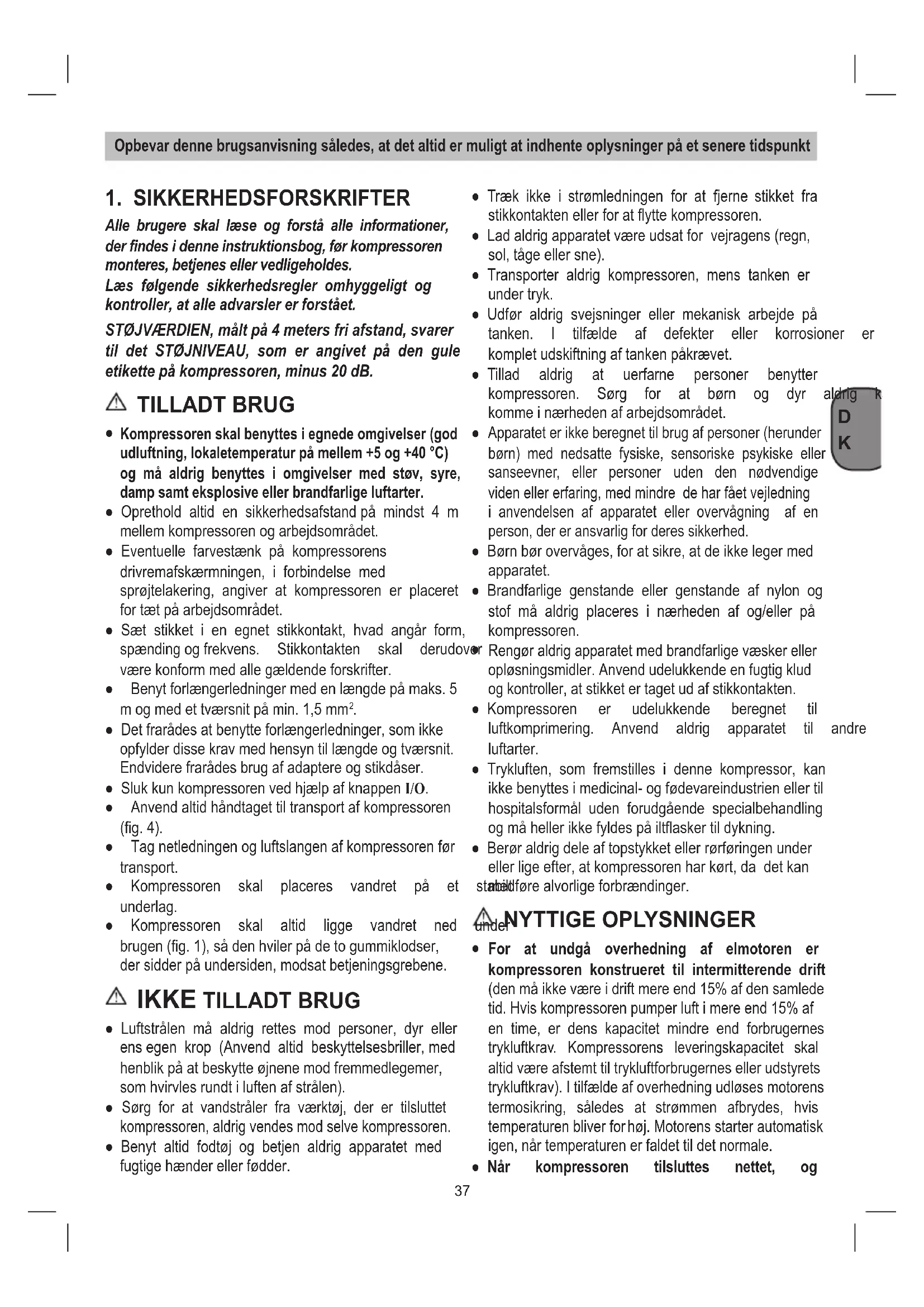 Rengør aldrig apparatet med brandfarlige væsker eller opløsningsmidler.Anvendudelukkendeenfugtigklud ogkontroller,atstikketertagetudafstikkontakten. ● Kompressoren er udelukkende beregnet til luftkomprimering. Anvend aldrig apparatet til andre luftarter. ● Trykluften, som fremstilles i denne kompressor, kan ikkebenyttesimedicinal-ogfødevareindustrienellertil hospitalsformål uden forudgående specialbehandling ogmåhellerikkefyldespåiltflaskertildykning. ● Berør aldrig dele af topstykket eller rørføringen under eller lige efter, at kompressoren har kørt, da det kan medførealvorligeforbrændinger. NYTTIGE OPLYSNINGER
