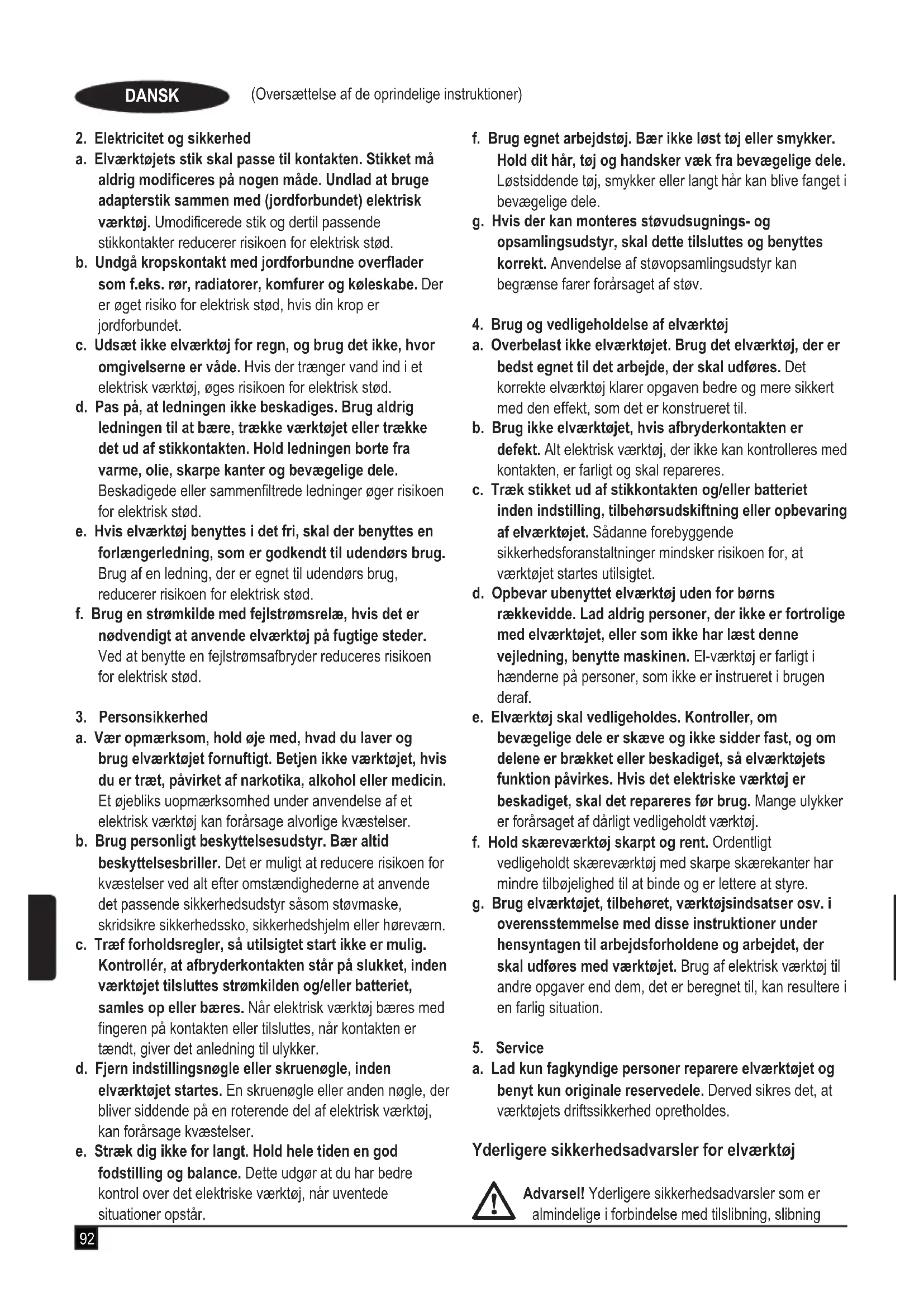 a. Hold arbejdsområdet rent og ordentligt oplyst. Rodede eller mørke områder giver anledning til ulykker. b. Brug ikke elværktøj i eksplosive omgivelser, f.eks. hvor der er brændbare væsker, gasser eller støv. Elværktøj danner gnister, der kan antænde støv eller dampe. c. Hold børn og andre personer i nærheden på afstand, når der arbejdes med elværktøj. Distraktioner kan medføre, at du mister kontrollen.92 (Oversættelse af de oprindelige instruktioner) DANSK