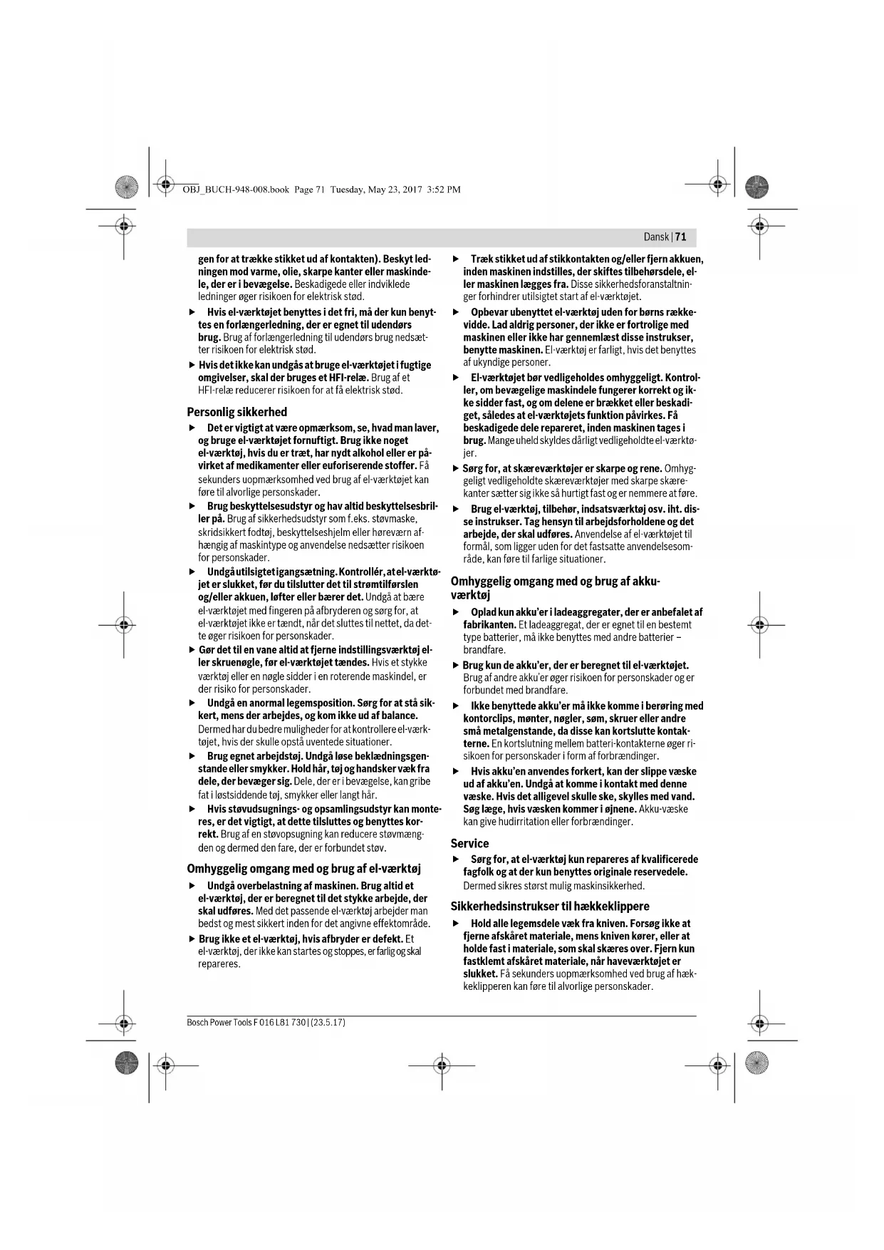 - afhængigt af den anvendte akku OBJ_BUCH-948-008.book Page 74 Tuesday, May 23, 2017 3:52 PMDansk | 75 Bosch Power Tools F 016 L81 730 | (23.5.17) Brug ikke 4,0 Ah akkuen med dette el-værktøj. Støj-/vibrationsinformation Støjemissionsværdier bestemt iht. EN 60745-2-15. Maskinens A-vægtede støjniveau er typisk: Lydtryksniveau 67 dB(A); lydeffektniveau 87 dB(A). Usik- kerhed K =3 dB. Brug høreværn! Samlede vibrationsværdier a
