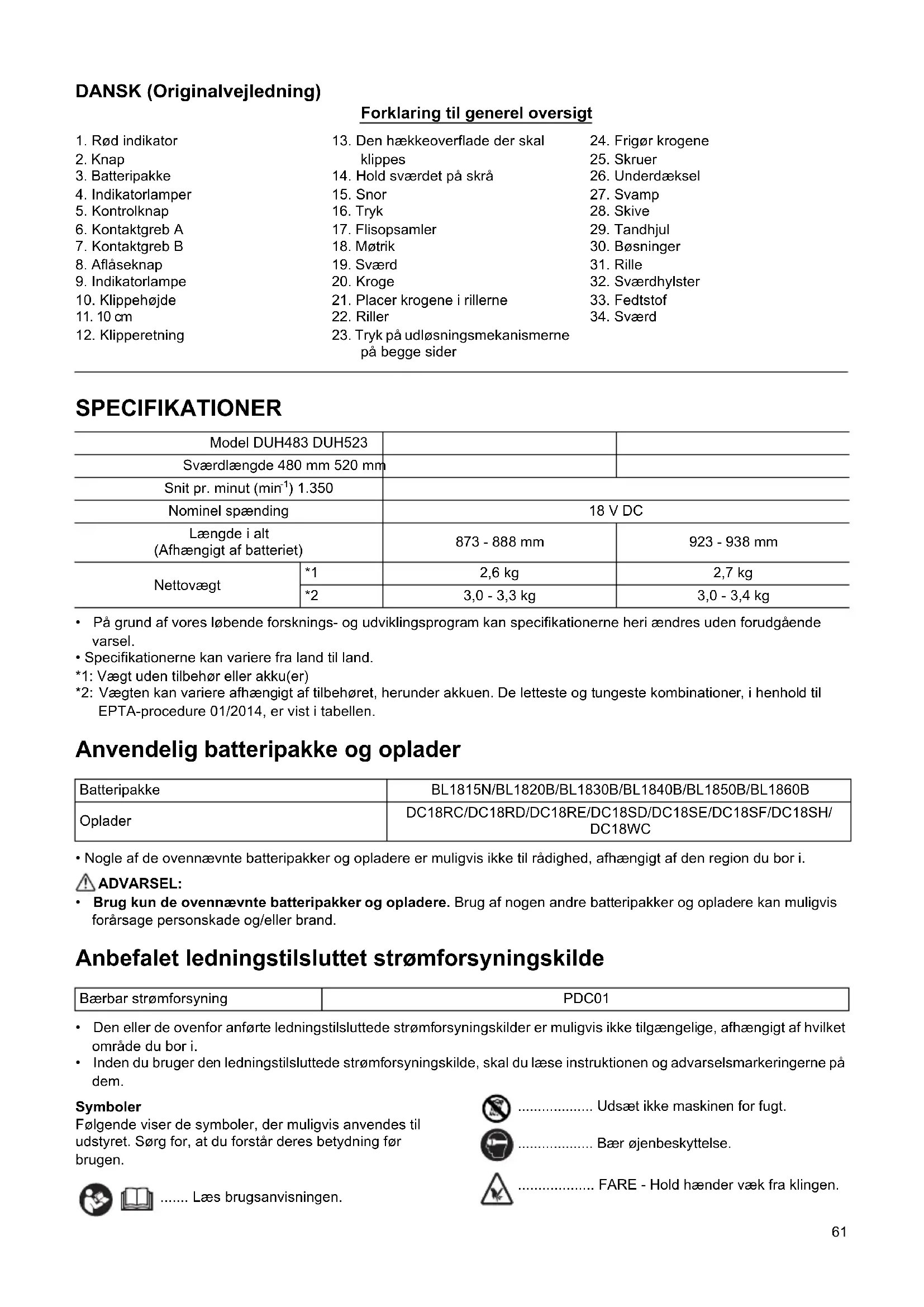 Nettovægt *1 2,6 kg 2,7 kg *2 3,0 - 3,3 kg 3,0 - 3,4 kg Batteripakke BL1815N/BL1820B/BL1830B/BL1840B/BL1850B/BL1860B Oplader DC18RC/DC18RD/DC18RE/DC18SD/DC18SE/DC18SF/DC18SH/ DC18WC Bærbar strømforsyning PDC0162 ................... Bær beskyttelsesbriller og høreværn. ................... Udsæt ikke for regn. ............ Kun for lande inden for EU På grund af tilstedeværelsen af farlige komponenter i udstyret kan affald af elektrisk og elektronisk udstyr, akkumulatorer og batterier have en negativ indvirkning på miljøet og folkesundheden. Bortskaf ikke elektriske og elektroniske apparater eller batterier sammen med husholdningsaffald! I overensstemmelse med EF-direktiv om affaldshåndtering af elektrisk og elektronisk udstyr og om akkumulatorer og batterier og affaldsakkumulatorer og -batterier, og i overensstemmelse med national lovgivning, skal brugt elektrisk udstyr, batterier og akkumulatorer opbevares separat og leveres til et separat indsamlingssted for kommunalt affald, der er etableret i henhold til bestemmelserne om miljøbeskyttelse. Dette er angivet ved symbolet på den krydsede skraldespand, der er placeret på udstyret. ................. Garanteret lydeffektniveau i henhold til EU-direktivet om maskiner til udendørs brug. ................. Lydeffektniveau i henhold til Australiens NSW forordning om støjemission Tilsigtet anvendelse ENE014-1 Maskinen er beregnet til klipning af hække. Almindelige sikkerhedsregler for el-værktøj GEA010-2 ADVARSEL: Læs alle de sikkerhedsadvarsler, instruktioner, illustrationer og specifikationer, der følger med denne maskine. Forsømmelse af at overholde alle nedenstående instruktioner kan medføre elektrisk stød, brand og/eller alvorlig personskade. Gem alle advarsler og instruktioner til fremtidig reference. Ordet “el-værktøj” i advarslerne henviser til det netforsynede (netledning) el-værktøj eller batteriforsynede (akku) el-værktøj. Sikkerhedsadvarsler for akku hækketrimmer GEB278-1