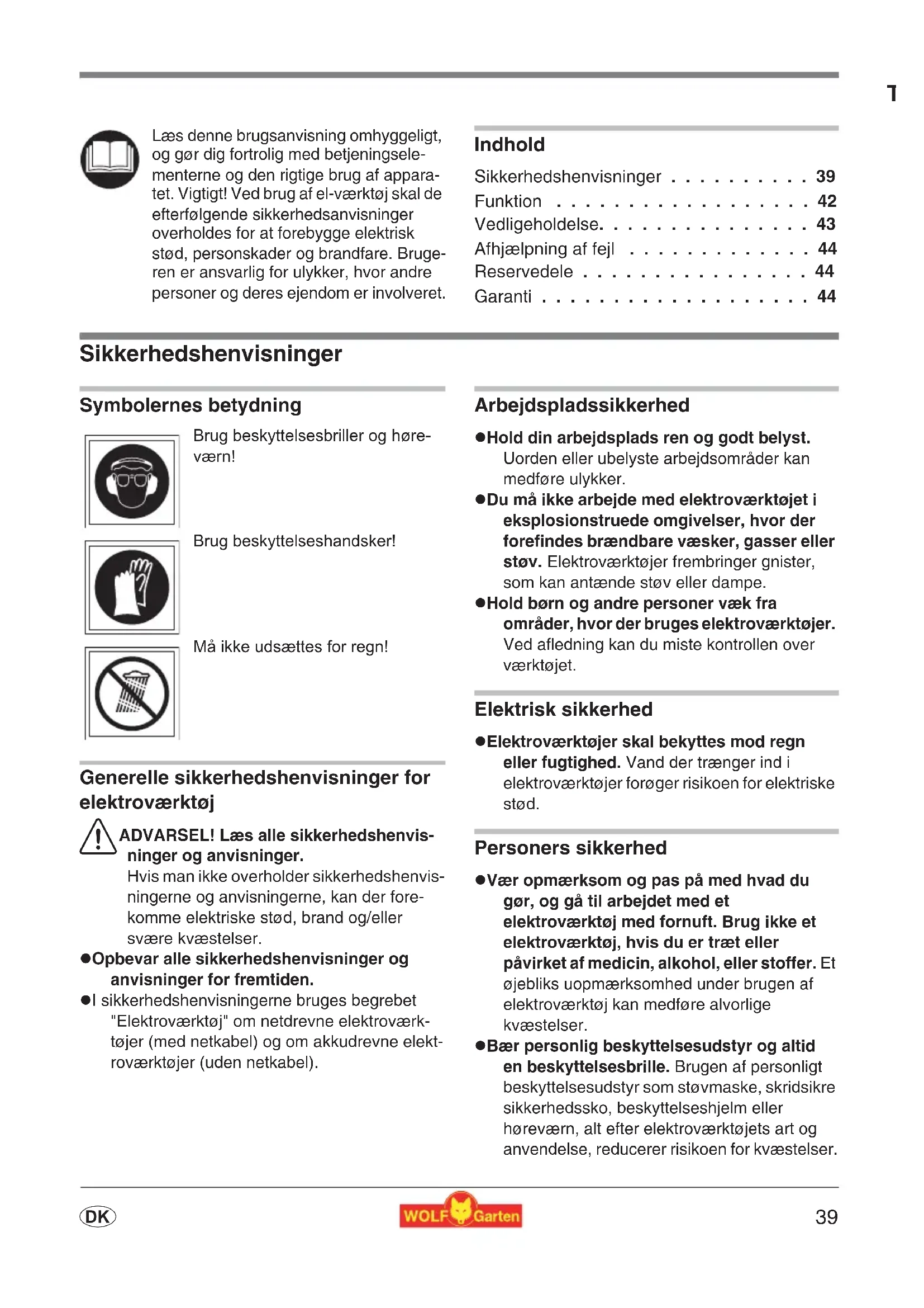 - dTillykke med dit nye WOLF-Garten produkt Indhold Sikkerhedshenvisninger p. 39