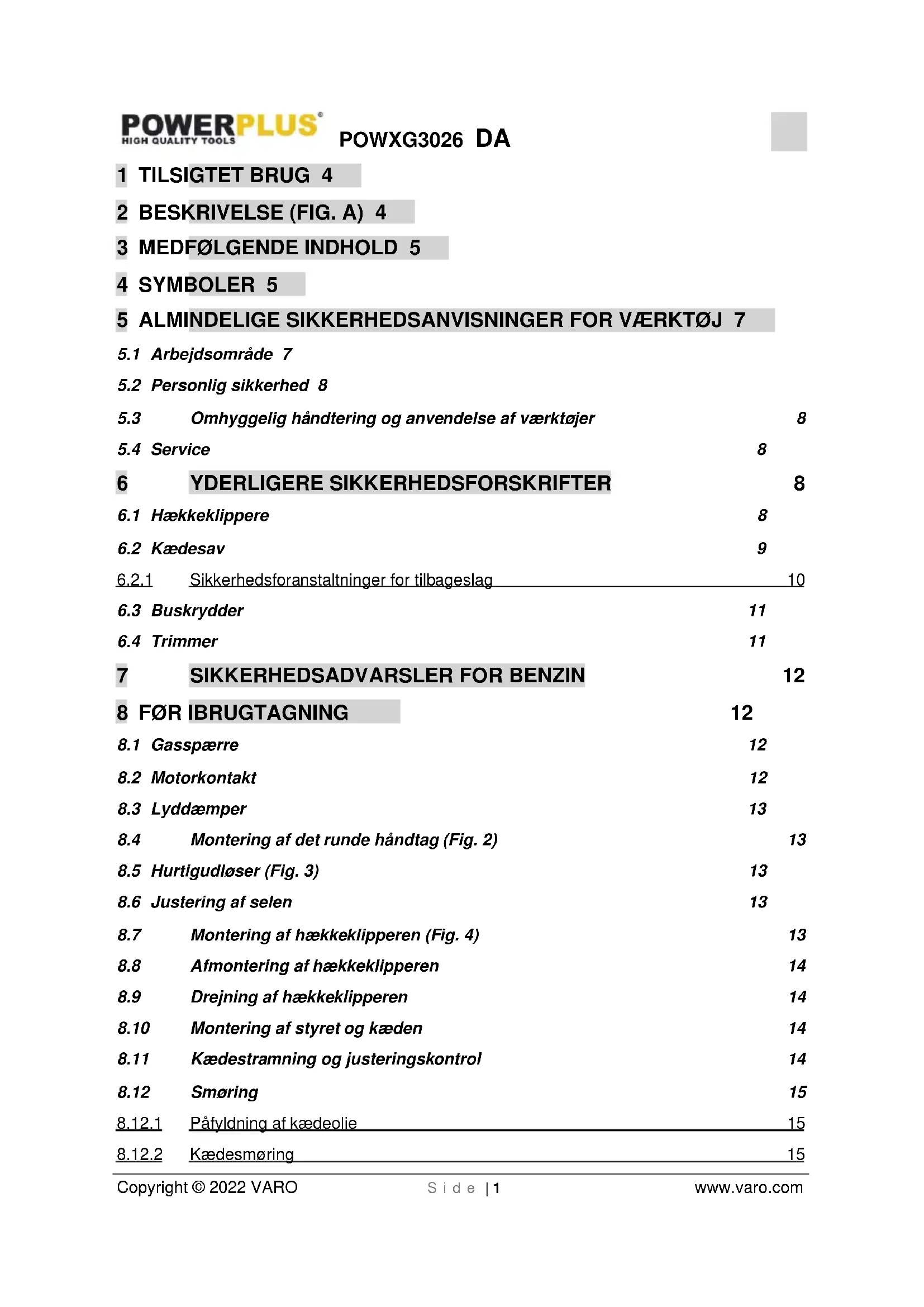 - Brug aldrig hækkeklipperen uden at kontrollere beslagets tæthed.POWXG3026 DA Copyright © 2022 VARO S i d e | 23 www.varo.com