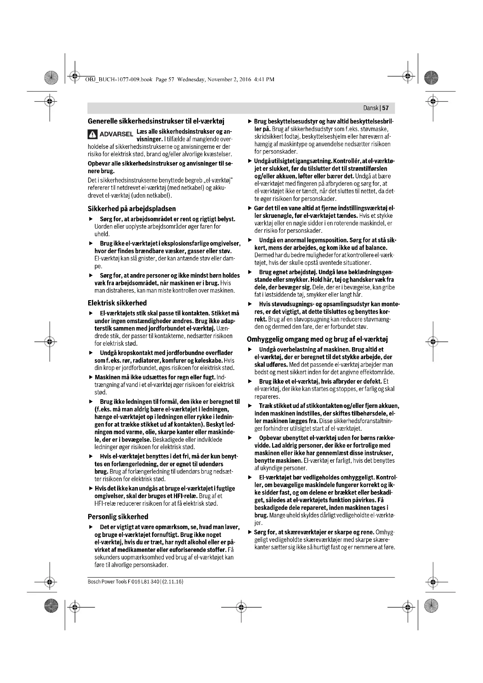 LED Capaciteit Permanent licht groen 35 – 100% Knipperlicht groen 15 – 35% Knipperlicht rood 5 – 15% Permanent licht rood 0 – 5% Symptomen Mogelijke oorzaak Oplossing Knipduur per acculading te gering De accu nadert het einde van zijn levensduur Neem contact op met klantenservice Accuoplaadindicatie brandt permanent Geen opladen mogelijk Accu defect Neem contact op met klantenservice OBJ_BUCH-1077-009.book Page 55 Wednesday, November 2, 2016 4:41 PM56 | Dansk F 016 L81 340 | (2.11.16) Bosch Power Tools Onderhoud en reiniging Let op! Schakel het tuingereedschap uit vóór onder- houds- en reinigingswerkzaamheden. Nadat het tuin- gereedschap is uitgeschakeld, draaien de messen nog enkele seconden. Voorzichtig! Raak bewegende messen niet aan. Houd het tuingereedschap schoon om goed en veilig te kunnen werken. Draag altijd werkhandschoenen als u met het tuinge- reedschap wilt werken of onderhouds- en reinigings- werkzaamheden wilt uitvoeren. Controleer het tuingereedschap regelmatig op zichtbare ge- breken zoals een losse bevestiging en versleten of beschadig- de onderdelen. Klantenservice en gebruiksadviezen www.bosch-garden.com Vermeld bij vragen en bestellingen van vervangingsonderde- len altijd het uit tien cijfers bestaande productnummer vol- gens het typeplaatje van het elektrische gereedschap. Nederland Tel.: (076) 579 54 54 Fax: (076) 579 54 94 E-mail: gereedschappen@nl.bosch.com België Tel.: (02) 588 0589 Fax: (02) 588 0595 E-mail: outillage.gereedschap@be.bosch.com Vervoer Op de meegeleverde lithiumionaccu’s zijn de eisen voor het vervoer van gevaarlijke stoffen van toepassing. De accu’s kun- nen door de gebruiker zonder verdere voorwaarden over de weg worden vervoerd. Bij de verzending door derden (bijv. luchtvervoer of expedi- tiebedrijf) moeten bijzondere eisen ten aanzien van verpak- king en markering in acht worden genomen. In deze gevallen moet bij de voorbereiding van de verzending een deskundige voor gevaarlijke goederen worden geraadpleegd. Afvalverwijdering Tuingereedschappen, toebehoren en verpakkingen moeten op een voor het milieu verantwoorde wijze worden gerecycled. Gooi tuingereedschappen, oplaadapparaten, accu’s en batte- rijen niet bij het huisvuil. Alleen voor landen van de EU: Volgens de Europese richtlijn 2012/19/EU moeten niet meer bruikbare elektrische en elektronische apparaten en volgens de Eu- ropese richtlijn 2006/66/EG moeten de- fecte of lege accu’s en batterijen apart wor- den ingezameld en op een voor het milieu verantwoorde wijze worden hergebruikt. Geïntegreerde accu’s mogen alleen worden verwijderd als deze moeten worden afgevoerd. Door het openen van de behuizing kan het tuingereedschap onherstelbaar beschadigd worden. Om de accu uit het elektrische gereedschap te nemen, drukt u zo lang op de aan-/uitschakelaar tot de accu volledig ontla- den is. Draai de schroeven er aan de behuizing uit en haal de behuizingsschaal eraf om de accu te verwijderen. Om een kortsluiting te verhinderen, maakt u de aansluitingen aan de accu afzonderlijk na elkaar los en isoleert u daarna de polen. Ook bij volledige ontlading is nog een restcapaciteit in de accu voorhanden die bij kortsluiting vrij kan komen. Accu’s en batterijen: Li-ion: Lees de aanwijzingen in het gedeelte „Ver- voer” en neem deze in acht. Wijzigingen voorbehouden. Dansk Sikkerhedsinstrukser Forklaring af billedsymbolerne Læs alle sikkerhedsinstrukser og anvisninger. I tilfælde af manglende overholdelse af sikker- hedsinstrukserne og anvisningerne er der risiko for elektrisk stød, brand og/eller alvorlige kvæ- stelser. Brug altid beskyttelsesbriller og fast fodtøj, når du arbejder med haveværktøjet. Pas på udkastede eller flyvende genstande, der kan kvæste tilskuere. Advarsel: Hold god afstand til haveværktøjet, når det arbejder. Brug ikke haveværktøjet, når det regner, og ud- sæt ikke værktøjet for regn. Pas på: Kniven har et efterløb efter slukning af ha- veværktøjet! Anvend kun ladeaggregatet i tørre rum. OBJ_BUCH-1077-009.book Page 56 Wednesday, November 2, 2016 4:41 PMDansk | 57 Bosch Power Tools F 016 L81 340 | (2.11.16) Generelle sikkerhedsinstrukser til el-værktøj Læs alle sikkerhedsinstrukser og an- visninger. I tilfælde af manglende over- holdelse af sikkerhedsinstrukserne og anvisningerne er der risiko for elektrisk stød, brand og/eller alvorlige kvæstelser. Opbevar alle sikkerhedsinstrukser og anvisninger til se- nere brug. Det i sikkerhedsinstrukserne benyttede begreb „el-værktøj“ refererer til netdrevet el-værktøj (med netkabel) og akku- drevet el-værktøj (uden netkabel). Sikkerhed på arbejdspladsen Sørg for, at arbejdsområdet er rent og rigtigt belyst. Uorden eller uoplyste arbejdsområder øger faren for uheld. Brug ikke el-værktøjet i eksplosionsfarlige omgivelser, hvor der findes brændbare væsker, gasser eller støv. El-værktøj kan slå gnister, der kan antænde støv eller dam- pe. Sørg for, at andre personer og ikke mindst børn holdes væk fra arbejdsområdet, når maskinen er i brug. Hvis man distraheres, kan man miste kontrollen over maskinen. Elektrisk sikkerhed El-værktøjets stik skal passe til kontakten. Stikket må under ingen omstændigheder ændres. Brug ikke adap- terstik sammen med jordforbundet el-værktøj. Uæn- drede stik, der passer til kontakterne, nedsætter risikoen for elektrisk stød. Undgå kropskontakt med jordforbundne overflader som f.eks. rør, radiatorer, komfurer og køleskabe. Hvis din krop er jordforbundet, øges risikoen for elektrisk stød. Maskinen må ikke udsættes for regn eller fugt. Ind- trængning af vand i et el-værktøj øger risikoen for elektrisk stød. Brug ikke ledningen til formål, den ikke er beregnet til (f.eks. må man aldrig bære el-værktøjet i ledningen, hænge el-værktøjet op i ledningen eller rykke i lednin- gen for at trække stikket ud af kontakten). Beskyt led- ningen mod varme, olie, skarpe kanter eller maskinde- le, der er i bevægelse. Beska