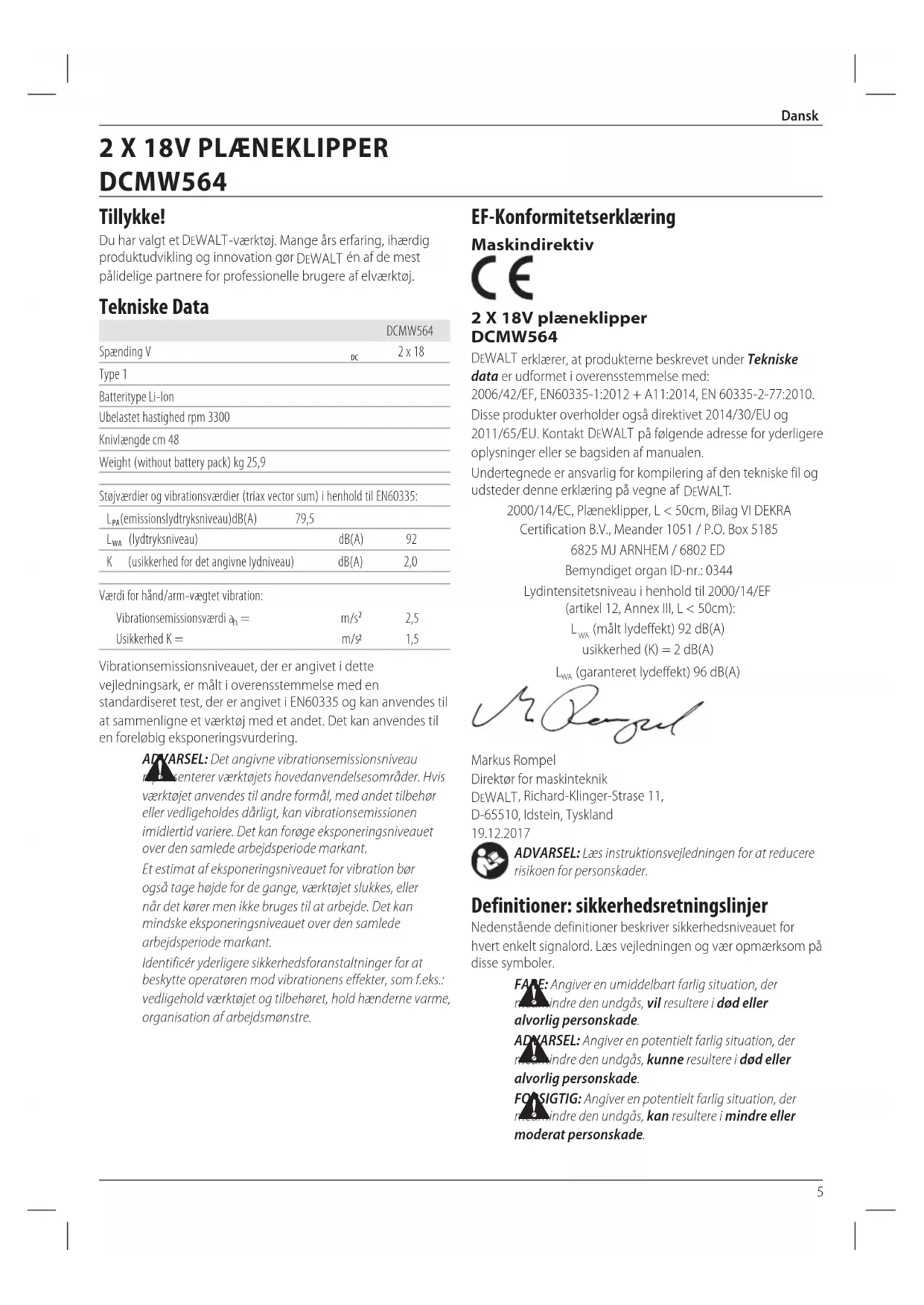 Undertegnede er ansvarlig for kompilering af den tekniske fil og udsteder denne erklæring på vegne af DEWALT.