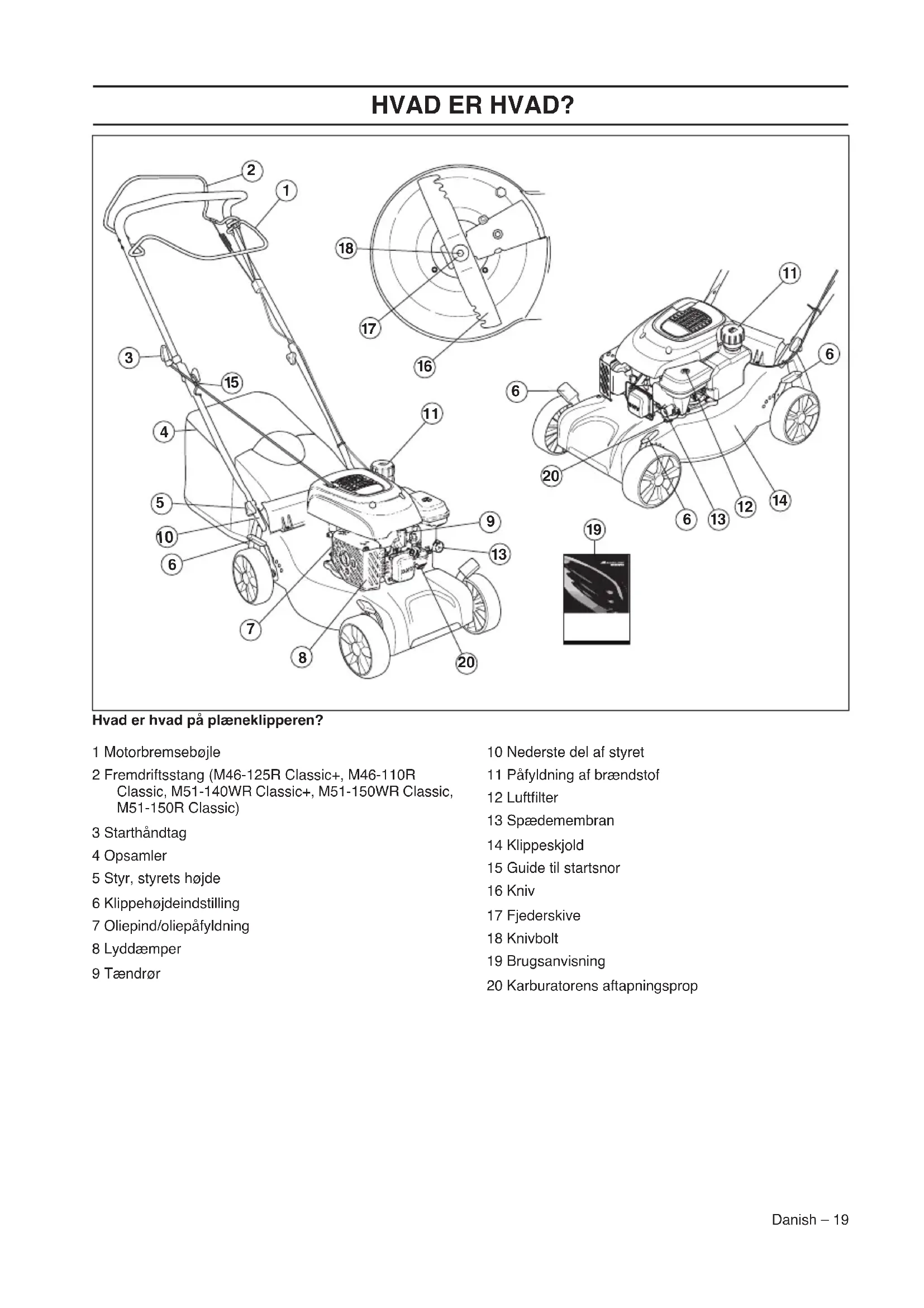 1 Motorbremsebøjle2 Fremdriftsstang (M46-125R Classic+, M46-110R Classic, M51-140WR Classic+, M51-150WR Classic, M51-150R Classic)3 Starthåndtag4 Opsamler5 Styr, styrets højde6 Klippehøjdeindstilling7 Oliepind/oliepåfyldning8 Lyddæmper9 Tændrør10 Nederste del af styret11 Påfyldning af brændstof12 Luftfilter13 Spædemembran14 Klippeskjold15 Guide til startsnor16 Kniv17 Fjederskive18 Knivbolt19 Brugsanvisning20 Karburatorens aftapningspropMASKINENS SIKKERHEDSUDSTYR 20 – Danish Generelt I dette afsnit forklares mere om maskinens sikkerhedsdetaljer, hvilken funktion de har, samt hvordan kontrol og vedligeholdelse skal udføres for at sikre, at de fungerer. Klippeskjold