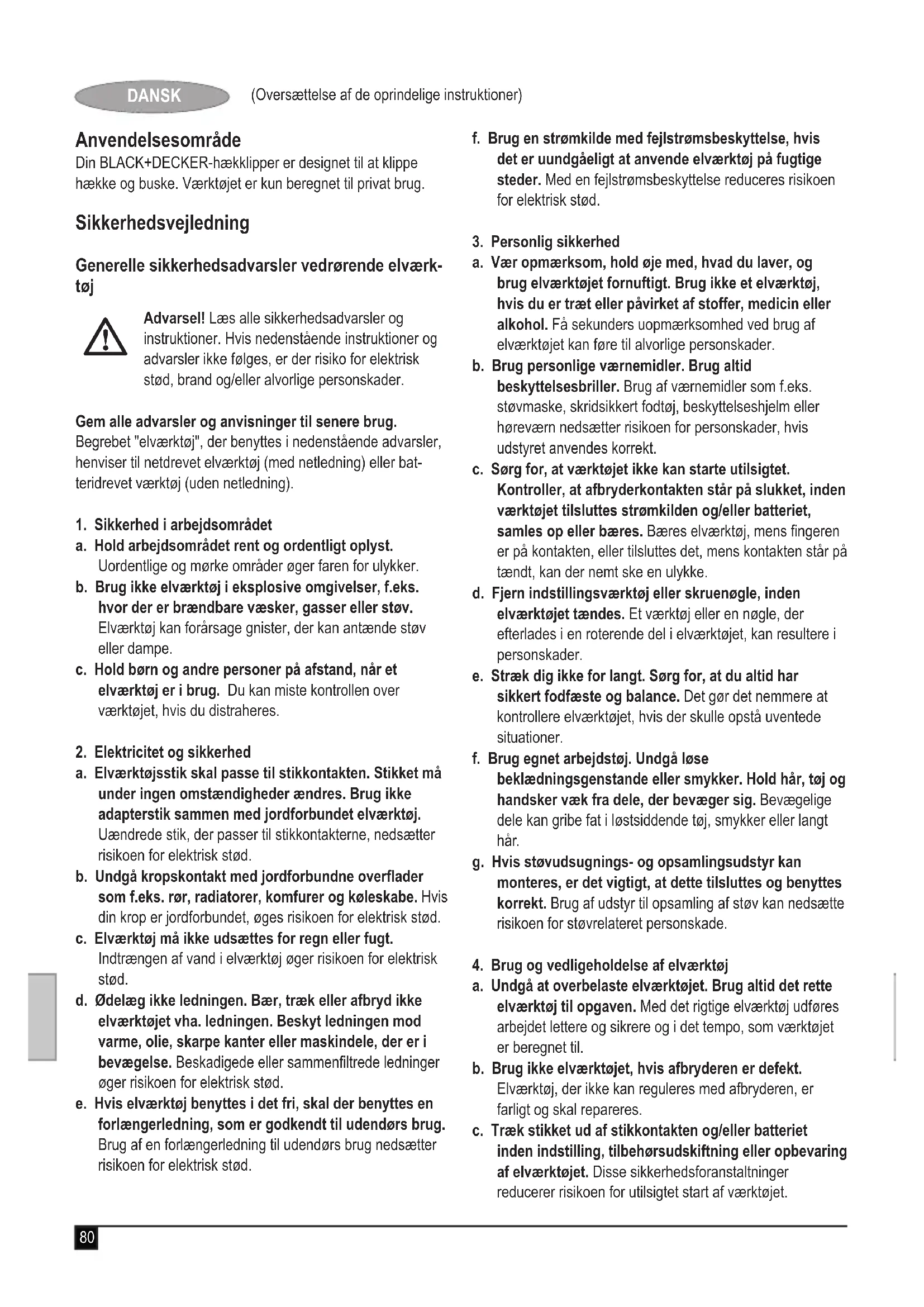 ) 97,7 dB(A) Disse produkter er endvidere i overensstemmelse med direktiv 2014/30/EU og 2011/65/EU. Kontakt Black & Decker på nedenstående adresse, eller se vejledningens bagside for at få ere oplysninger. Undertegnede er ansvarlig for udarbejdelsen af de tekniske data og fremsætter denne erklæring på vegne af Black & Decker. R. Laverick Engineering Manager Black & Decker Europe, 210 Bath Road, Slough, Berkshire, SL1 3YD United Kingdom 09/17/20014 Garanti Black & Decker garanterer, at produktet er fri for skader og fejl og tilbyder en fremragende garanti. Garantien er et tillæg til forbrugerens lovsikrede rettigheder og påvirker ikke disse. Ga- rantien gælder inden for medlemsstaterne af den Europæiske Union og i det Europæiske Frihandelsområde. Hvis et Black & Decker-produkt går i stykker på grund af materiel skade og/eller fabrikationsfejl eller på anden måde ikke fungerer i overensstemmelse med specikationen inden for 24 måneder fra købsdatoen, påtager Black & Decker sig at reparere eller ombytte produktet med mindst mulig ulempe for kunden. Garantien gælder ikke for fejl og mangler, der er sket i forbindelse med: u Produktet har været anvendt erhvervsmæssigt eller til udlejning. u Produktet har været anvendt forkert eller er ikke vedlige- holdt. u Produktet er beskadiget af fremmedlegemer, substanser eller pga. uheld. u Garantien gælder ikke, hvis reparationer er udført af andre end et autoriseret Black & Decker-værksted. For at udnytte garantien skal produktet og købskvitteringen indleveres til forhandleren eller til et autoriseret værksted. Kontakt det lokale Black & Decker-kontor på den adresse, der er opgivet i denne vejledning, for at få oplysninger om nærmeste autoriserede værksted. En liste over alle autoris- erede Black & Decker-serviceværksteder samt servicevilkår og kontaktpersoner er tilgængelig på internettet på adressen: www.2helpU.com Gå venligst ind på vores website www.blackanddecker.dk for at registrere dit nye produkt og for at blive holdt ajour om nye produkter og specialtilbud. Der ndes yderligere oplysninger om mærket BLACK+DECKER og vores produktsortiment på adressen www.blackanddecker.dk88 (Alkuperäisten ohjeiden käännös) SUOMI Käyttötarkoitus BLACK+DECKER -pensasleikkuri on tarkoitettu pensaiden leikkaamiseen. Tämä työkalu on tarkoitettu vain yksityiskäyt- töön. Turvallisuusohjeet Sähkötyökalujen yleiset turvavaroitukset