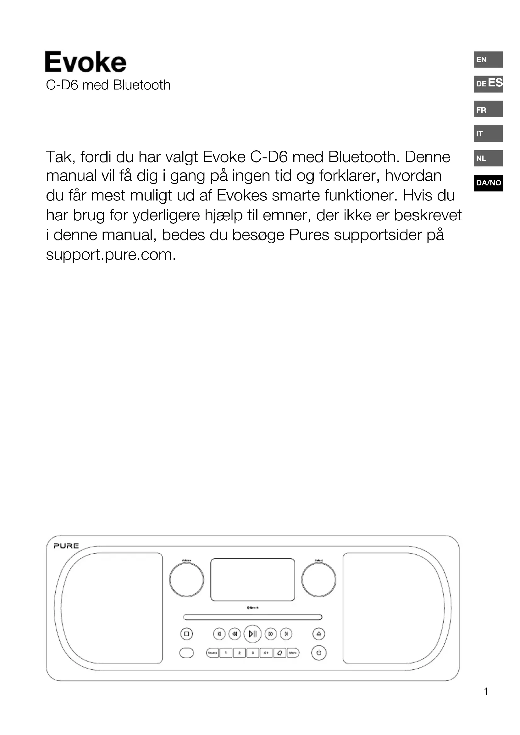 brug <Select>-knapperne på fjernbetjeningen for at vælge mellem en af de følgende indstillinger for rumbaseret equalizer-funktion: EQ1: Vælg denne indstilling, hvis du vil have en skarp og klar lyd, der er perfekt til steder som stuer og soveværelser. EQ2: Vælg denne indstilling, hvis du vil have en lidt blødere lydrespons, der passer til steder med hårdere materialer og overflader som f.eks. køkkener og udestuer.21 DA/NO Radio DABl- og FM-radio Frekvenser DAB/DAB+, FM-radio 87.5-108 MHz Cd-afspiller Afspilning af CD-R og CD-RW. Flere afspilningstilstande (gentag, vilkårlig osv.). Bluetooth Understøtter A2DP Højttaler 2x 3" højttalere med bred rækkevidde Indgangsstik 18 V DC-strømadapterstik (230 V medfølger), 3,5 mm AUX-indgang til AUX-enheder Udgangsstik 3,5 mm stereohovedtelefonstik Forudindstillinger 10 faste DAB-stationer og 10 faste FM-stationer Netstrømsadapter Adapter: Indgang AC 100-240 V~,50/60 Hz; Udgang DC 18 V , 2 A; Hovedenhed: DC 18 V , 2 A Mål 135 mm høj x 370 mm bred x 223 mm dyb Vægt 3,8 kg Antenne Indbygget teleskopantenne Godkendelser CE-mærket. Pure erklærer hermed, at denne Band II LPD-enhed opfylder grundlæggende krav og andre relevante bestemmelser i Rådets direktiv 1999/5/EF. Du kan finde overensstemmelseserklæringen på http://www.pure.com/about/r-tte-doc. I overensstemmelse med ETSI EN 300 401. Tekniske specifikationer22 Korrekt bortskaffelse af produktet Dette mærke angiver, at produktet ikke må bortskaffes sammen med det almindelige husholdningsaffald (EU-bestemmelse). For at undgå potentiel skade på miljøet eller på den menneskelige sundhed skal du bortskaffe det på en miljøstation med henblik på genvinding. Hvis der ikke findes en miljøstation i nærheden, kan du kontakte forhandleren, hvor du købte produktet. Forhandleren ved, hvordan produktet bortskaffes miljømæssigt korrekt. Copyright Copyright 2015 tilhører Imagination Technologies Limited. Alle rettigheder forbeholdes. Ingen del af denne publikation må kopieres, distribueres, sendes, transskriberes, lagres i et søgesystem eller oversættes til menneskeligt sprog eller computersprog, uanset form og metode, det være sig elektronisk, mekanisk, magnetisk, manuelt eller på anden måde, eller offentliggøres for tredjemand uden udtrykkelig skriftlig tilladelse fra Imagination Technologies Limited. Varemærker Evoke C-D6 med Bluetooth, Pure, Pure-logoet, Imagination Technologies og Imagination Technologies- logoet er varemærker eller registrerede varemærker tilhørende Imagination Technologies Limited. Alle andre produktnavne er varemærker tilhørende deres respektive ejere. Version 1, november 2015. Garantioplysninger Imagination Technologies Limited garanterer over for slutbrugeren, at dette produkt er fri for materiale- eller produktionsfejl i forbindelse med normal brug i en periode på tre år fra købsdatoen. Denne garanti dækker sammenbrud som følge af produktions- eller designmæssige fejl. Garantien gælder ikke i tilfælde af hændelig skade, uanset hvordan den måtte være opstået, slid og ælde, uagtsom adfærd, indstillinger, ændringer eller reparationer, som vi ikke har givet tilladelse til. Gå ind på account.pure.com for at registrere dit produkt hos os. Hvis du har problemer med enheden, kan du kontakte leverandøren eller Pure Support på den adresse, der fremgår af bagsiden af brugsanvisningen. Ansvarsfraskrivelse Imagination Technologies Limited yder ingen garanti i relation til indholdet af dette dokument og fraskriver sig især implicitte garantier for salgbarhed eller egnethed til et bestemt formål. Desuden forbeholder Imagination Technologies Limited sig retten til at revidere dokumentet og foretage ændringer uden forudgående varsel.Pure Imagination Technologies Limited Home Park Estate Kings Langley Herts, WD4 8LZ United Kingdom http://support.pure.com Pure Friedrich-Ludwig-Jahn-Straße 2-14 64589 Stockstadt/Rhein Deutschland http://support.pure.com Pure - Vertrieb uber: TELANOR AG Unterhaltungselektronik Bachstrasse 42 4654 Lostorf Schweiz/Switzerland info@telanor.ch www.telanor.chwww.pure.com connect.pure.com www.facebook.com/pure 106MA