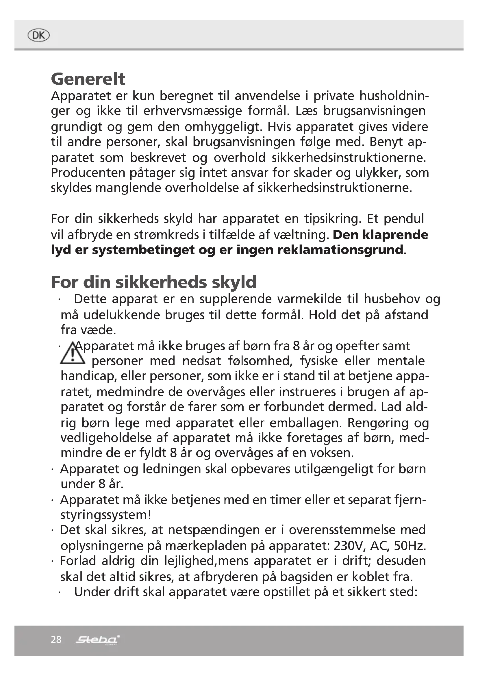 Generelt Apparatet er kun beregnet til anvendelse i private husholdnin- ger og ikke til erhvervsmæssige formål. Læs brugsanvisningen grundigt og gem den omhyggeligt. Hvis apparatet gives videre til andre personer, skal brugsanvisningen følge med. Benyt ap- paratet som beskrevet og overhold sikkerhedsinstruktionerne. Producenten påtager sig intet ansvar for skader og ulykker, som skyldes manglende overholdelse af sikkerhedsinstruktionerne. For din sikkerheds skyld har apparatet en tipsikring. Et pendul vil afbryde en strømkreds i tilfælde af væltning. Den klaprende lyd er systembetinget og er ingen reklamationsgrund. For din sikkerheds skyld ∙ Dette apparat er en supplerende varmekilde til husbehov og må udelukkende bruges til dette formål. Hold det på afstand fra væde. ∙ Apparatet må ikke bruges af børn fra 8 år og opefter samt personer med nedsat følsomhed, fysiske eller mentale handicap, eller personer, som ikke er i stand til at betjene appa- ratet, medmindre de overvåges eller instrueres i brugen af ap- paratet og forstår de farer som er forbundet dermed. Lad ald- rig børn lege med apparatet eller emballagen. Rengøring og vedligeholdelse af apparatet må ikke foretages af børn, med- mindre de er fyldt 8 år og overvåges af en voksen. ∙ Apparatet og ledningen skal opbevares utilgængeligt for børn under 8 år. ∙ Apparatet må ikke betjenes med en timer eller et separat fjern- styringssystem! ∙ Det skal sikres, at netspændingen er i overensstemmelse med oplysningerne på mærkepladen på apparatet: 230V, AC, 50Hz. ∙ Forlad aldrig din lejlighed,mens apparatet er i drift; desuden skal det altid sikres, at afbryderen på bagsiden er koblet fra. ∙ Under drift skal apparatet være opstillet på et sikkert sted:29 ∙ med en afstand på mindst 1 m fra brændbare genstande eller møbler; ∙ opstilles, således at slidserne til lufttilgang og luftafgang for- bliver fri: i en omkreds på 1 m fra afgangsslidserne og på 50 cm fra de bagerste udluftningsslidser må der ikke befinde sig nogle genstande; ∙ og må under ingen omstændigheder opstilles direkte under elektriske stikkontakter. ∙ Apparatet er ikke noget legetøj: det skal opstilles utilgængeligt for børn og dyr. Vær opmærksom på, at børn ikke kommer til at lege med emballage (f. eks. plastposer) ! ∙ OBS! Under drift kan udluftningsslidserne blive yderst varme (over 80°C = 175°F); speciel opmærksomhed er nødvendig, hvis der er børn eller sårbare personer til stede. ∙ VIGTIG: Til undgåelse af overophedning må ap- paratet tildækkes på ingen måde. Der må ikke lægges nogle genstande eller tekstiler på det idriftsatte apparat. Dette er anført klart og tyde- ligt på apparatet eller på symbolet! ∙ Apparatet må under ingen omstændigheder bruges i lokaler, som er mættet med eksplosive gasser, dampe fra opløsnings- midler eller lakker eller generelt med antændelige dampe eller gasser. ∙ Reparationer som følge af et beskadiget eller et kabel, som skal udskiftes, må under ingen omstændigheder udføres selv: Ap- paratet skal afleveres til en autoriseret reparationsservice, da samtlige arbejder i hvert enkelt tilfælde skal udføres af fagud- dannet personale, for at undgå skader. ∙ Apparatet må under ingen omstændigheder bruges i nærhe- den af brusebade, badekar, svømmebassiner eller håndvaske. Apparatet skal opstilles, således at stikkontakten under alle omstændigheder er tilgængelig. ∙ Vær forsigtig, når du bruger en forlængerledning, at børn ikke trækker på det eller falde over det opstår.30 ∙ Når enheden ikke er under opsyn, ikke er samlet sammen, byg- get fra hinanden eller rengøres, skal stikket trækkes ud af stik- kontakten. Montering Både elektrodelen og bundpladen skal tages ud af emballagen. Den store plastmøtrik på underdelen af elektrodelen skal fjernes. Den runde plade sættes på apparatet med fødderne nedad og skrues fast med møtrikken. Sikker opstilling ∙ Apparatet må kun opstilles på et plant og stabilt underlag. ∙ Apparatet må under ingen omstændigheder kunne nås af per- soner, som befinder sig i badekar eller i brusebad. ∙ Kablet må ikke lægges under gulvtæpper. ∙ Vær opmærksom på, at kablet til apparatet altid skal være fuld- stændigt viklet af under brugen. ∙ Apparatet må ikke bruges i små lokaler, hvis der befinder sig personer i lokalet, som ikke er i stand til at forlade lokalet selv- stændigt, medmindre der er sørget for uafbrudt opsyn. Benyttelse af apparatet ∙ Indstil hovedafbryderen på bagsiden af apparatet. ∙ Tryk på tasten . På displayet begynder den aktuelle rumtemperatur at lyse. ∙ Tryk én gang på tasten SET 1. På displayet blinker „0H“. Med + tasten indstilles den ønskede tid frem til „12H“ med 1 times skridt. SET-tasten trykkes endnu en gang. ∙ På displayet blinker 25°C. Med +/- tasten indstilles temperaturen med 1°C skridt. ∙ Ved tryk på effekttasten reguleres varmeydelsen fra Low (1300 watt) til High (2500 watt). ∙ Tryk på SET-tasten; apparatet begynder at arbejde. ∙ Hvis man ønsker, at apparatet skal opvarme i kontinuerlig drift, skal SET-tasten trykkes 2 gange, den ønskede temperatur indtastes og der trykkes på SET-tasten igen. ∙ Tasten er beregnet til indstilling af oscillering. ∙ Efter udløb af den indstillede tid vil apparatet slukkes. Også under drift kan der slukkes for apparatet ved hjælp af tasten . Blæseren slukkes forsinket med ca. 15 sekunder til afkøling. ∙ Efter brug skal der slukkes for hovedafbryderen. Når apparatet benyttes første gang, kan det dampe let og kortvarigt på grund af produktionsolien.31 Benyttelse af apparatet ∙ 1800 W (Oscillation) ∙ 900 W (Oscillation) ∙ OFF ∙ 900 W ∙ 1800 W Oscillation : ∙ Gennem anvendelse af drejefunktionen (oscillation) opnår man en mere ensartet temperatur i området der opvarmes. ∙ Bloker aldrig apparatet fra at kunne dreje. Betjening af termostatet ∙ I et r