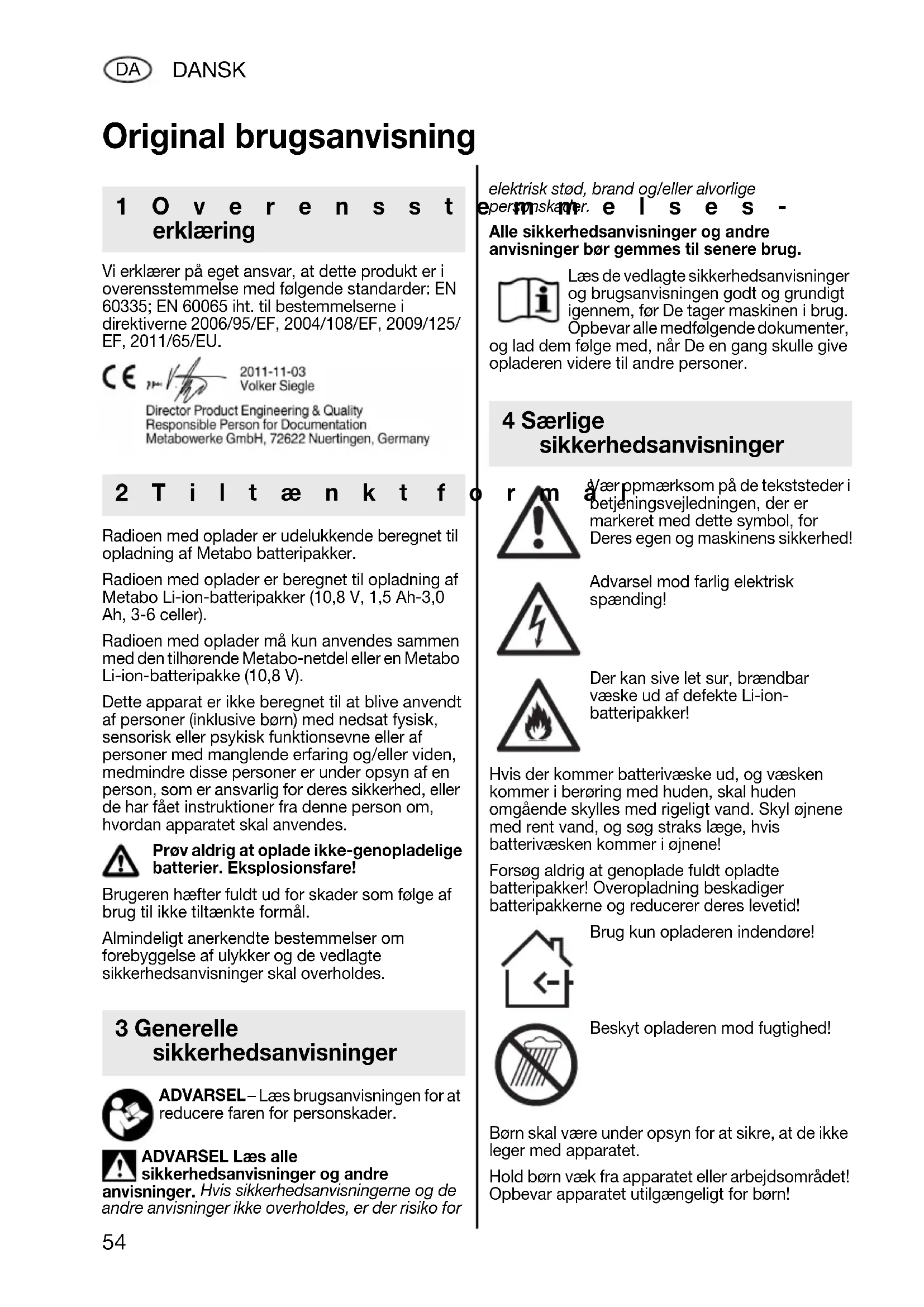 Vi erklærer på eget ansvar, at dette produkt er i overensstemmelse med følgende standarder: EN 60335; EN 60065 iht. til bestemmelserne i direktiverne 2006/95/EF, 2004/108/EF, 2009/125/ EF, 2011/65/EU. Radioen med oplader er udelukkende beregnet til opladning af Metabo batteripakker. Radioen med oplader er beregnet til opladning af Metabo Li-ion-batteripakker (10,8 V, 1,5 Ah-3,0 Ah, 3-6 celler). Radioen med oplader må kun anvendes sammen med den tilhørende Metabo-netdel eller en Metabo Li-ion-batteripakke (10,8 V). Dette apparat er ikke beregnet til at blive anvendt af personer (inklusive børn) med nedsat fysisk, sensorisk eller psykisk funktionsevne eller af personer med manglende erfaring og/eller viden, medmindre disse personer er under opsyn af en person, som er ansvarlig for deres sikkerhed, eller de har fået instruktioner fra denne person om, hvordan apparatet skal anvendes. Prøv aldrig at oplade ikke-genopladelige batterier. Eksplosionsfare! Brugeren hæfter fuldt ud for skader som følge af brug til ikke tiltænkte formål. Almindeligt anerkendte bestemmelser om forebyggelse af ulykker og de vedlagte sikkerhedsanvisninger skal overholdes. ADVARSEL – Læs brugsanvisningen for at reducere faren for personskader. ADVARSEL Læs alle sikkerhedsanvisninger og andre anvisninger. Hvis sikkerhedsanvisningerne og de andre anvisninger ikke overholdes, er der risiko for elektrisk stød, brand og/eller alvorlige personskader. Alle sikkerhedsanvisninger og andre anvisninger bør gemmes til senere brug. Læs de vedlagte sikkerhedsanvisninger og brugsanvisningen godt og grundigt igennem, før De tager maskinen i brug. Opbevar alle medfølgende dokumenter, og lad dem følge med, når De en gang skulle give opladeren videre til andre personer. Vær opmærksom på de tekststeder i betjeningsvejledningen, der er markeret med dette symbol, for Deres egen og maskinens sikkerhed! Advarsel mod farlig elektrisk spænding! Der kan sive let sur, brændbar væske ud af defekte Li-ion- batteripakker! Hvis der kommer batterivæske ud, og væsken kommer i berøring med huden, skal huden omgående skylles med rigeligt vand. Skyl øjnene med rent vand, og søg straks læge, hvis batterivæsken kommer i øjnene! Forsøg aldrig at genoplade fuldt opladte batteripakker! Overopladning beskadiger batteripakkerne og reducerer deres levetid! Brug kun opladeren indendøre! Beskyt opladeren mod fugtighed! Børn skal være under opsyn for at sikre, at de ikke leger med apparatet. Hold børn væk fra apparatet eller arbejdsområdet! Opbevar apparatet utilgængeligt for børn! Original brugsanvisning 1Overensstemmelses- erklæring 2Tiltænkt formål 3 Generelle sikkerhedsanvisninger 4 Særlige sikkerhedsanvisningerDANSK