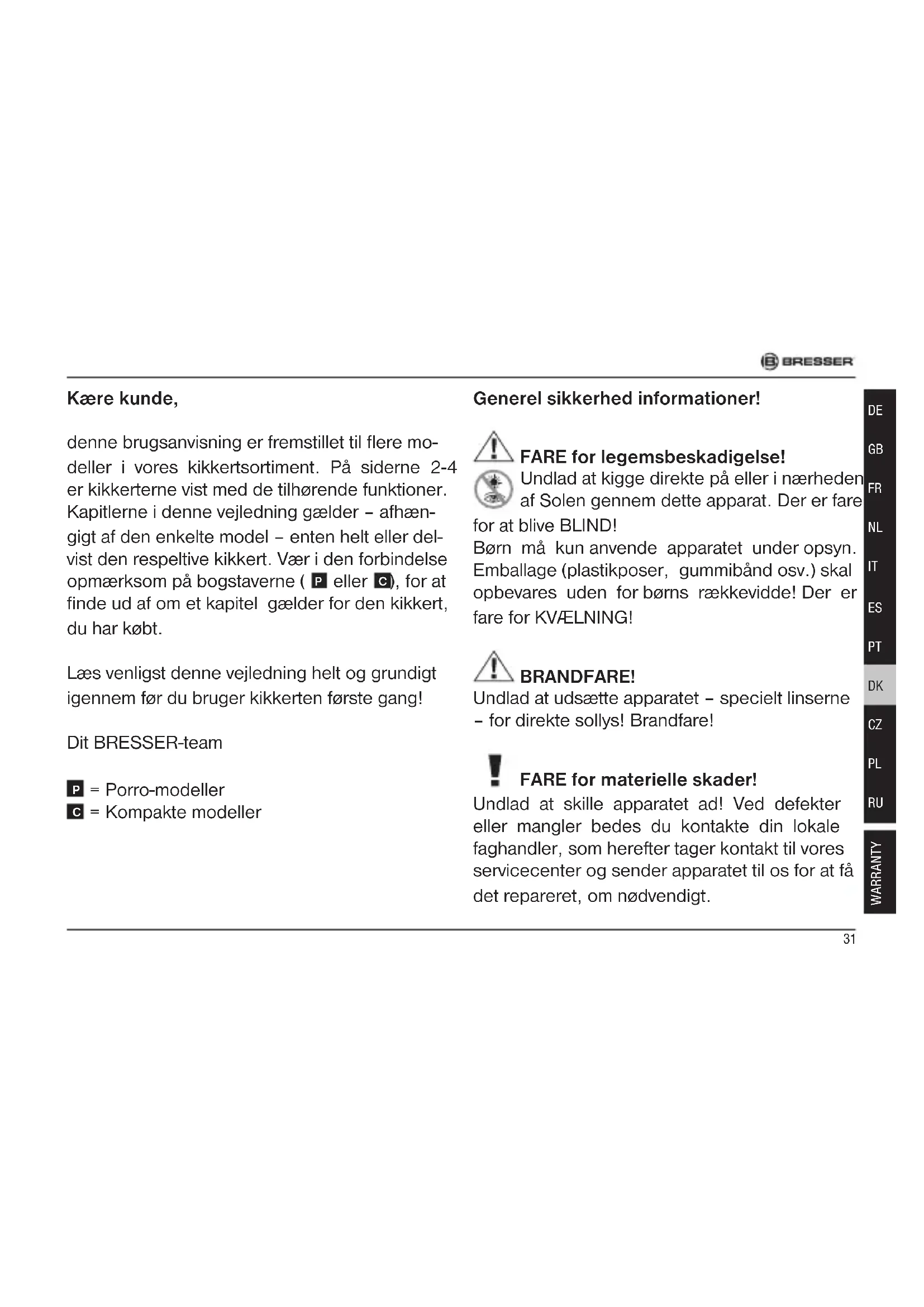 ), for at finde ud af om et kapitel gælder for den kikkert, du har købt. Læs venligst denne vejledning helt og grundigt igennem før du bruger kikkerten første gang! Dit BRESSER-team