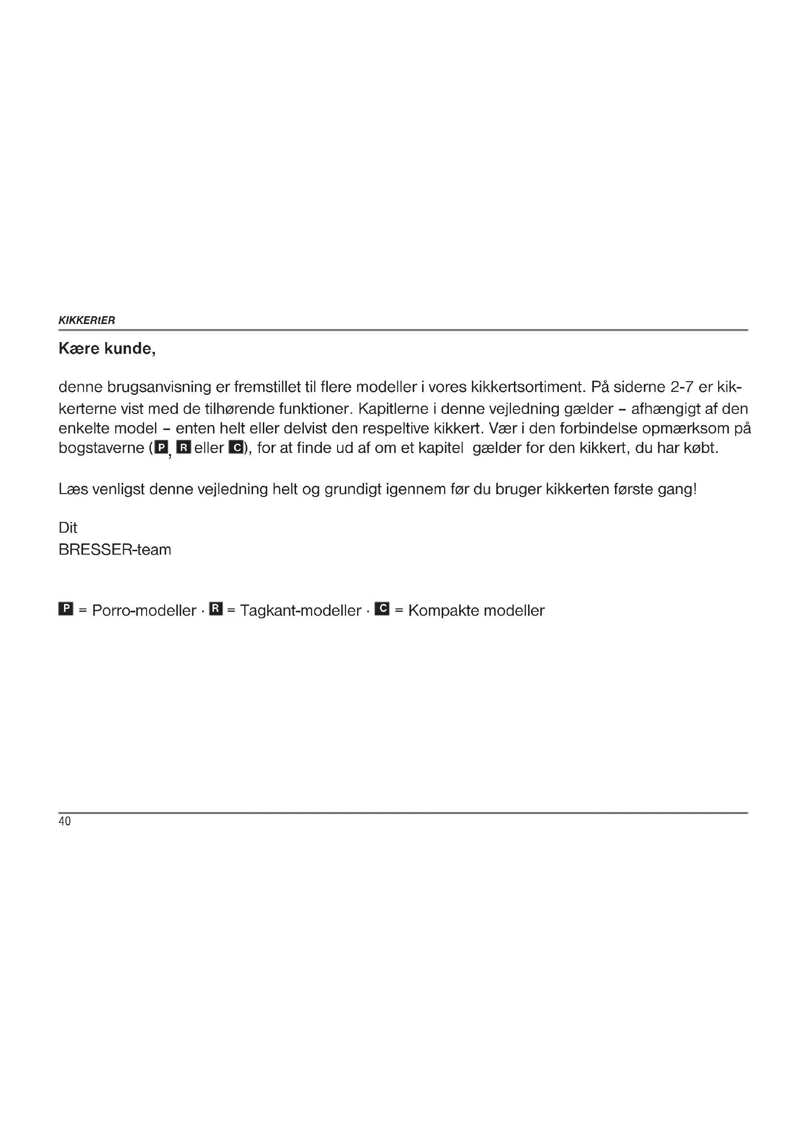 ), for at finde ud af om et kapitel gælder for den kikkert, du har købt. Læs venligst denne vejledning helt og grundigt igennem før du bruger kikkerten første gang! Dit BRESSER-team
