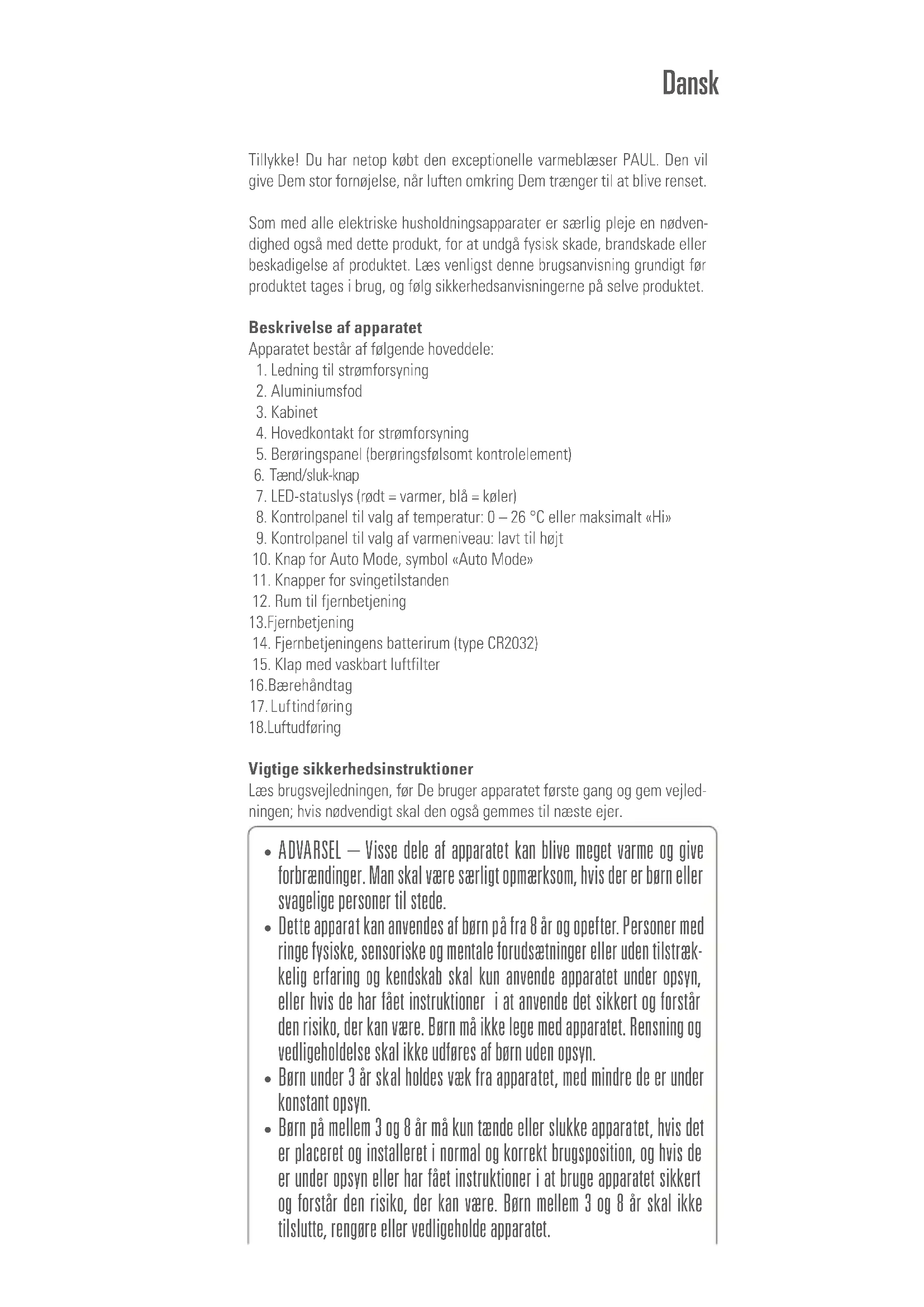 Tillykke! Du har netop kobt den exceptionelle varmeblaeser PAUL. Den vil give Dem stor fornjelse, narr luften omkring Dem traenger til at blive renset.