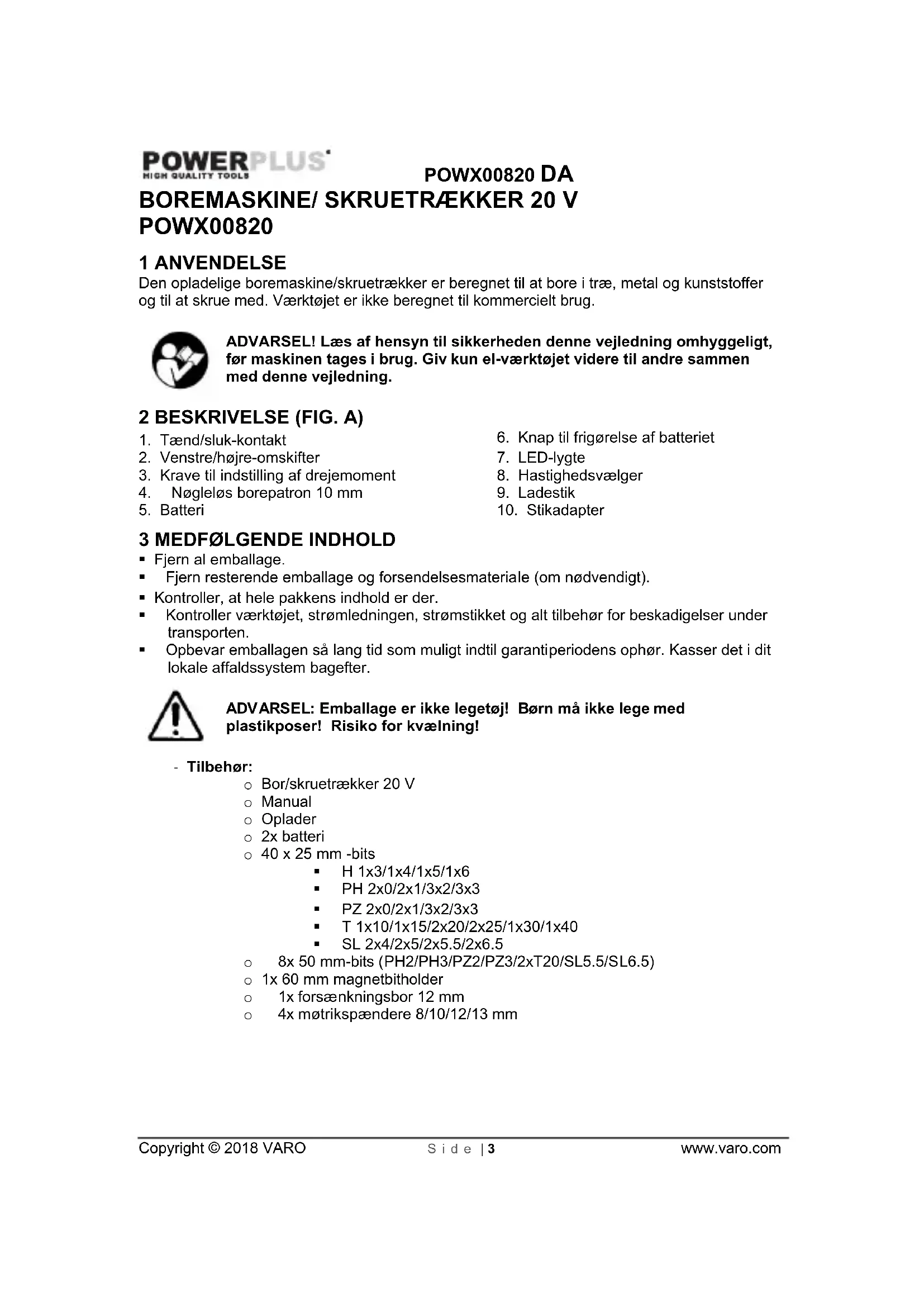 Fjern al emballage. Fjern resterende emballage og forsendelsesmateriale (om nødvendigt). Kontroller, at hele pakkens indhold er der. Kontroller værktøjet, strømledningen, strømstikket og alt tilbehør for beskadigelser under transporten. Opbevar emballagen så lang tid som muligt indtil garantiperiodens ophør. Kasser det i dit lokale affaldssystem bagefter. ADVARSEL: Emballage er ikke legetøj! Børn må ikke lege med plastikposer! Risiko for kvælning! - Tilbehør: o Bor/skruetrækker 20 V o Manual o Oplader o 2x batteri o 40 x 25 mm -bits H 1x3/1x4/1x5/1x6 PH 2x0/2x1/3x2/3x3 PZ 2x0/2x1/3x2/3x3 T 1x10/1x15/2x20/2x25/1x30/1x40 SL 2x4/2x5/2x5.5/2x6.5 o 8x 50 mm-bits (PH2/PH3/PZ2/PZ3/2xT20/SL5.5/SL6.5) o 1x 60 mm magnetbitholder o 1x forsænkningsbor 12 mm o 4x møtrikspændere 8/10/12/13 mmPOWX00820 DA Copyright © 2018 VARO Side | 4 www.varo.com o 8x HSS: Bor (3.0/3.5/4.0/4.5/5.0/5.5/6.0/6.5 mm) o 5 x stenbor: Bor (4.0/5.0/6.0/8.0/10.0 mm) o 5 x træbor: Bor (4.0/5.0/6.0/8.0/10.0 mm) o 2 x fladt træbor: Bor (16.0/20.0 mm) Kontakt venligst forhandleren, når der mangler dele, eller de er beskadigede. 4 SYMBOLER I denne brugervejledning og/eller på maskinen anvendes der følgende piktogrammer: Symboliserer risiko for personskader eller skader på værktøjet.
