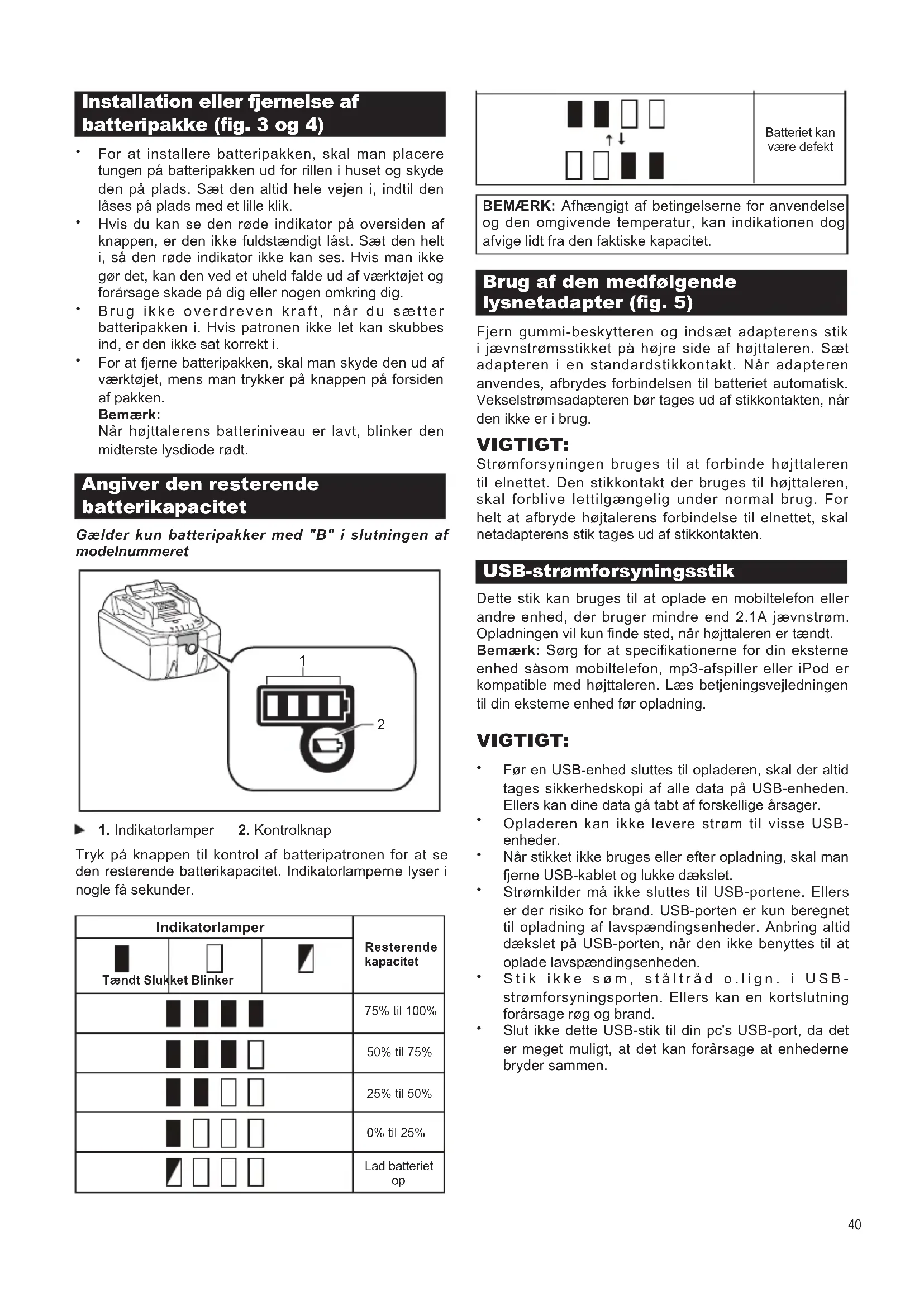 Angiver den resterende batterikapacitet Gælder kun batteripakker med "B" i slutningen af modelnummeret Tryk på knappen til kontrol af batteripatronen for at se den resterende batterikapacitet. Indikatorlamperne lyser i nogle få sekunder. Brug af den medfølgende lysnetadapter (g. 5) Fjern gummi-beskytteren og indsæt adapterens stik i jævnstrømsstikket på højre side af højttaleren. Sæt adapteren i en standardstikkontakt. Når adapteren anvendes, afbrydes forbindelsen til batteriet automatisk. Vekselstrømsadapteren bør tages ud af stikkontakten, når den ikke er i brug. VIGTIGT: Strømforsyningen bruges til at forbinde højttaleren til elnettet. Den stikkontakt der bruges til højttaleren, skal forblive lettilgængelig under normal brug. For helt at afbryde højtalerens forbindelse til elnettet, skal netadapterens stik tages ud af stikkontakten. USB-strømforsyningsstik Dette stik kan bruges til at oplade en mobiltelefon eller andre enhed, der bruger mindre end 2.1A jævnstrøm. Opladningen vil kun nde sted, når højttaleren er tændt. Bemærk: Sørg for at specifikationerne for din eksterne enhed såsom mobiltelefon, mp3-afspiller eller iPod er kompatible med højttaleren. Læs betjeningsvejledningen til din eksterne enhed før opladning. VIGTIGT: