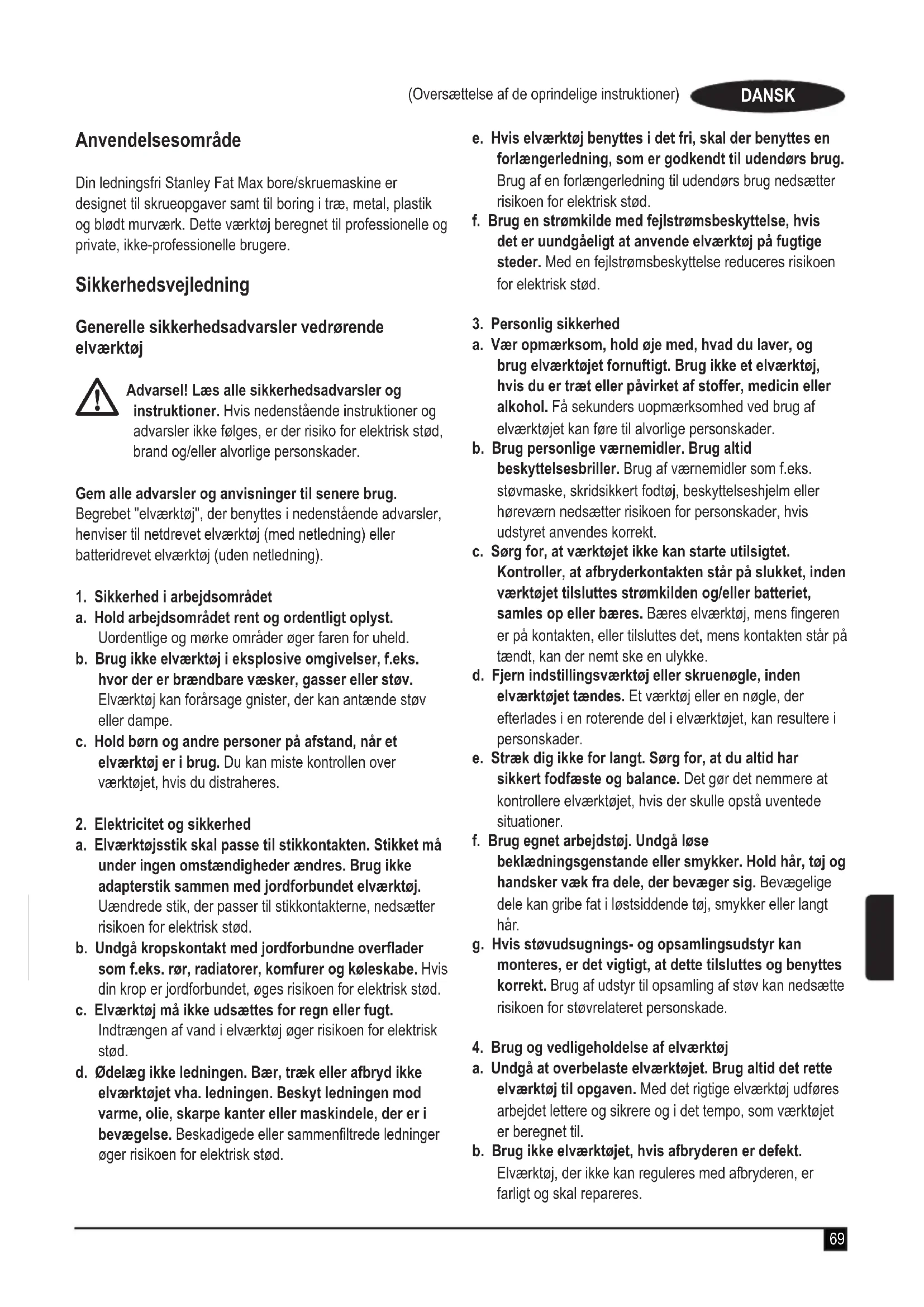 Hvis dit Stanley Fat Max-produkt går i stykker på grund af materiel skade eller fabrikationsfejl inden for 12 måneder fra købsdatoen, påtager Stanley Europe sig gratis at udskifte alle defekte dele eller efter vores skøn gratis at udskifte enheden forudsat at: u Produktet ikke har været anvendt forkert og har været anvendt i overensstemmelse med brugervejledningen. u Produktet ikke har været udsat for andet end almindelig slitage; u Reparationer ikke er udført af uautoriserede personer; u Købsbeviset kan fremvises. u Hele Stanley Fat Max-produktet returneres med alle originale komponenter Hvis du ønsker erstatning for skade, skal du kontakte forhandleren eller det nærmeste autoriserede Stanley Fat Max-værksted i Stanley Fat Max-kataloget eller kontakte dit lokale Stanley-kontor på den adresse, der er opgivet i denne vejledning. Der ndes en liste over alle autoriserede Stanley Fat Max-serviceværksteder samt servicevilkår på følgende internetadresse:www.stanley.eu/376 (Alkuperäisten ohjeiden käännös) SUOMI Käyttötarkoitus Stanley Fat Max -pora/ruuvinväännin on tarkoitettu ruuvien kiinnittämiseen sekä puun, metallin, muovin ja pehmeän betonin poraamiseen. Tämä työkalu on tarkoitettu ammattikäyttöön ja yksityiseen, ei ammattikäyttäjille. Turvallisuusohjeet Sähkötyökalujen yleiset turvavaroitukset