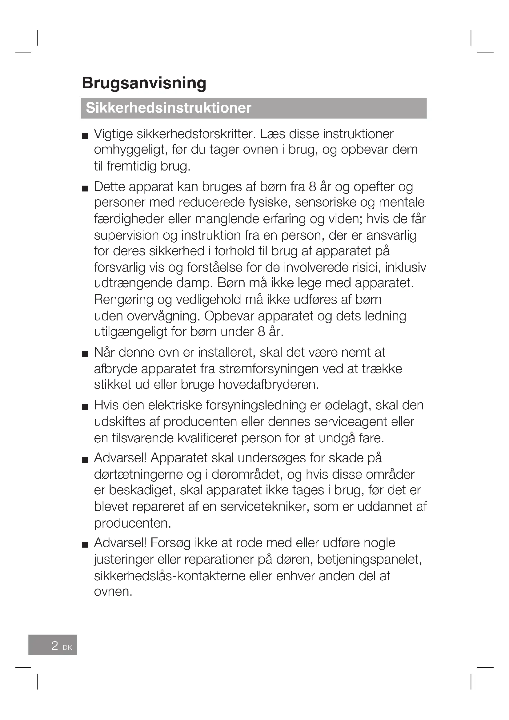 fra 8 år og opefter og personer med reducerede fysiske, sensoriske og mentale færdigheder eller manglende erfaring og viden; hvis de får supervision og instruktion fra en person, der er ansvarlig for deres sikkerhed i forhold til brug af apparatet på forsvarlig vis og forståelse for de involverede risici, inklusiv udtrængende damp. Børn må ikke lege med apparatet. Rengøring og vedligehold må ikke udføres af børn uden overvågning. Opbevar apparatet og dets ledning utilgængeligt for børn under 8 år. Læs omhyggeligt og opbevar til fremtidig brug. Vigtige sikkerhedsforskrifter Dette apparat producerer kogende varm damp.11 DK Dansk Brug af din ovn
