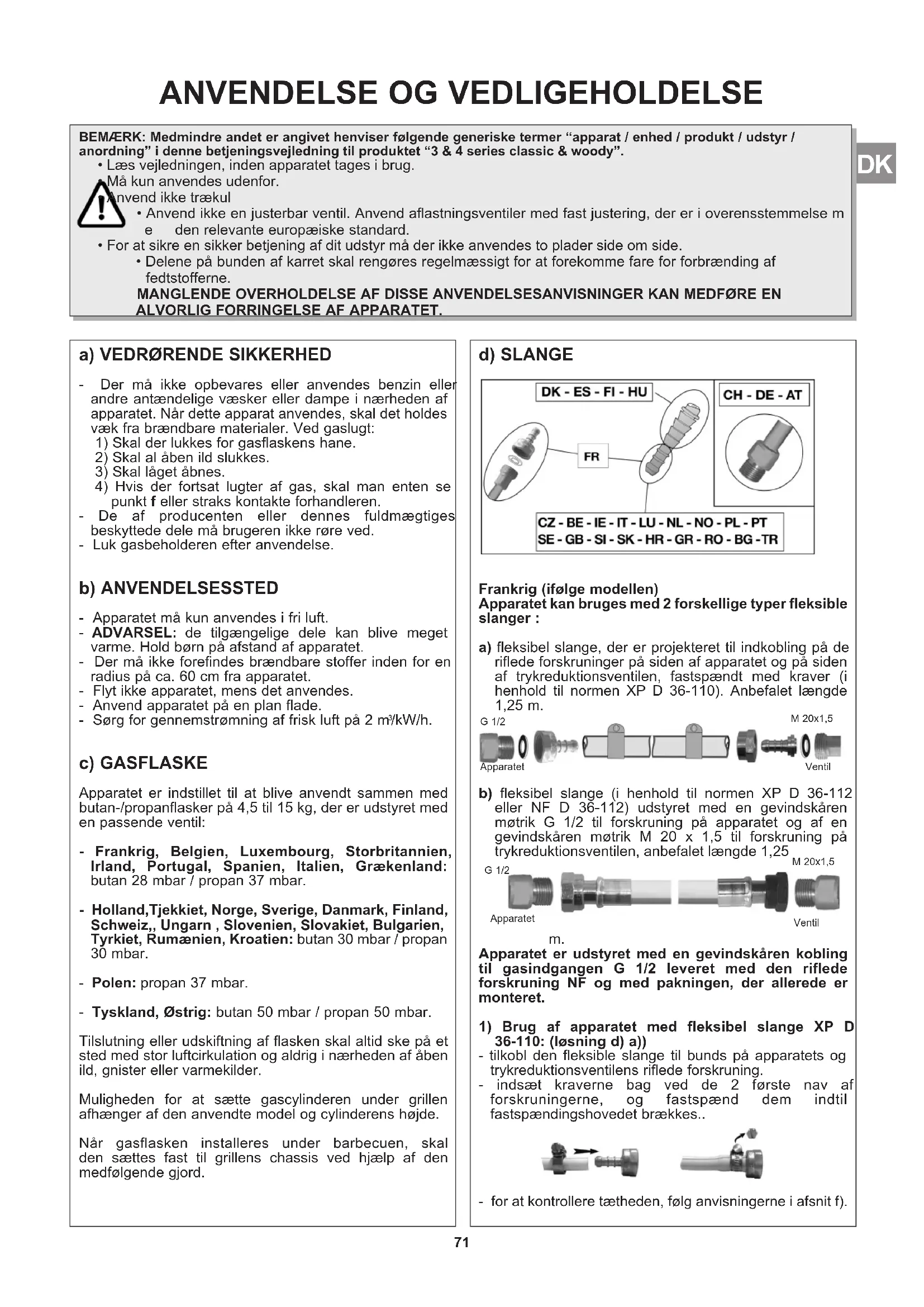 /kW/h. c) GASFLASKE Apparatet er indstillet til at blive anvendt sammen med butan-/propanflasker på 4,5 til 15 kg, der er udstyret med en passende ventil: - Frankrig, Belgien, Luxembourg, Storbritannien, Irland, Portugal, Spanien, Italien, Grækenland: butan 28 mbar / propan 37 mbar. - Holland,Tjekkiet, Norge, Sverige, Danmark, Finland, Schweiz,, Ungarn , Slovenien, Slovakiet, Bulgarien, Tyrkiet, Rumænien, Kroatien: butan 30 mbar / propan 30 mbar. - Polen: propan 37 mbar. - Tyskland, Østrig: butan 50 mbar / propan 50 mbar. Tilslutning eller udskiftning af flasken skal altid ske på et sted med stor luftcirkulation og aldrig i nærheden af åben ild, gnister eller varmekilder. Muligheden for at sætte gascylinderen under grillen afhænger af den anvendte model og cylinderens højde. Når gasflasken installeres under barbecuen, skal den sættes fast til grillens chassis ved hjælp af den medfølgende gjord. d) SLANGE Frankrig (ifølge modellen) Apparatet kan bruges med 2 forskellige typer fleksible slanger : a) fleksibel slange, der er projekteret til indkobling på de riflede forskruninger på siden af apparatet og på siden af trykreduktionsventilen, fastspændt med kraver (i henhold til normen XP D 36-110). Anbefalet længde 1,25 m. b) fleksibel slange (i henhold til normen XP D 36-112 eller NF D 36-112) udstyret med en gevindskåren møtrik G 1/2 til forskruning på apparatet og af en gevindskåren møtrik M 20 x 1,5 til forskruning på trykreduktionsventilen, anbefalet længde 1,25
