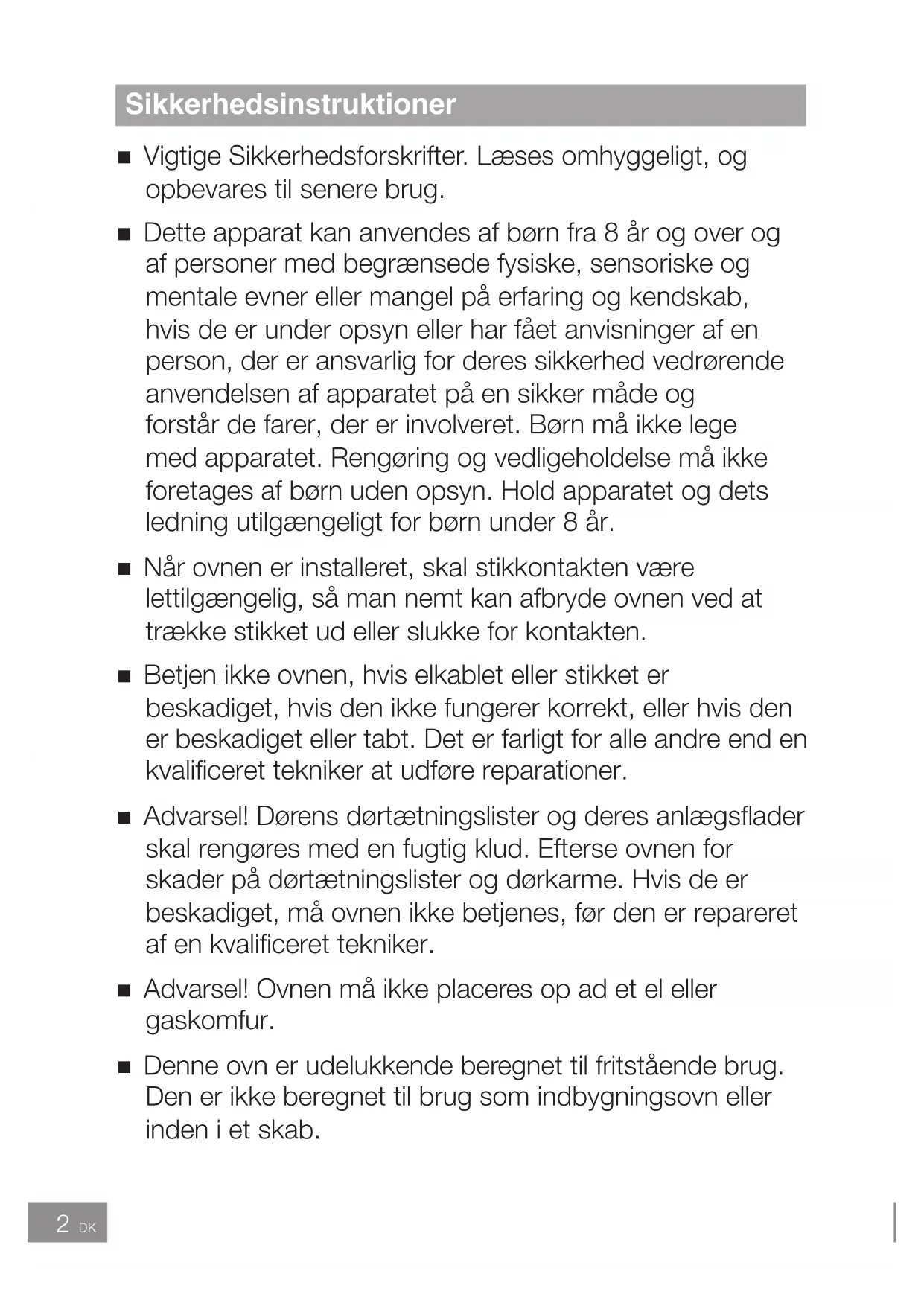 af ovnen må ikke blokeres Hvis disse åbninger blokeres under brugen, er der risiko for, at ovnen overophedes Hvis dette sker, er ovnen beskyttet af en varmesikkerhedsanordning og kan først benyttes igen, efter at den er kølet af Opstilling af ovnen Installation og tilslutning 5 cm 15 cm10 cm Åben Bordplade8 DK Sådan bruges ovnen 1 Brug ikke ovnen til andet end at tilberede mad Denne ovn er beregnet til tilberedning af mad Den må derfor ikke bruges til opvarmning af kemikalier eller andre nonfood-produkter 2 Når ovnen ikke anvendes, må der ikke opbevares genstande i ovnen, hvis den utilsigtet skulle blive tændt 3 Ovnen må ikke køres på mikrobølger, uden at der er mad i ovnen. En sådan betjening kan skade ovnen 4 Hvis der kommer røg ud af apparatet, eller der opstår brand i ovnen, trykkes der på knappen Stop/Annuller og døren efterlades lukket for at kunne kvæle eventuelle ammer. Træk stikket ud af væggen eller sluk for strømmen ved sikringsrelæet eller hovedafbryderen 5 Kontroller før brug, at skåle, fade og andet er egnet til brug i mikrobølgeovn 6 Mikroovnen er kun beregnet til opvarmning af mad og drikkevarer Vær forsigtig når du opvarmer mad med lavt væskeindhold, feks brød, chokolade, kiks og bagværk De kan let blive brændt, tørre ud eller bryde i brand, hvis de tilberedes for længe Vi anbefaler ikke at opvarme mad med lavt væskeindhold som popcorn og papadams Tørring af mad, aviser eller tøj og opvarmning af varmepuder, hjemmesko, rengøringsvampe, våde klude, hvedepuder, varmtvandsasker og lignende kan medføre risiko for personskade, antændelse eller brand Ventilatorfunktion Efter brug af ovnen kan ventilatoren køre i nogle få minutter for at nedkøle de elektroniske komponenter Dette er normalt, og du kan tage maden ud, selvom ventilatoren kører Du kan fortsætte med at bruge ovnen i løbet af denne tid