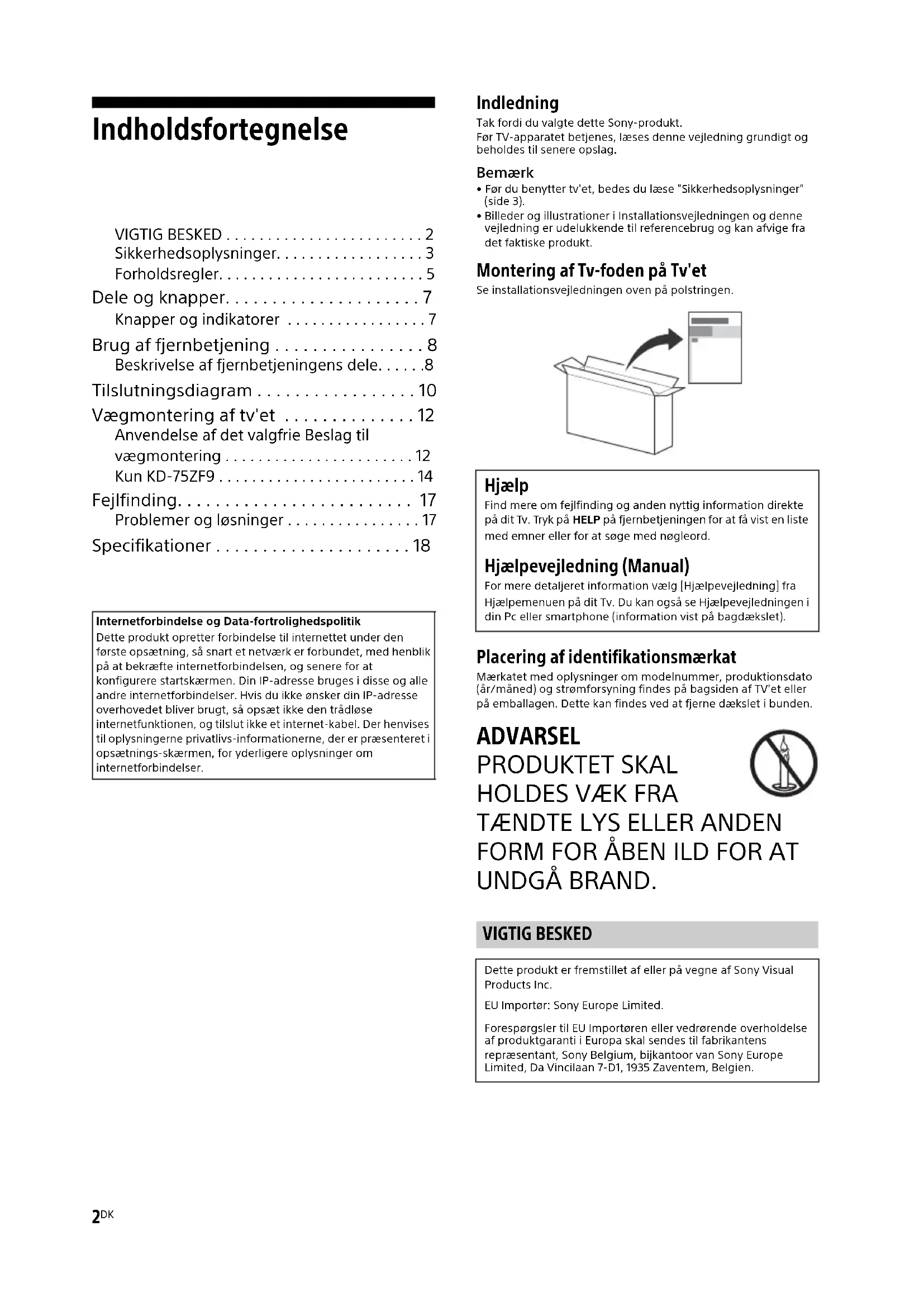 UNDGÅ BRAND. Internetforbindelse og Data-fortrolighedspolitikDette produkt opretter forbindelse til internettet under den første opsætning, så snart et netværk er forbundet, med henblik på at bekræfte internetforbindelsen, og senere for at konfigurere startskærmen. Din IP-adresse bruges i disse og alle andre internetforbindelser. Hvis du ikke ønsker din IP-adresse overhovedet bliver brugt, så opsæt ikke den trådløse internetfunktionen, og tilslut ikke et internet-kabel. Der henvises til oplysningerne privatlivs-informationerne, der er præsenteret i opsætnings-skærmen, for yderligere oplysninger om internetforbindelser. Hjælp Find mere om fejlfinding og anden nyttig information direkte på dit Tv. Tryk på HELP på fjernbetjeningen for at få vist en liste med emner eller for at søge med nøgleord. Hjælpevejledning (Manual) For mere detaljeret information vælg [Hjælpevejledning] fra Hjælpemenuen på dit Tv. Du kan også se Hjælpevejledningen i din Pc eller smartphone (information vist på bagdækslet). VIGTIG BESKED Dette produkt er fremstillet af eller på vegne af Sony Visual Products Inc.EU Importør: Sony Europe Limited.Forespørgsler til EU Importøren eller vedrørende overholdelse f produktgaranti i Europa skal sendes til fabrikantens repræsentant, Sony Belgium, bijkantoor van Sony Europe Limited, Da Vincilaan 7-D1, 1935 Zaventem, Belgien.3