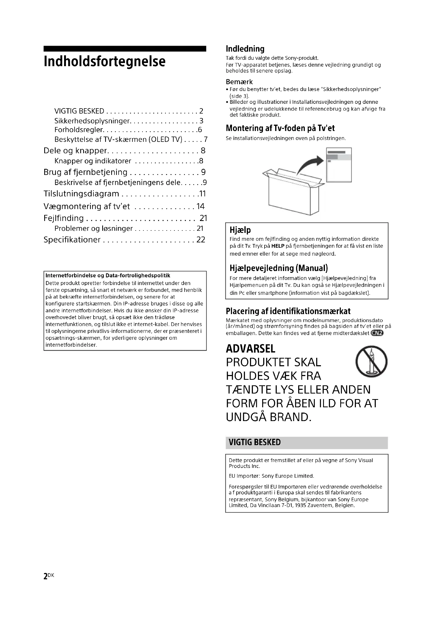 UNDGÅ BRAND. Internetforbindelse og Data-fortrolighedspolitikDette produkt opretter forbindelse til internettet under den første opsætning, så snart et netværk er forbundet, med henblik på at bekræfte internetforbindelsen, og senere for at konfigurere startskærmen. Din IP-adresse bruges i disse og alle andre internetforbindelser. Hvis du ikke ønsker din IP-adresse overhovedet bliver brugt, så opsæt ikke den trådløse internetfunktionen, og tilslut ikke et internet-kabel. Der henvises til oplysningerne privatlivs-informationerne, der er præsenteret i opsætnings-skærmen, for yderligere oplysninger om internetforbindelser. Hjælp Find mere om fejlfinding og anden nyttig information direkte på dit Tv. Tryk på HELP på fjernbetjeningen for at få vist en liste med emner eller for at søge med nøgleord. Hjælpevejledning (Manual) For mere detaljeret information vælg [Hjælpevejledning] fra Hjælpemenuen på dit Tv. Du kan også se Hjælpevejledningen i din Pc eller smartphone (information vist på bagdækslet). VIGTIG BESKED Dette produkt er fremstillet af eller på vegne af Sony Visual Products Inc.EU Importør: Sony Europe Limited.Forespørgsler til EU Importøren eller vedrørende overholdelse f produktgaranti i Europa skal sendes til fabrikantens repræsentant, Sony Belgium, bijkantoor van Sony Europe Limited, Da Vincilaan 7-D1, 1935 Zaventem, Belgien.3