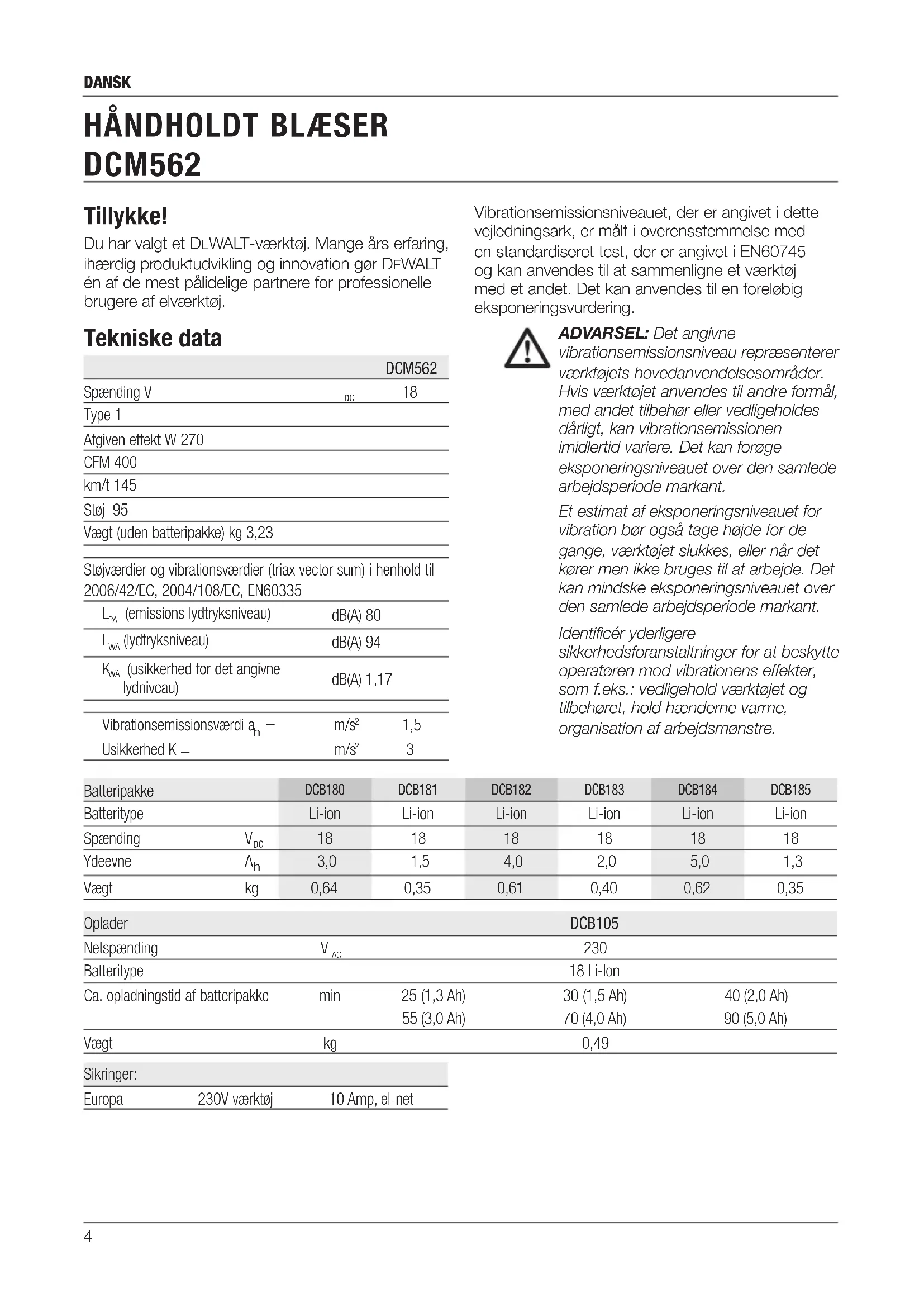 Dansk Tillykke! Du har valgt et DeWALT-værktøj. Mange års erfaring, ihærdig produktudvikling og innovation gør DeWALT én af de mest pålidelige partnere for professionelle brugere af elværktøj. Tekniske data DCM562 Spænding V