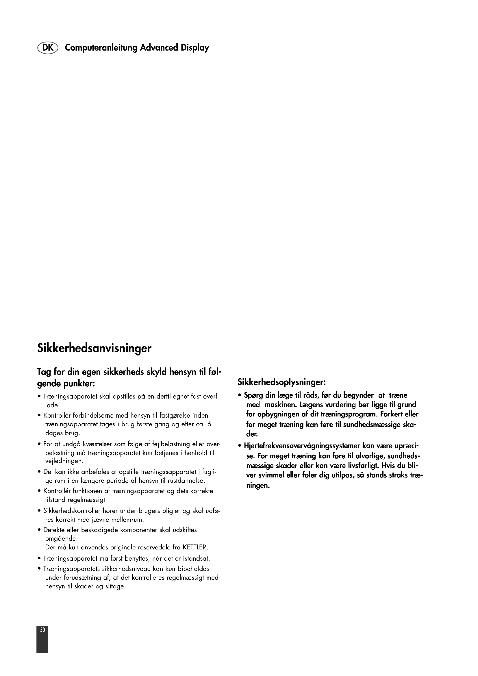 - Hjertefrekvensovervågningssystemer kan være upræci- se. For meget træning kan føre til alvorlige, sundheds- mæssige skader eller kan være livsfarligt. Hvis du bli- ver svimmel eller føler dig utilpas, så stands straks træ- ningen.51