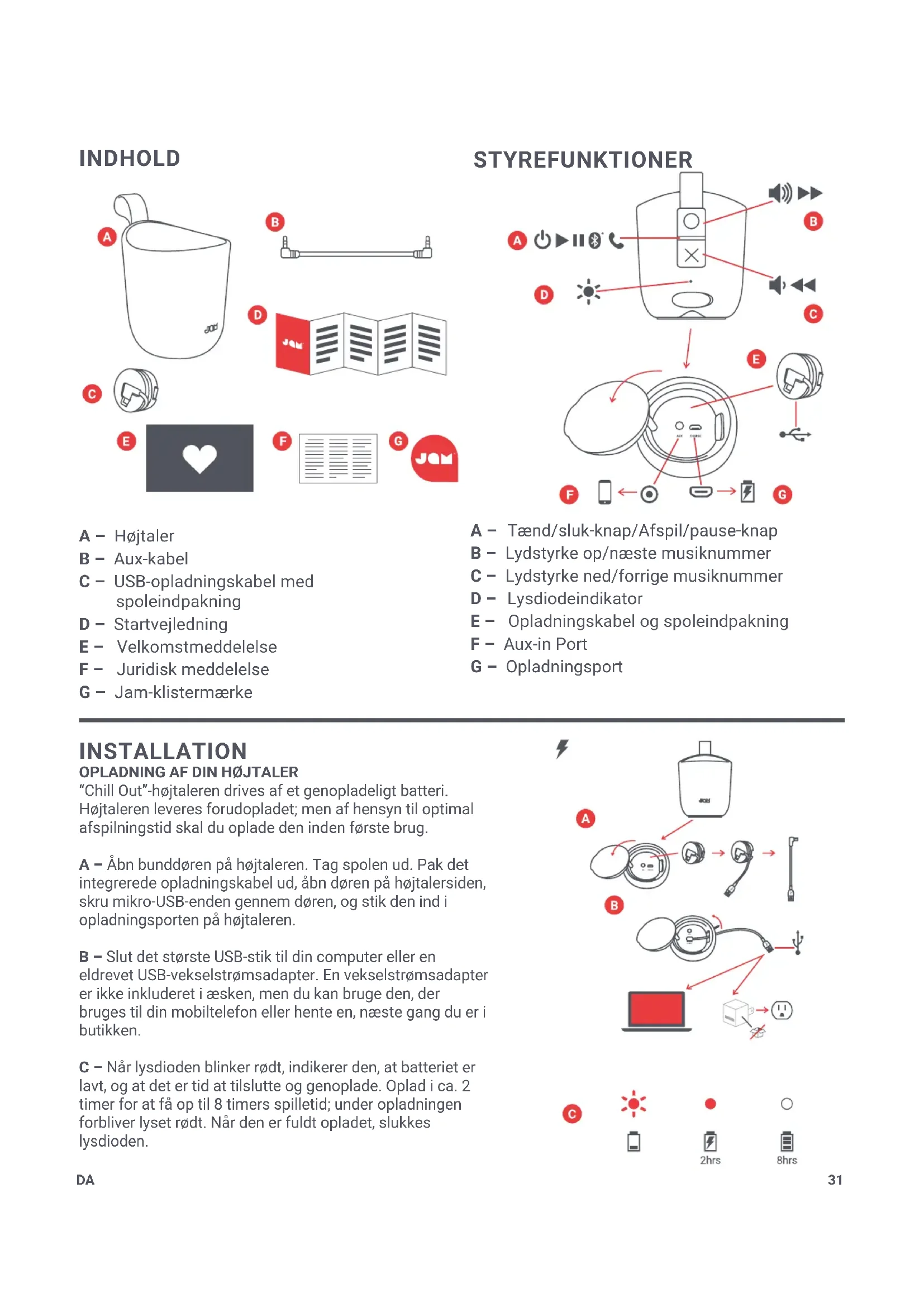 “Chill Out”-højtaleren drives af et genopladeligt batteri. Højtaleren leveres forudopladet; men af hensyn til optimal afspilningstid skal du oplade den inden første brug. A – Åbn bunddøren på højtaleren. Tag spolen ud. Pak det integrerede opladningskabel ud, åbn døren på højtalersiden, skru mikro-USB-enden gennem døren, og stik den ind i opladningsporten på højtaleren. B – Slut det største USB-stik til din computer eller en eldrevet USB-vekselstrømsadapter. En vekselstrømsadapter er ikke inkluderet i æsken, men du kan bruge den, der bruges til din mobiltelefon eller hente en, næste gang du er i butikken. C – Når lysdioden blinker rødt, indikerer den, at batteriet er lavt, og at det er tid at tilslutte og genoplade. Oplad i ca. 2 timer for at få op til 8 timers spilletid; under opladningen forbliver lyset rødt. Når den er fuldt opladet, slukkes lysdioden. DA32 BRUG