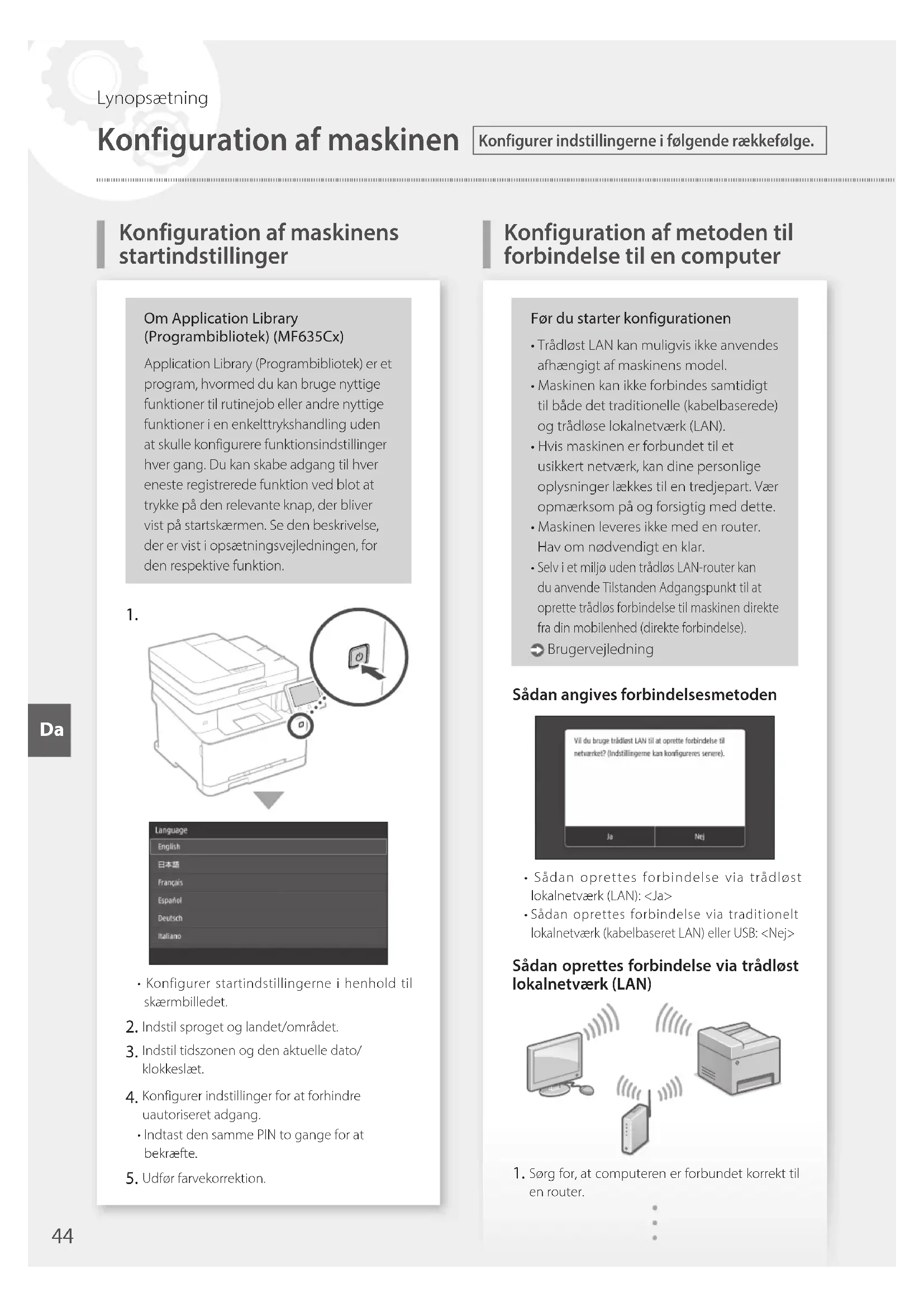 - Konfigurer startindstillingerne i henhold til skærmbilledet. Indstil sproget og landet/området. Indstil tidszonen og den aktuelle dato/klokkeslæt. Konfigurer indstillinger for at forhindre uautoriseret adgang.• Indtast den samme PIN to gange for at bekræfte. Udfør farvekorrektion.Før du starter konfigurationen• Trådløst LAN kan muligvis ikke anvendes afhængigt af maskinens model.• Maskinen kan ikke forbindes samtidigt til både det traditionelle (kabelbaserede) og trådløse lokalnetværk (LAN).• Hvis maskinen er forbundet til et usikkert netværk, kan dine personlige oplysninger lækkes til en tredjepart. Vær opmærksom på og forsigtig med dette.• Maskinen leveres ikke med en router. Hav om nødvendigt en klar. Selv i et miljø uden trådløs LAN-router kan du anvende Tilstanden Adgangspunkt til at oprette trådløs forbindelse til maskinen direkte fra din mobilenhed (direkte forbindelse). Brugervejledning Sådan angives forbindelsesmetoden