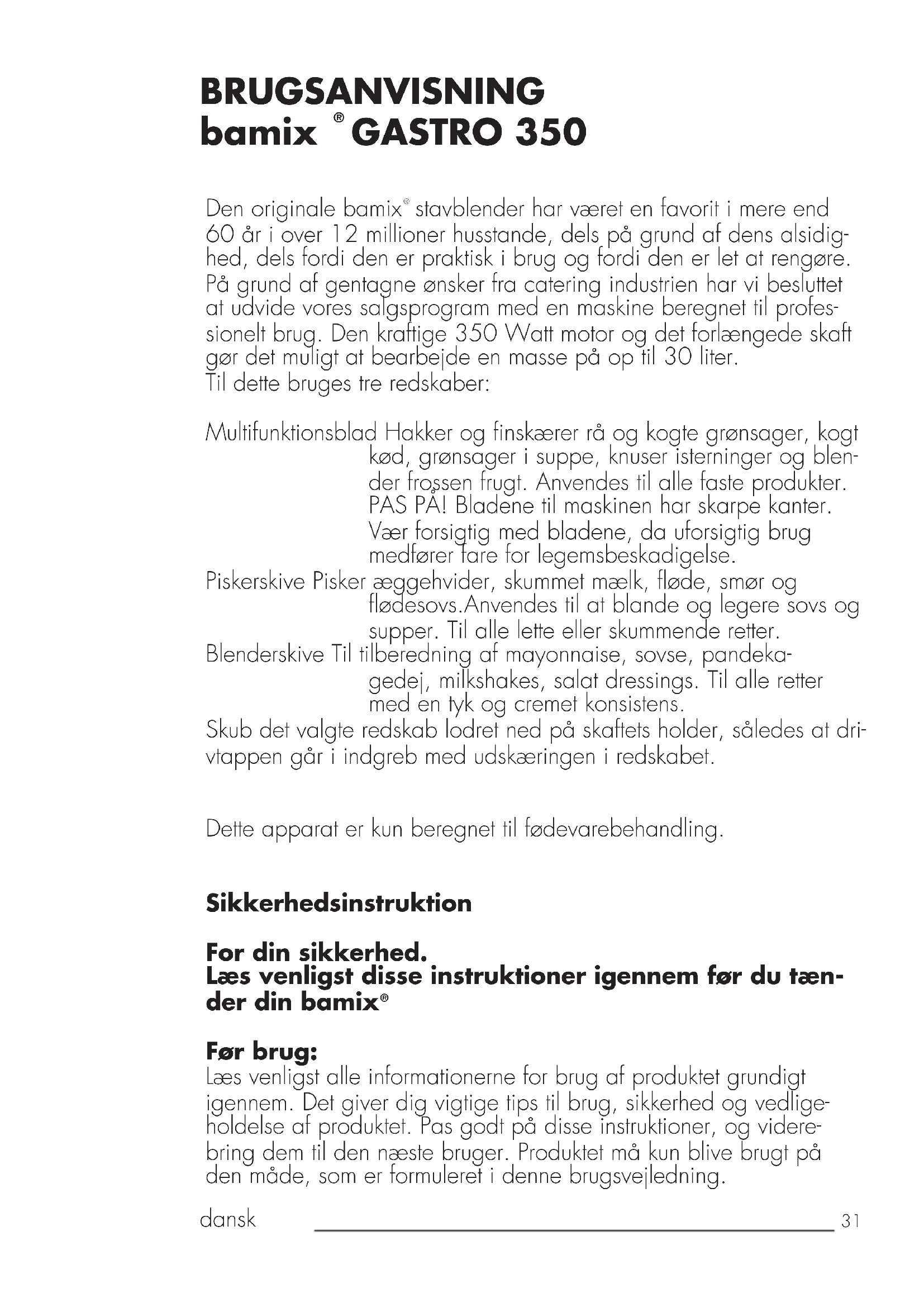 GASTRO 350 – Apparatet må kun blive tilsluttet stikkontakter med det antal volt, som er stemplet på identifikationspladen på produktet. – Et elektronisk produkt er ikke legetøj for børn. Børn er ikke opmærksomme på den fare der kan opstå ved brug af elektriske apparater. Så hold den derfor uden for børns rækkevidde,både ved brug og opbevaring. – Læg ikke produktet på varme overflader eller tæt på åben ild, for at være sikker på at indkapslingen ikke begynder at smelte. – Produktet må kun blive nedsænket indtil starten på håndtaget. – Rengør ikke produktet i opvaskevand. – Sluk for strømmen til apparatet – eller endnu bedre – træk stikket ud når du arbejder i enden omkring rotorafskærmningen, eksem- pelvis når du rengør apparatet under rindende vand eller når du skifter blade og knive. – Tænd kun for apparatet når mixerdelen er nede i beholderen med dine ingredienser. – Apparatet er forsynet med en sikkerhedskontakt, der forhindrer at den bliver sat i drift ved en fejl og kontakten slår fra igen med det samme, når presset på kontakten er udløst. – Træk stikket ud efter brug og når noget går galt under brug. – Træk aldrig stikket ud med våde hænder. – Bær eller træk aldrig apparatet ved hjælp af ledningen. – Træk eller klem ikke ledningen over skarpe kanter. – Læg eller hæng ikke ledningen over varme genstande eller åben ild og beskyt den fra varme og olie. – Apparatet må ikke startes når:33 dansk – Apparatet, indkapslingen eller ledningen er beskadiget. – Du forventer at den er gået itu efter at være tabt, eller en lignende ulykke er sket. – I disse tilfælde skal apparatet sendes tilbage til vores repara- tionsservice. – Reparationer må kun blive udført af vores kvalificerede service- center. En anselig fare kan opstå for brugeren, ved reparationer udført af uautoriserede personer. – Hvis apparatet er brugt i andre henseender end det er menin- gen, hvis det er urigtig brugt eller repareret af ukvalificerede per- soner, kan vi ikke tage ansvar for de skader der vil opstå.I et sådant tilfælde vil garantien ophøre. – En eventuel bortskaffelse af produktet, skal ske i henhold til reg- lerne for din bopæl. Der tages forbehold for tekniske ændringer samt afvigelser i anven- delseslandet. Således anvendes bamix
