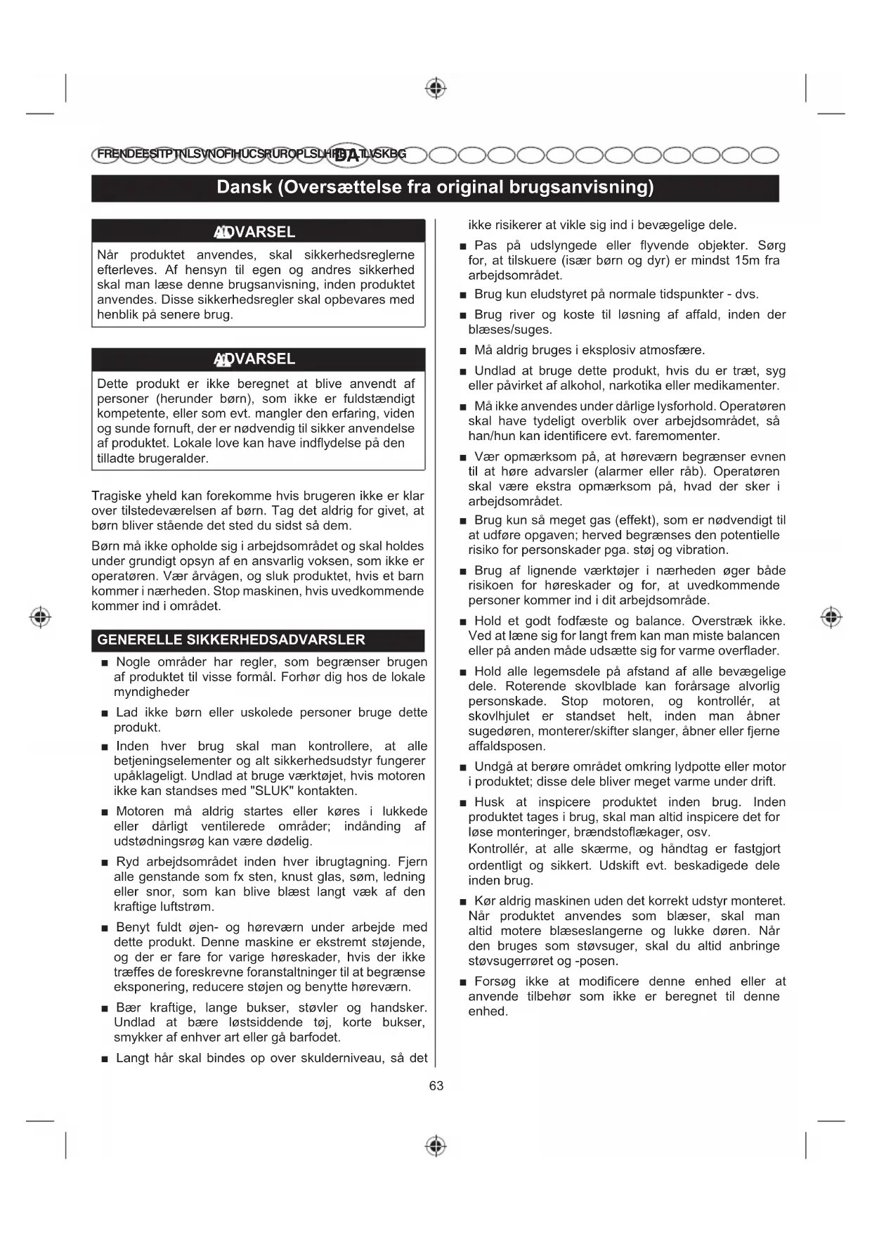 FR EN DE ES IT PT NL SV NO FI HU CS RU RO PL SL HR ET LT LV SK BG ADVARSEL Når produktet anvendes, skal sikkerhedsreglerne efterleves. Af hensyn til egen og andres sikkerhed skal man læse denne brugsanvisning, inden produktet anvendes. Disse sikkerhedsregler skal opbevares med henblik på senere brug. ADVARSEL Dette produkt er ikke beregnet at blive anvendt af personer (herunder børn), som ikke er fuldstændigt kompetente, eller som evt. mangler den erfaring, viden og sunde fornuft, der er nødvendig til sikker anvendelse DISURGXNWHW/RNDOHORYHNDQKDYHLQGÀ\GHOVHSnGHQ tilladte brugeralder. Tragiske yheld kan forekomme hvis brugeren ikke er klar over tilstedeværelsen af børn. Tag det aldrig for givet, at børn bliver stående det sted du sidst så dem. Børn må ikke opholde sig i arbejdsområdet og skal holdes under grundigt opsyn af en ansvarlig voksen, som ikke er operatøren. Vær årvågen, og sluk produktet, hvis et barn kommer i nærheden. Stop maskinen, hvis uvedkommende kommer ind i området. GENERELLE SIKKERHEDSADVARSLER Ŷ Nogle områder har regler, som begrænser brugen af produktet til visse formål. Forhør dig hos de lokale myndigheder Ŷ Lad ikke børn eller uskolede personer bruge dette produkt. Ŷ Inden hver brug skal man kontrollere, at alle betjeningselementer og alt sikkerhedsudstyr fungerer upåklageligt. Undlad at bruge værktøjet, hvis motoren ikke kan standses med "SLUK" kontakten. Ŷ Motoren må aldrig startes eller køres i lukkede eller dårligt ventilerede områder; indånding af udstødningsrøg kan være dødelig. Ŷ Ryd arbejdsområdet inden hver ibrugtagning. Fjern alle genstande som fx sten, knust glas, søm, ledning eller snor, som kan blive blæst langt væk af den kraftige luftstrøm. Ŷ Benyt fuldt øjen- og høreværn under arbejde med dette produkt. Denne maskine er ekstremt støjende, og der er fare for varige høreskader, hvis der ikke træffes de foreskrevne foranstaltninger til at begrænse eksponering, reducere støjen og benytte høreværn. Ŷ Bær kraftige, lange bukser, støvler og handsker. Undlad at bære løstsiddende tøj, korte bukser, smykker af enhver art eller gå barfodet. Ŷ Langt hår skal bindes op over skulderniveau, så det ikke risikerer at vikle sig ind i bevægelige dele. Ŷ Pas på udslyngede eller flyvende objekter. Sørg for, at tilskuere (især børn og dyr) er mindst 15m fra arbejdsområdet. Ŷ Brug kun eludstyret på normale tidspunkter - dvs. Ŷ Brug river og koste til løsning af affald, inden der blæses/suges. Ŷ Må aldrig bruges i eksplosiv atmosfære. Ŷ Undlad at bruge dette produkt, hvis du er træt, syg eller påvirket af alkohol, narkotika eller medikamenter. Ŷ Må ikke anvendes under dårlige lysforhold. Operatøren skal have tydeligt overblik over arbejdsområdet, så han/hun kan identificere evt. faremomenter. Ŷ Vær opmærksom på, at høreværn begrænser evnen til at høre advarsler (alarmer eller råb). Operatøren skal være ekstra opmærksom på, hvad der sker i arbejdsområdet. Ŷ Brug kun så meget gas (effekt), som er nødvendigt til at udføre opgaven; herved begrænses den potentielle risiko for personskader pga. støj og vibration. Ŷ Brug af lignende værktøjer i nærheden øger både risikoen for høreskader og for, at uvedkommende personer kommer ind i dit arbejdsområde. Ŷ Hold et godt fodfæste og balance. Overstræk ikke. Ved at læne sig for langt frem kan man miste balancen eller på anden måde udsætte sig for varme overflader. Ŷ Hold alle legemsdele på afstand af alle bevægelige dele. Roterende skovlblade kan forårsage alvorlig personskade. Stop motoren, og kontrollér, at skovlhjulet er standset helt, inden man åbner sugedøren, monterer/skifter slanger, åbner eller fjerne affaldsposen. Ŷ Undgå at berøre området omkring lydpotte eller motor i produktet; disse dele bliver meget varme under drift. Ŷ Husk at inspicere produktet inden brug. Inden produktet tages i brug, skal man altid inspicere det for løse monteringer, brændstoflækager, osv. Kontrollér, at alle skærme, og håndtag er fastgjort ordentligt og sikkert. Udskift evt. beskadigede dele inden brug. Ŷ Kør aldrig maskinen uden det korrekt udstyr monteret. Når produktet anvendes som blæser, skal man altid motere blæseslangerne og lukke døren. Når den bruges som støvsuger, skal du altid anbringe støvsugerrøret og -posen. Ŷ Forsøg ikke at modificere denne enhed eller at anvende tilbehør som ikke er beregnet til denne enhed.64 Dansk (Oversættelse fra original brugsanvisning)