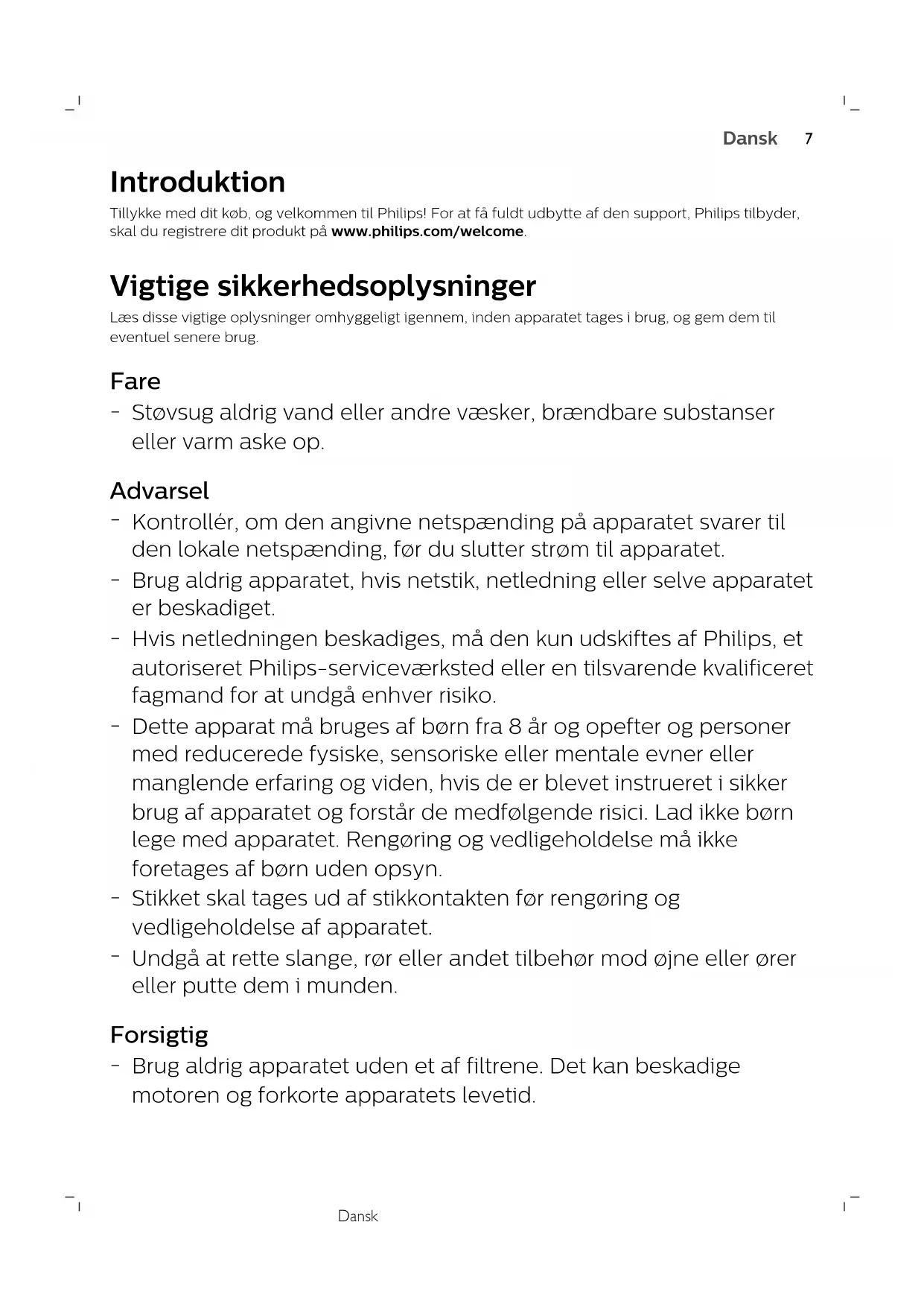 EnglishDansk Introduktion Tillykke med dit køb, og velkommen til Philips! For at få fuldt udbytte af den support, Philips tilbyder,skal du registrere dit produkt på www.philips.com/welcome. Vigtige sikkerhedsoplysninger Læs disse vigtige oplysninger omhyggeligt igennem, inden apparatet tages i brug, og gem dem tileventuel senere brug. Fare