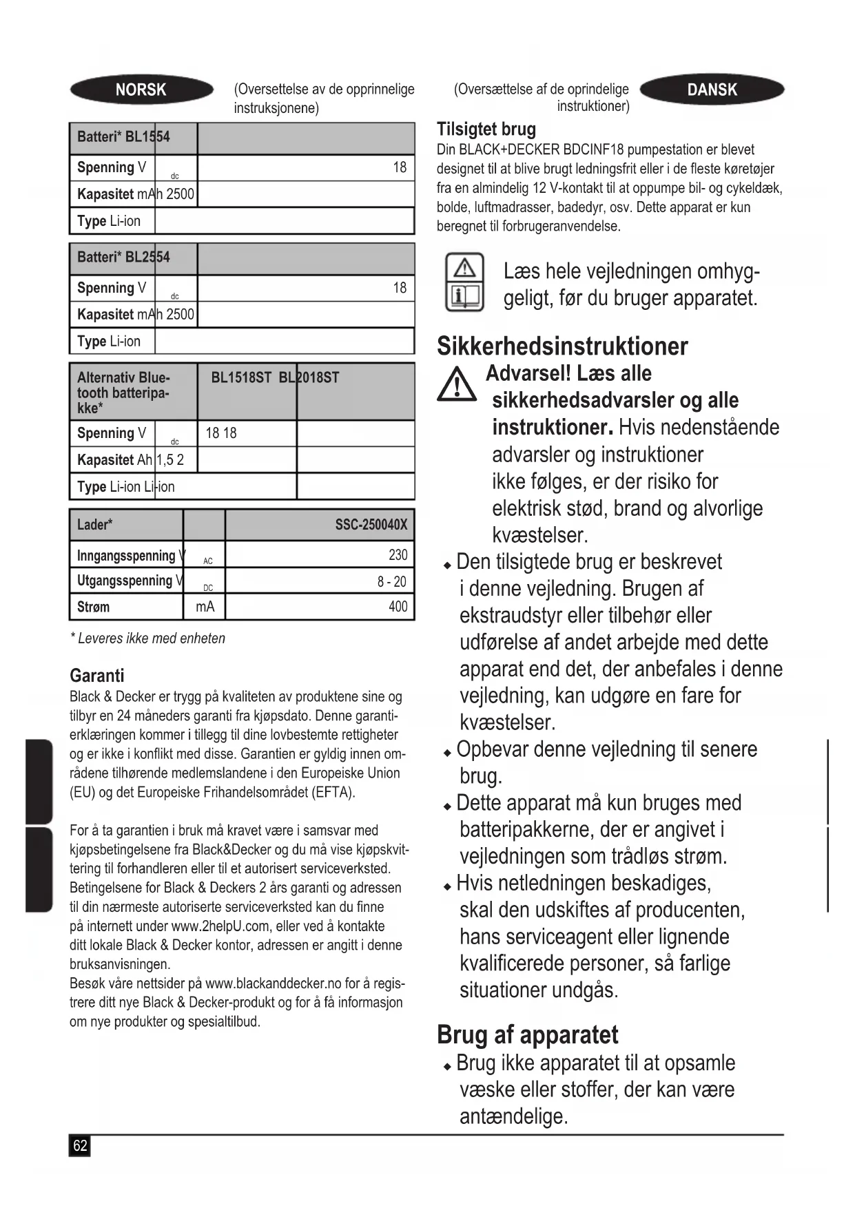 - Leveres ikke med enheden Garanti Black & Decker er overbevist om den gode kvalitet af sine produkter og giver forbrugerne en garanti på 24 måneder fra købsdatoen. Garantien er et tillæg til forbrugerens lovmæs-sige rettigheder og påvirker ikke disse. Garantien er gyldig inden for medlemsstaterne af Den Europæiske Union og Det Europæiske Frihandelsområde.Når du gør krav på garantien, skal kravet være i overens-stemmelse med Black & Decker vilkår og betingelser, og du skal indsende dokumentation for købet til sælgeren eller til en autoriseret reparatør. Vilkår og betingelser for Black & Decker 2 års garanti og placeringen af dit nærmeste autoriserede serviceværksted kan fås på internettet på www.2helpU.com, eller ved at kontakte dit lokale Black & Decker kontor på den adresse, der er angivet i denne vejledning.Besøg venligst vores websted www.blackanddecker.co.uk for at registrere dit nye Black & Decker produkt og modtage opdateringer om nye produkter og specielle tilbud. Käyttötarkoitus BLACK+DECKER BDCINF18 -täyttöasema on tarkoitettu käytettäväksi langattomasti tai useimmissa ajoneuvoissa käyt-täen standardia 12 V pistoketta auton tai pyörän renkaiden, pallojen, kumilauttojen, ilmapatjojen, uima-altaan kellukkeiden jne. täyttämiseen. Tämä laite on tarkoitettu vain kuluttajien käyttöön. Lue nämä ohjeet huolellisesti ennen laitteen käyttöä. Turvallisuusohjeet