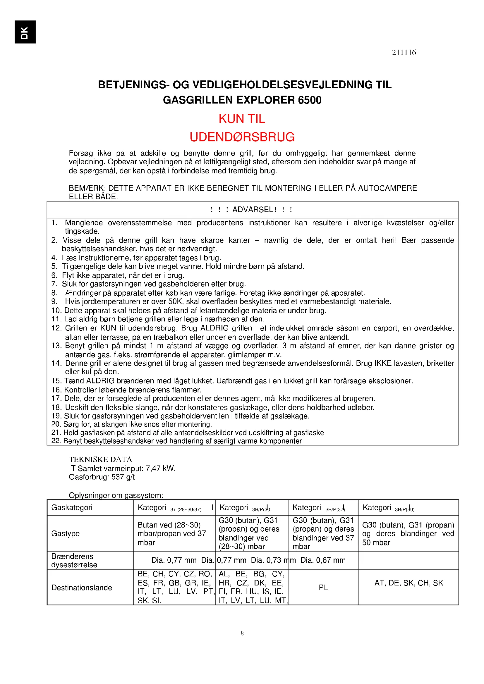 GASGRILLEN EXPLORER 6500 KUN TIL UDENDØRSBRUG Forsøg ikke på at adskille og benytte denne grill, før du omhyggeligt har gennemlæst denne vejledning. Opbevar vejledningen på et lettilgængeligt sted, eftersom den indeholder svar på mange af de spørgsmål, der kan opstå i forbindelse med fremtidig brug. BEMÆRK: DETTE APPARAT ER IKKE BEREGNET TIL MONTERING I ELLER PÅ AUTOCAMPERE ELLER BÅDE. !!!ADVARSEL!!!