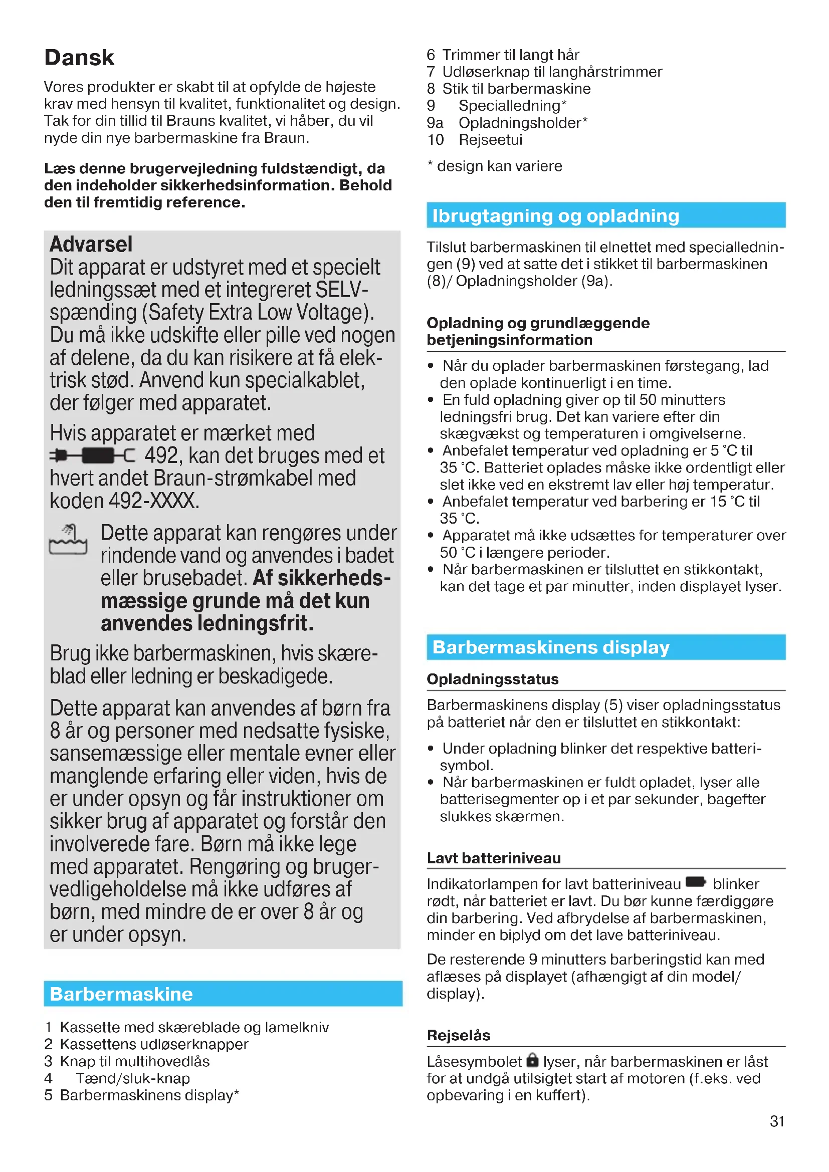 cassette. Scheerapparaat gaat uit bij een volledig opgeladen batterij. Scheerblad en snijmesjes zijn versleten, wat meer energie vraagt bij elke scheerbeurt. – Vervang het scheerblad & de messenblok cassette. – Smeer het scheersysteem regelmatig met olie, vooral wanneer het met enkel water wordt gereinigd. 91154595_Series_9-2_Solo_Euro_S6-96.indd 30 28.11.16 13:0931 Dansk Vores produkter er skabt til at opfylde de højeste krav med hensyn til kvalitet, funktionalitet og design. Tak for din tillid til Brauns kvalitet, vi håber, du vil nyde din nye barbermaskine fra Braun. Læs denne brugervejledning fuldstændigt, da den indeholder sikkerhedsinformation. Behold den til fremtidig reference. Advarsel Dit apparat er udstyret med et specielt ledningssæt med et integreret SELV- spænding (Safety Extra Low Voltage). Du må ikke udskifte eller pille ved nogen af delene, da du kan risikere at få elek- trisk stød. Anvend kun specialkablet, der følger med apparatet. Hvis apparatet er mærket med 492, kan det bruges med et hvert andet Braun-strømkabel med koden 492-XXXX. Dette apparat kan rengøres under rindende vand og anvendes i badet eller brusebadet. Af sikkerheds- mæssige grunde må det kun anvendes ledningsfrit. Brug ikke barbermaskinen, hvis skære- blad eller ledning er beskadigede. Dette apparat kan anvendes af børn fra 8 år og personer med nedsatte fysiske, sansemæssige eller mentale evner eller manglende erfaring eller viden, hvis de er under opsyn og får instruktioner om sikker brug af apparatet og forstår den involverede fare. Børn må ikke lege med apparatet. Rengøring og bruger- vedligeholdelse må ikke udføres af børn, med mindre de er over 8 år og er under opsyn. Barbermaskine 1 Kassette med skæreblade og lamelkniv 2 Kassettens udløserknapper 3 Knap til multihovedlås 4 Tænd/sluk-knap 5 Barbermaskinens display* 6 Trimmer til langt hår 7 Udløserknap til langhårstrimmer 8 Stik til barbermaskine 9 Specialledning* 9a Opladningsholder* 10 Rejseetui